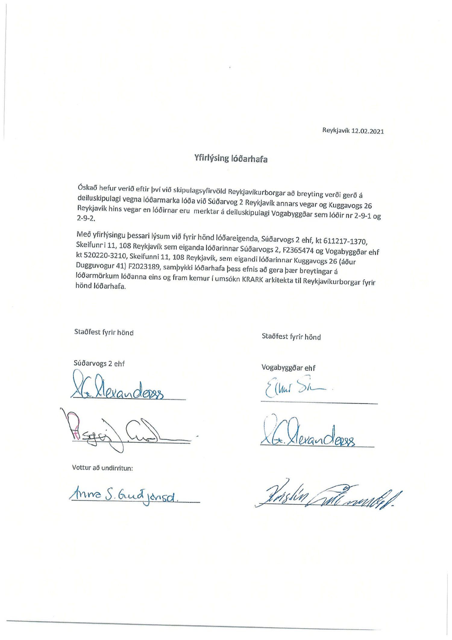 Lögð fram umsókn Kristins Ragnarssonar dags. 5. febrúar 2021 varðandi breytingu á deiliskipulagi Vogabyggðar svæði 2 vegna lóðanna 2-9-1 og 2-9-2. Í breytingunni felst að lóðarlína á milli lóðanna 2-9-1 og 2-9-2 færist um 10 cm. til norðurs auk þess að sem þríhyrningslaga horn bætist við. Lóð 2-9-1 minnkar um 19,7 m2 og lóð 2-9-2 stækkar sem því nemur, samkvæmt uppdr. Kristins Ragnarssonar arkit. ehf. dags. 5. febrúar 2021. Jafnframt er lögð fram yfirlýsing lóðarhafa dags. 12. febrúar 2021.
