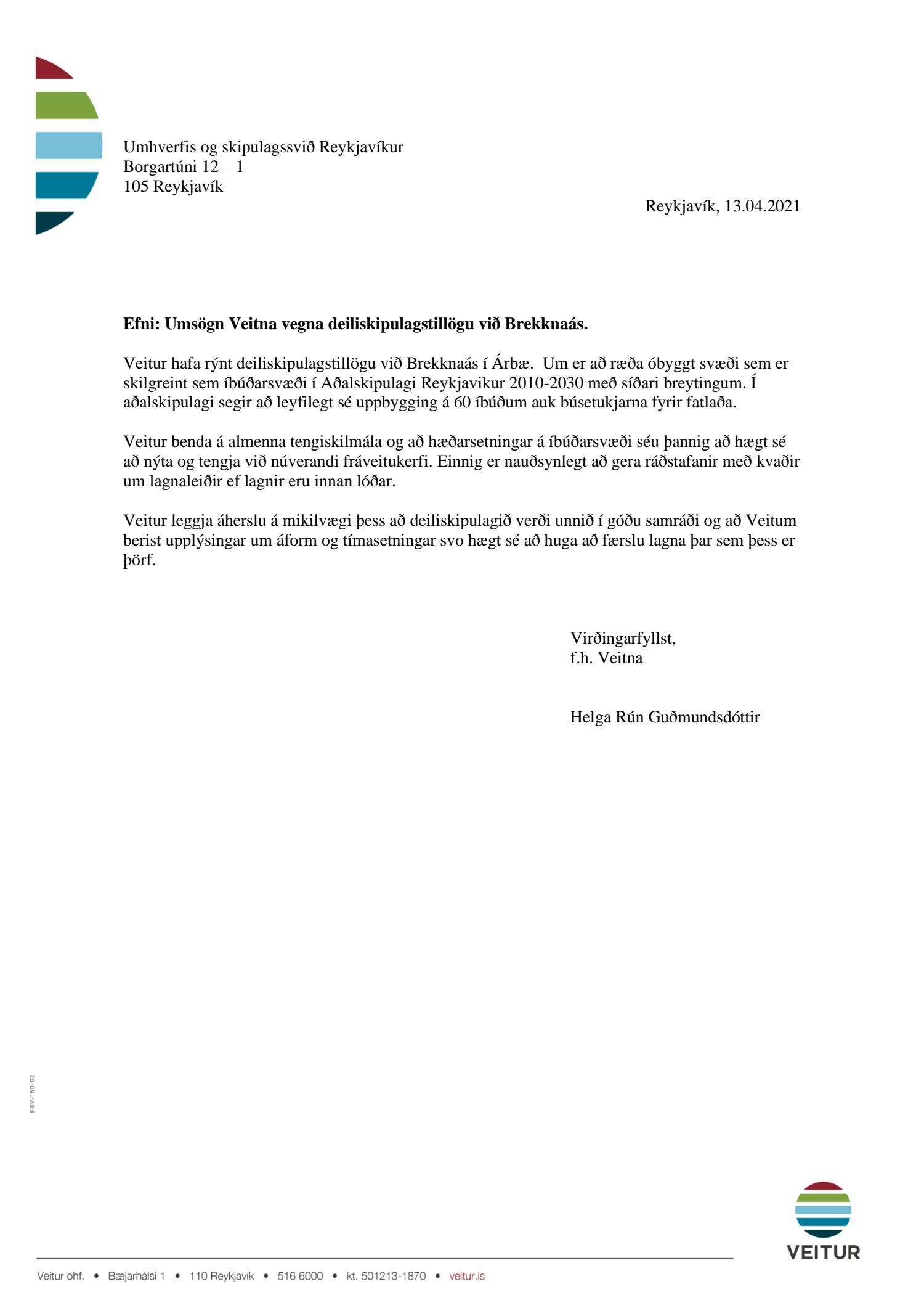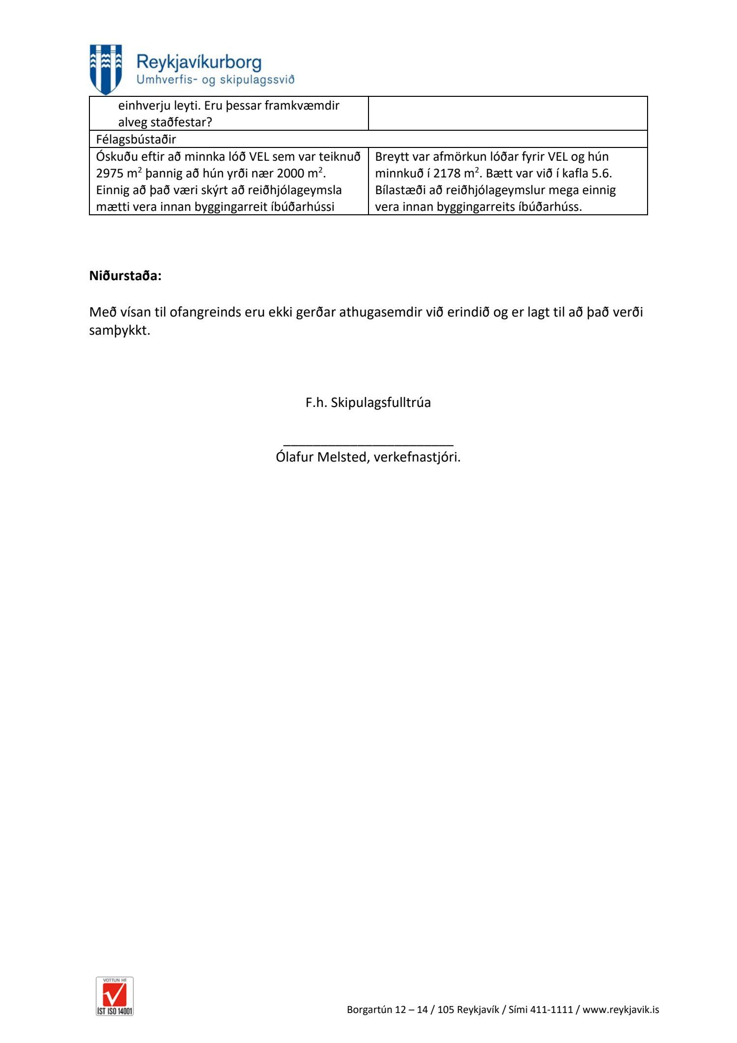 Í aðalskipulagi segir að leyfileg sé uppbygging á 60 íbúðum auk búsetukjarna fyrir fatlaða, samkvæmt uppdr. Landmótunar dags. 29. janúar 2021, br. 24. júní 2021. Tillagan var auglýst frá 2. mars 2021 til og með 13. apríl 2021. Eftirtaldir sendu athugasemdir/umsögn: Telma Dögg Óskarsdóttir dags. 20. mars 2021, Pálmi Jón Gíslason dags. 12. apríl 2021, Steinunn Þorleifsdóttir dags. 12. apríl 2021,