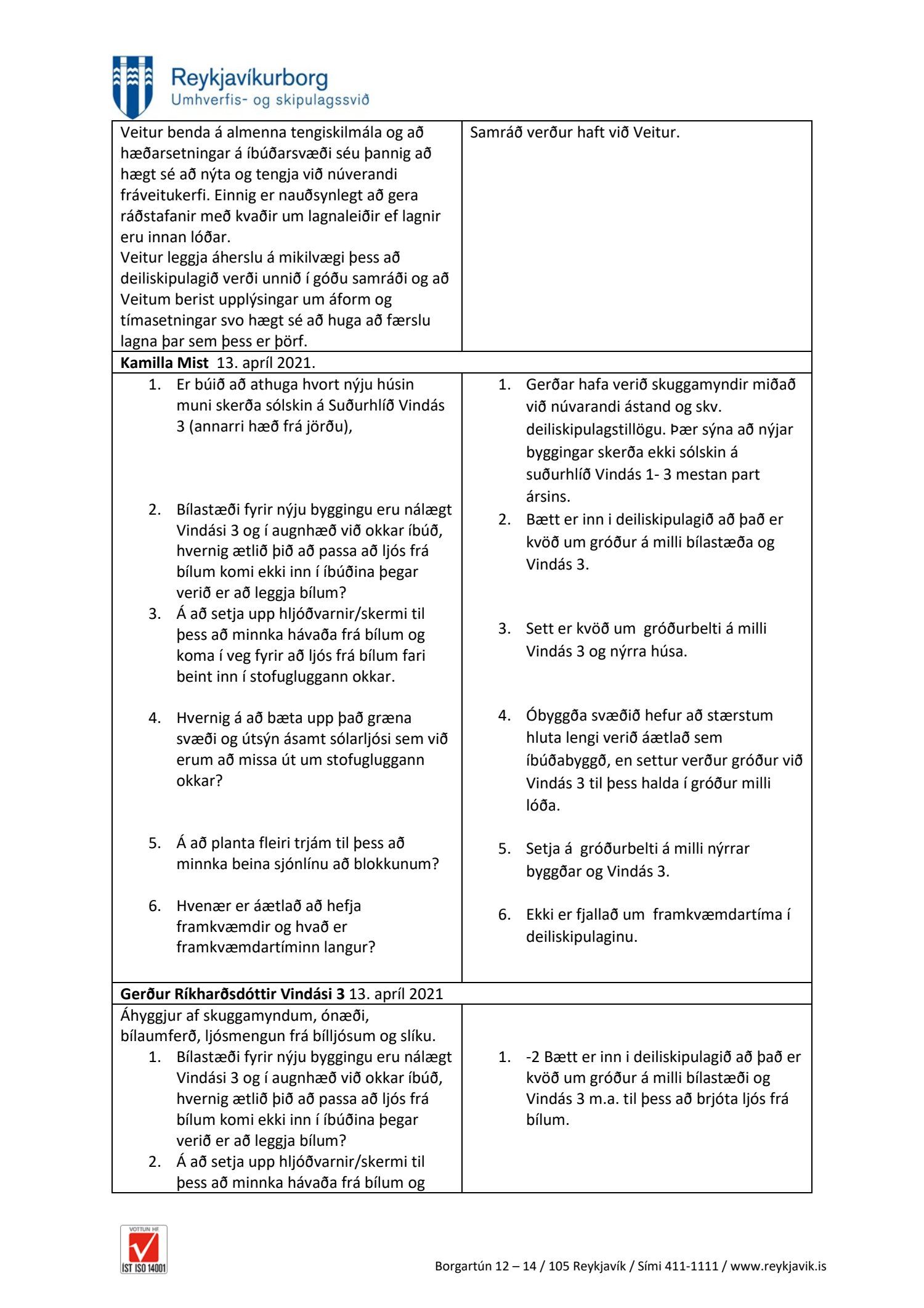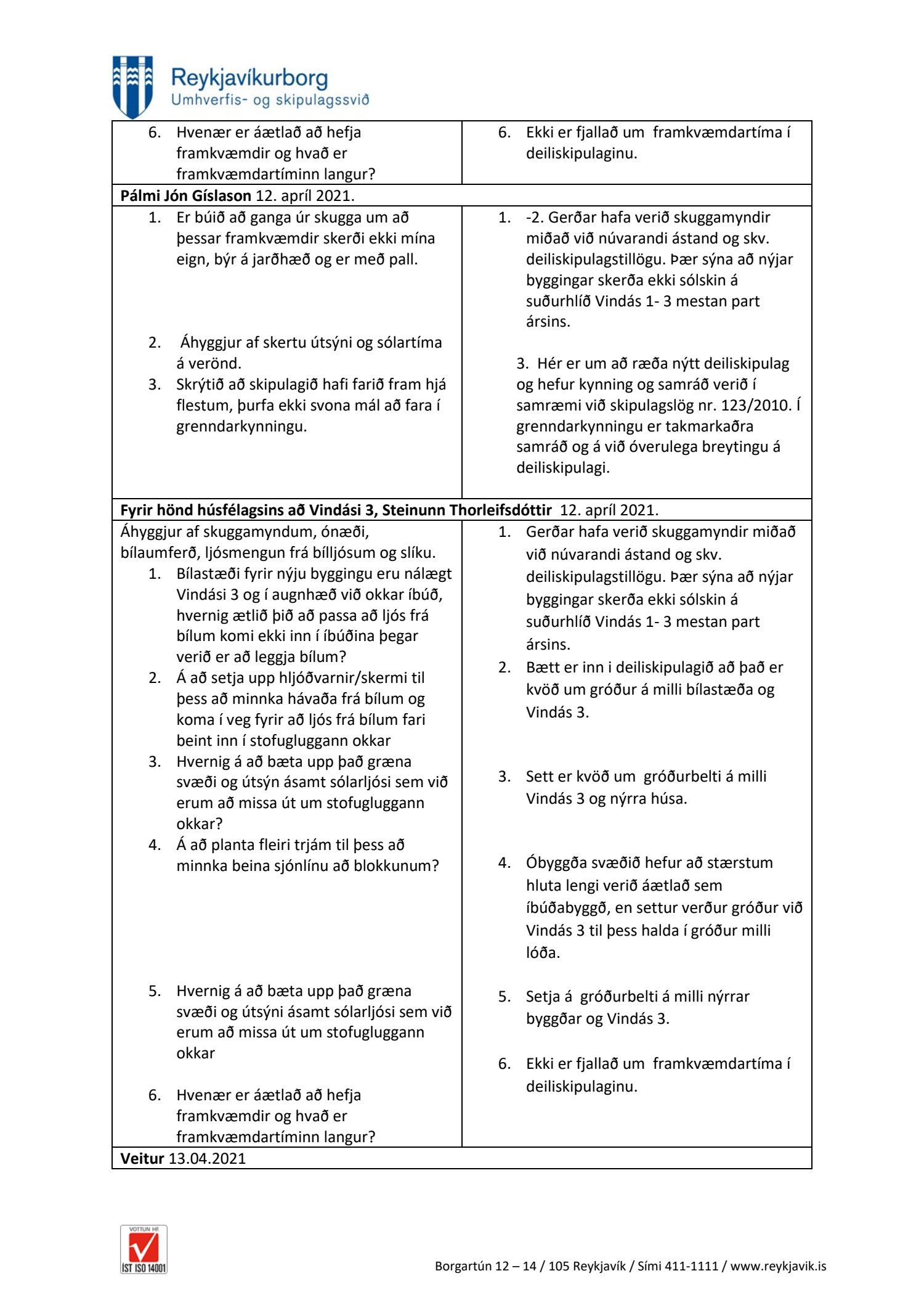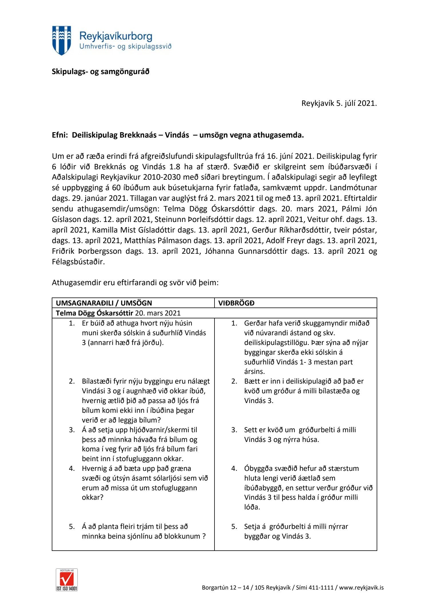 dags. 13. apríl 2021, Kamilla Mist Gísladóttir dags. 13. apríl 2021, Gerður Ríkharðsdóttir, tveir póstar, dags. 13. apríl 2021, Matthías Pálmason dags. 13. apríl 2021, Adolf Freyr dags. 13. apríl 2021, Friðrik Þorbergsson dags. 13. apríl 2021 og Jóhanna Gunnarsdóttir dags. 13. apríl 2021. Einnig er lögð fram umsögn skipulagsfulltrúa dags. 5. júlí 2021.