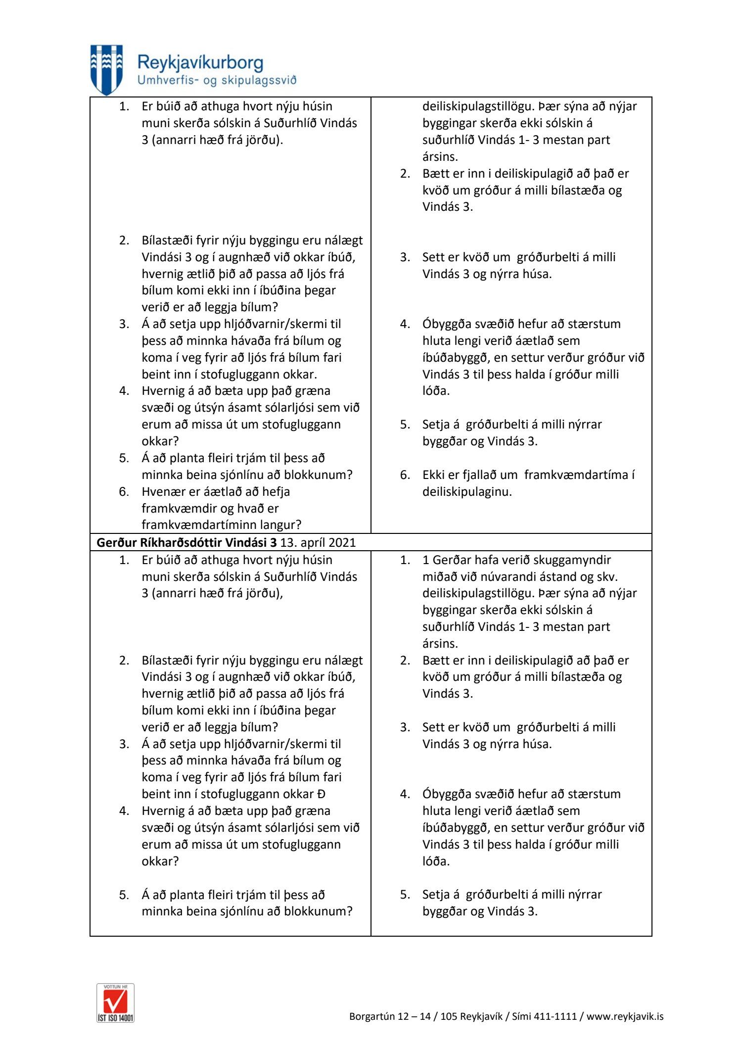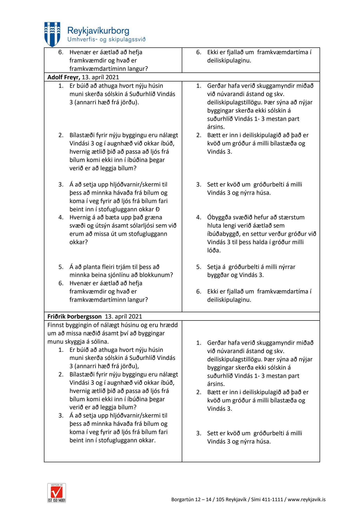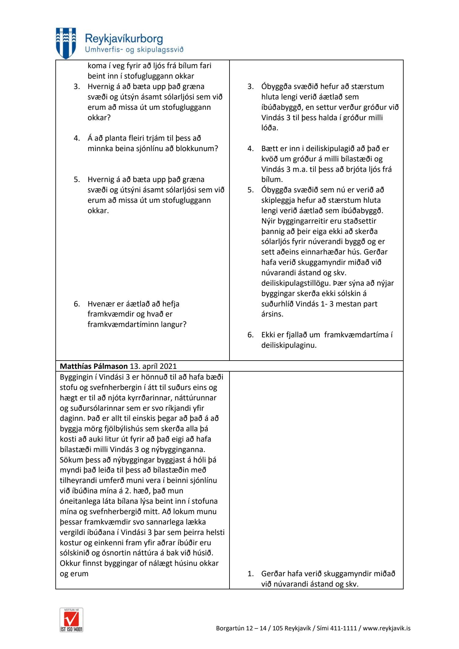dags. 13. apríl 2021, Kamilla Mist Gísladóttir dags. 13. apríl 2021, Gerður Ríkharðsdóttir, tveir póstar, dags. 13. apríl 2021, Matthías Pálmason dags. 13. apríl 2021, Adolf Freyr dags. 13. apríl 2021, Friðrik Þorbergsson dags. 13. apríl 2021 og Jóhanna Gunnarsdóttir dags. 13. apríl 2021. Einnig er lögð fram umsögn skipulagsfulltrúa dags. 5. júlí 2021.