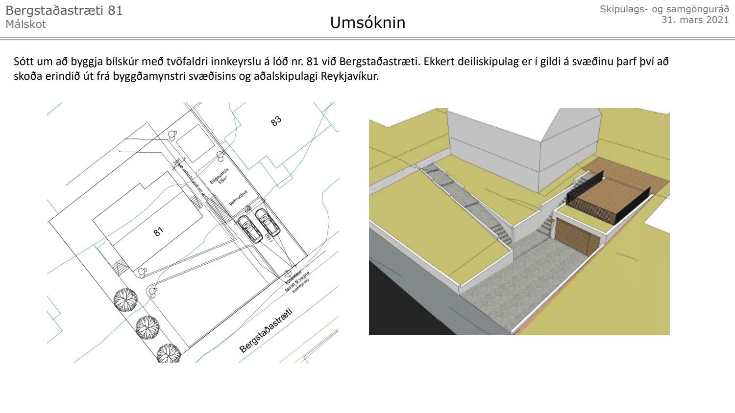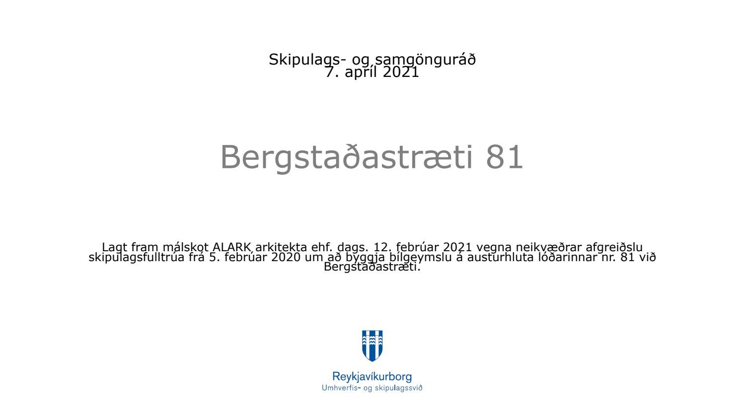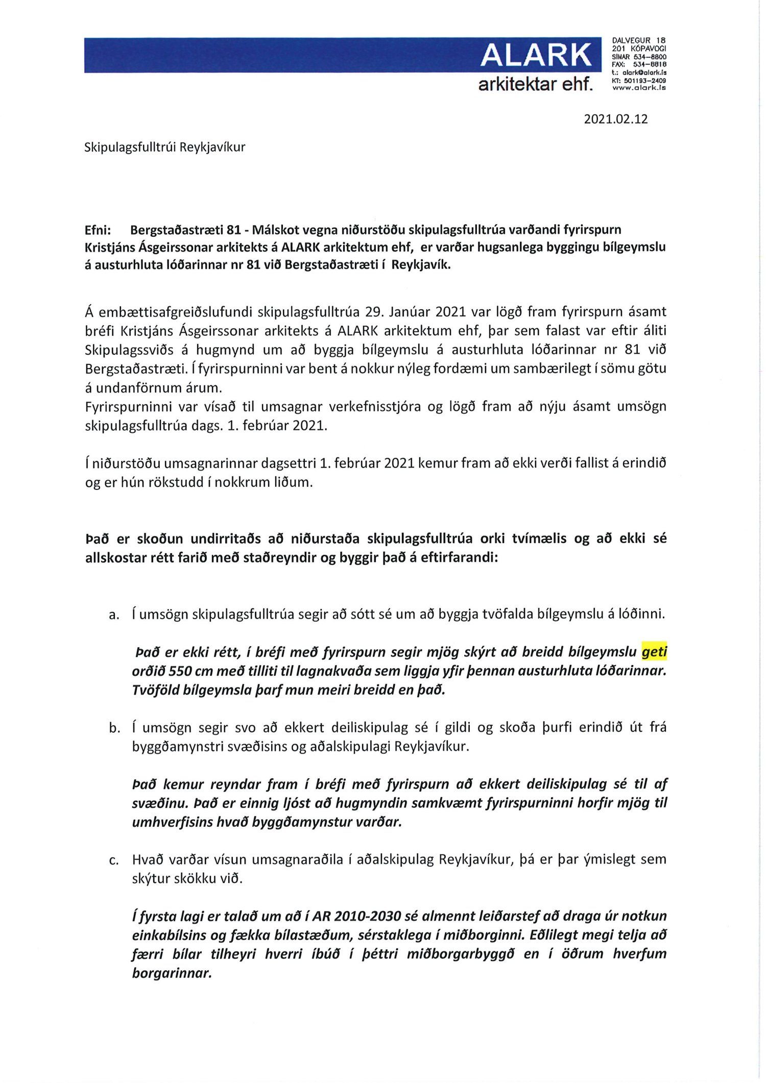 dags. 12. febrúar 2021 vegna neikvæðrar afgreiðslu skipulagsfulltrúa frá 5. febrúar 2020 um að byggja bílgeymslu á austurhluta lóðarinnar nr. 81 við Bergstaðastræti. Einnig er lögð fram umsögn skipulagsfulltrúa dags. 1. febrúar 2021.
