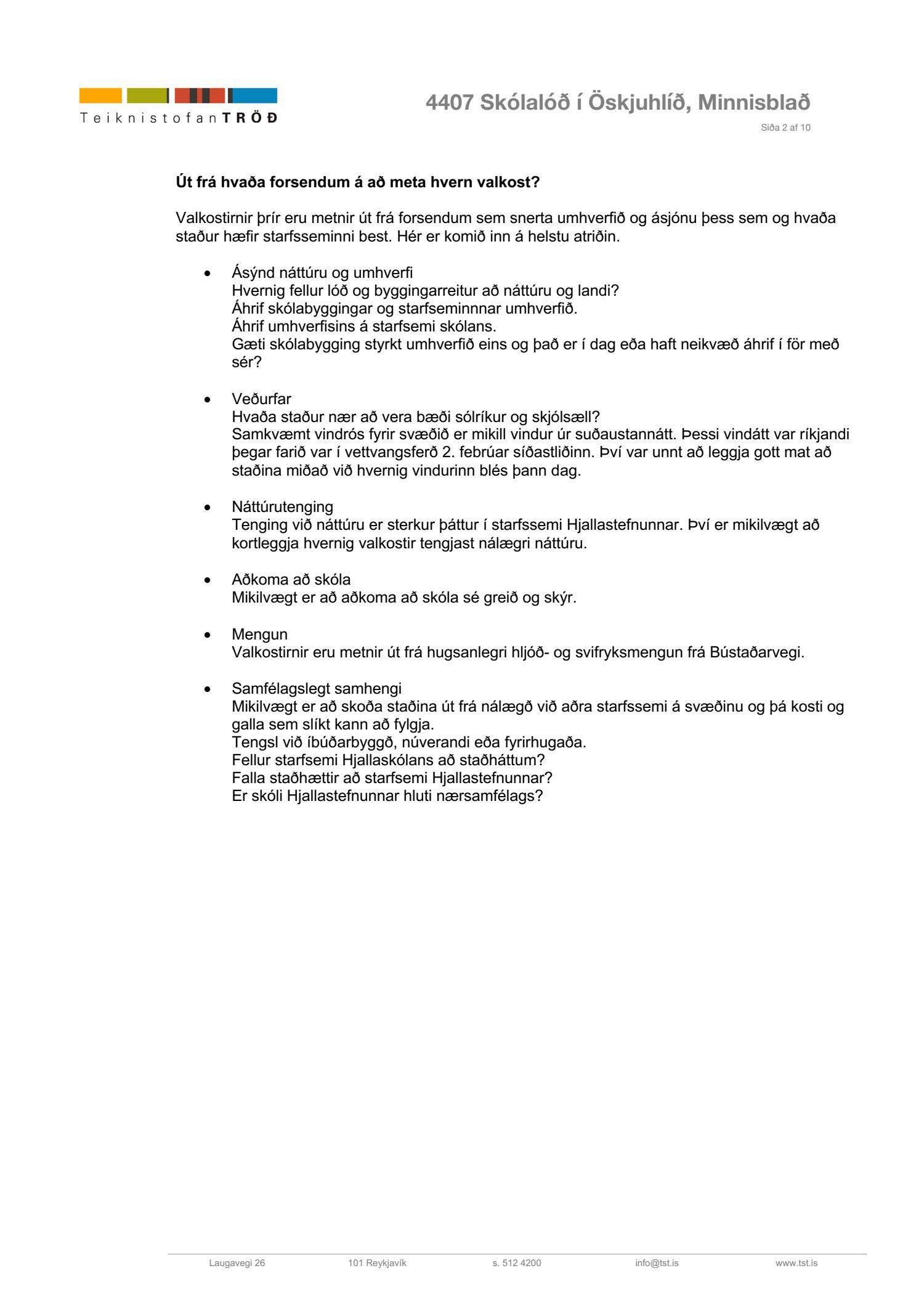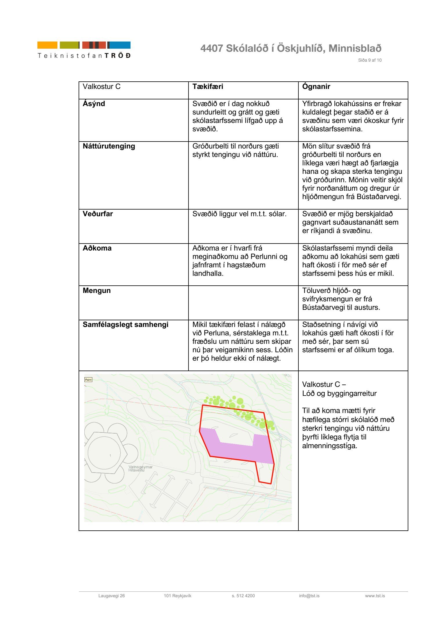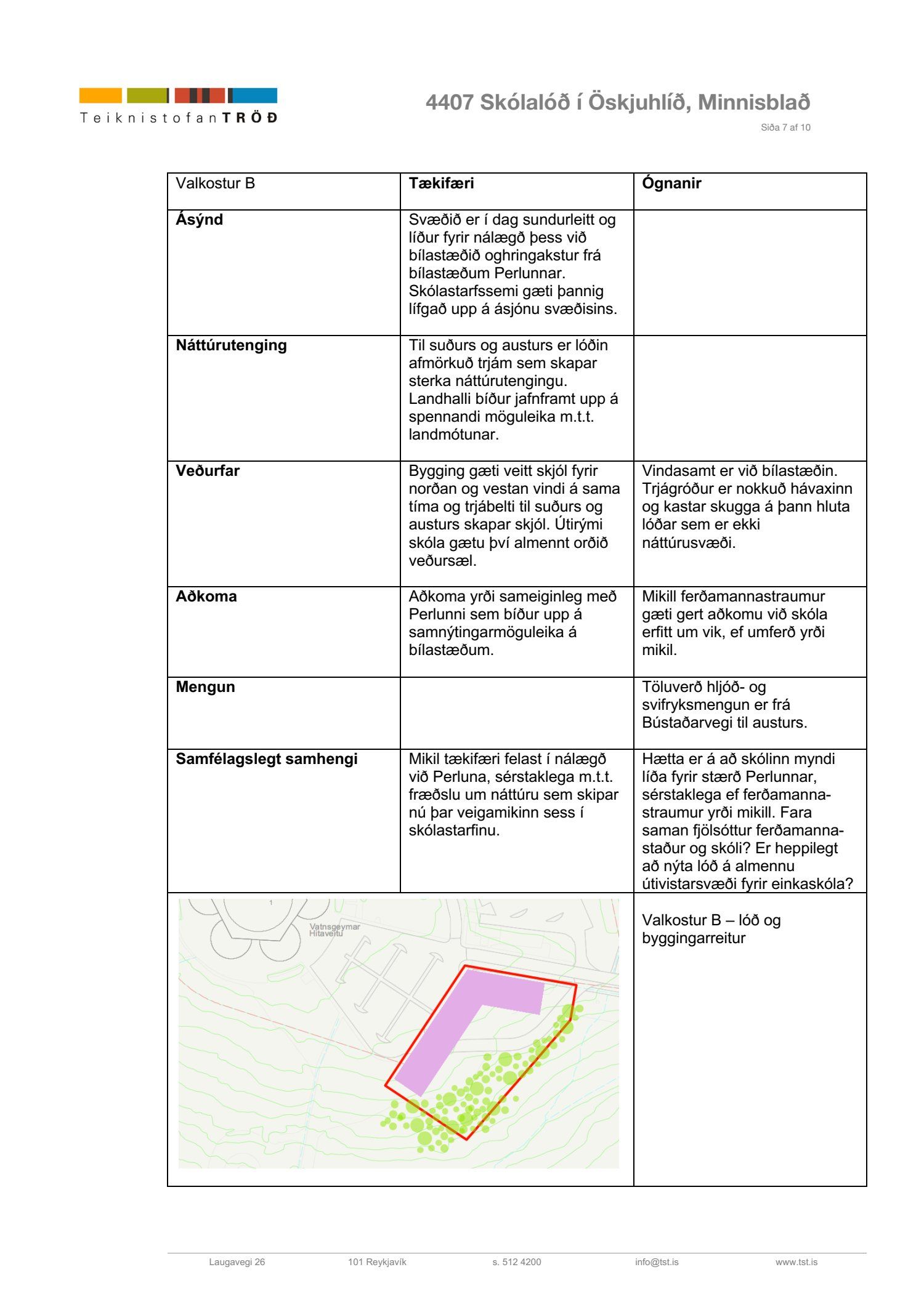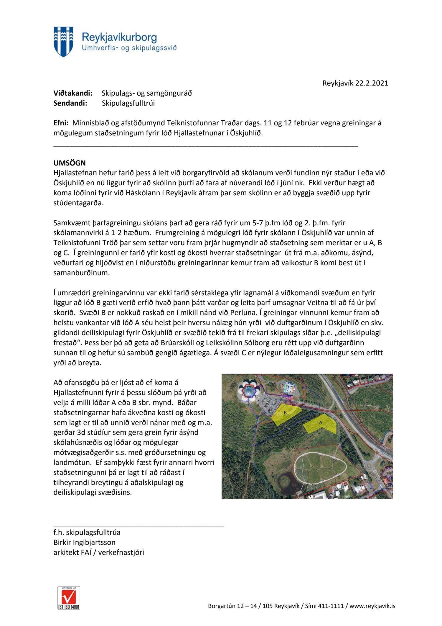 Lagt fram minnisblað Teiknistofunnar Traðar dags. 11. febrúar 2021 afstöðumynd dags. 12. febrúar 2021 vegna greiningar á staðarvali fyrir skólabyggingar á vegum Hjallastefnunnar í Öskjuhlíð. Einnig lögð fram umsögn skipulagsfulltrúa dags. 22. febrúar 2021.