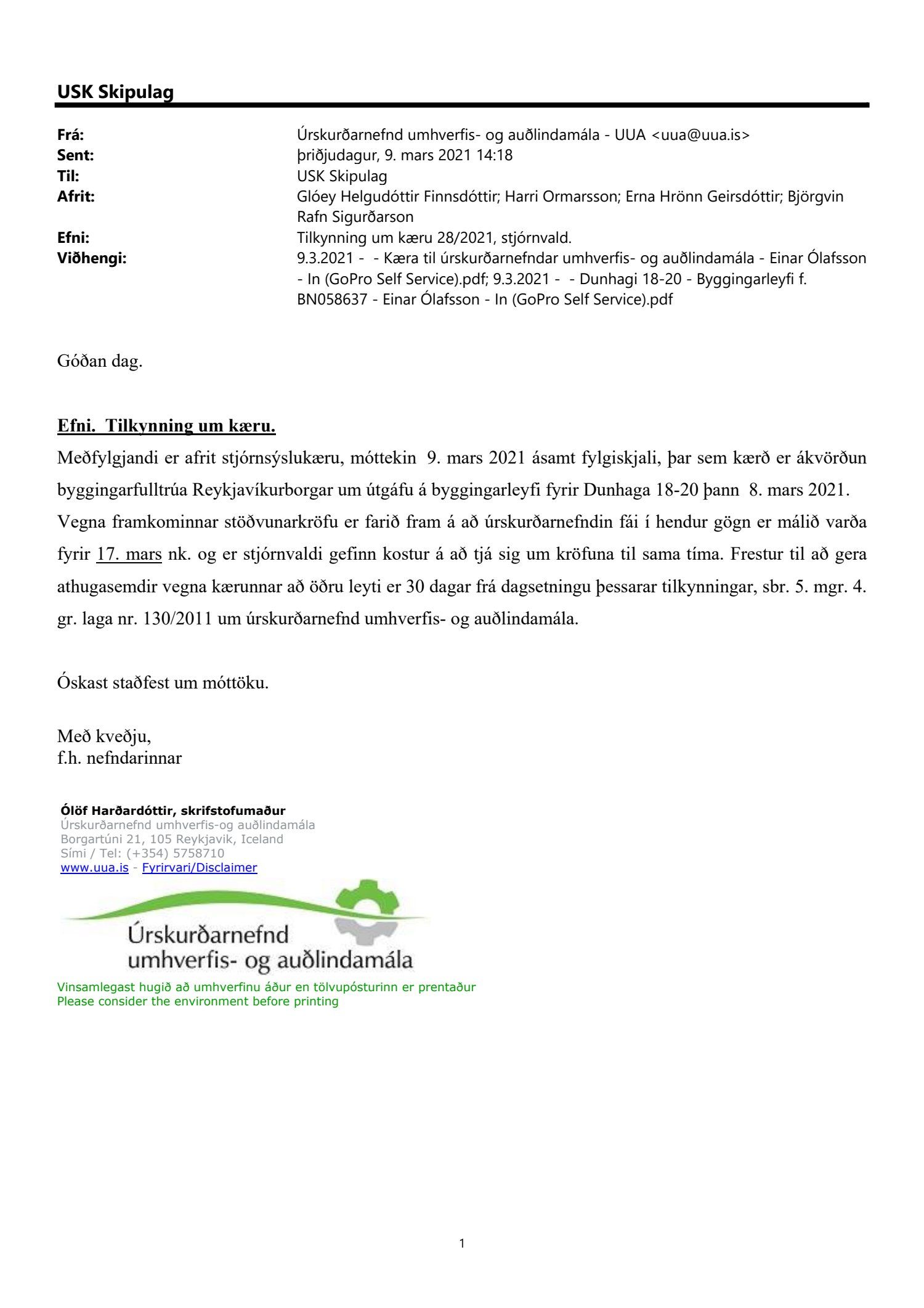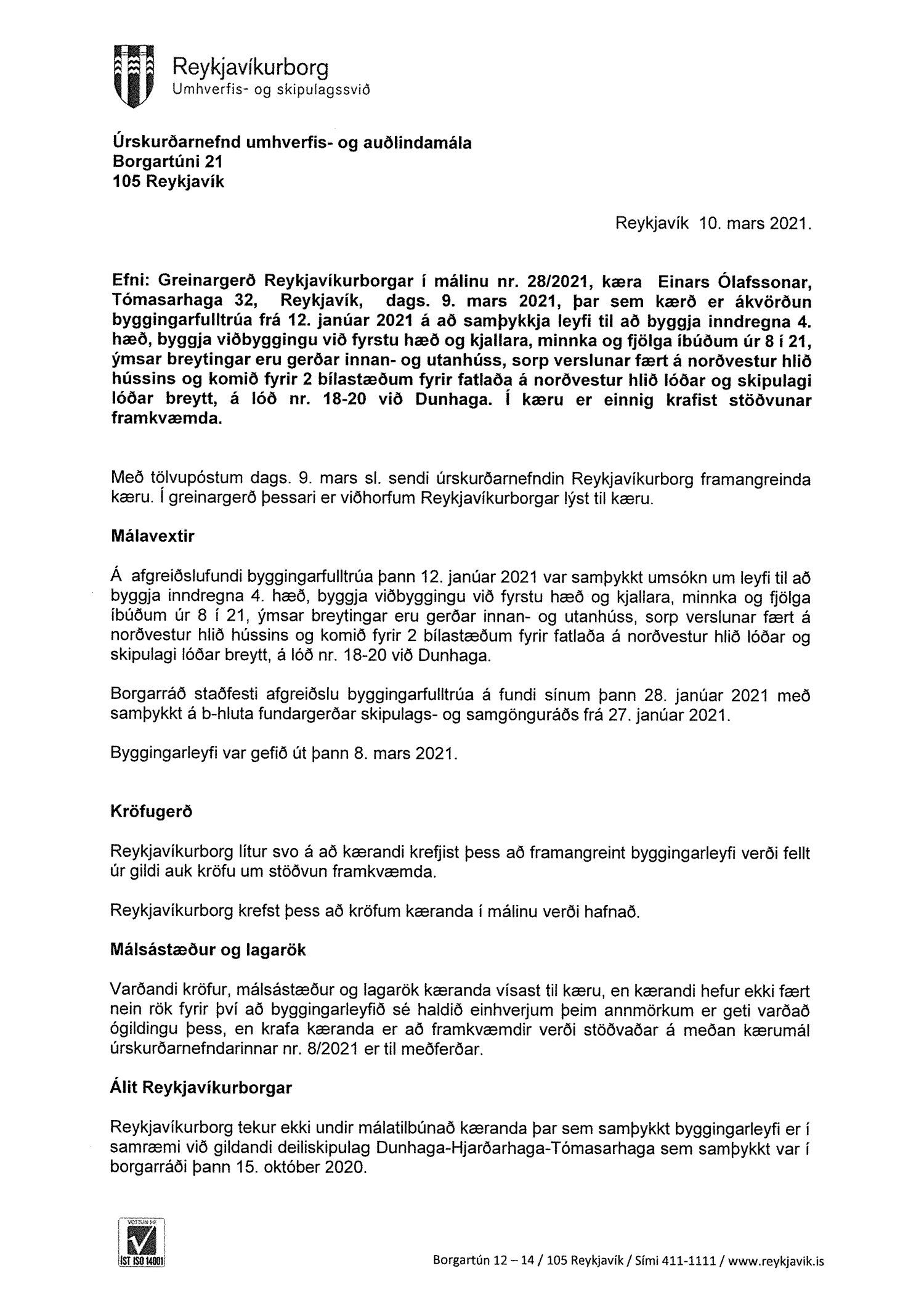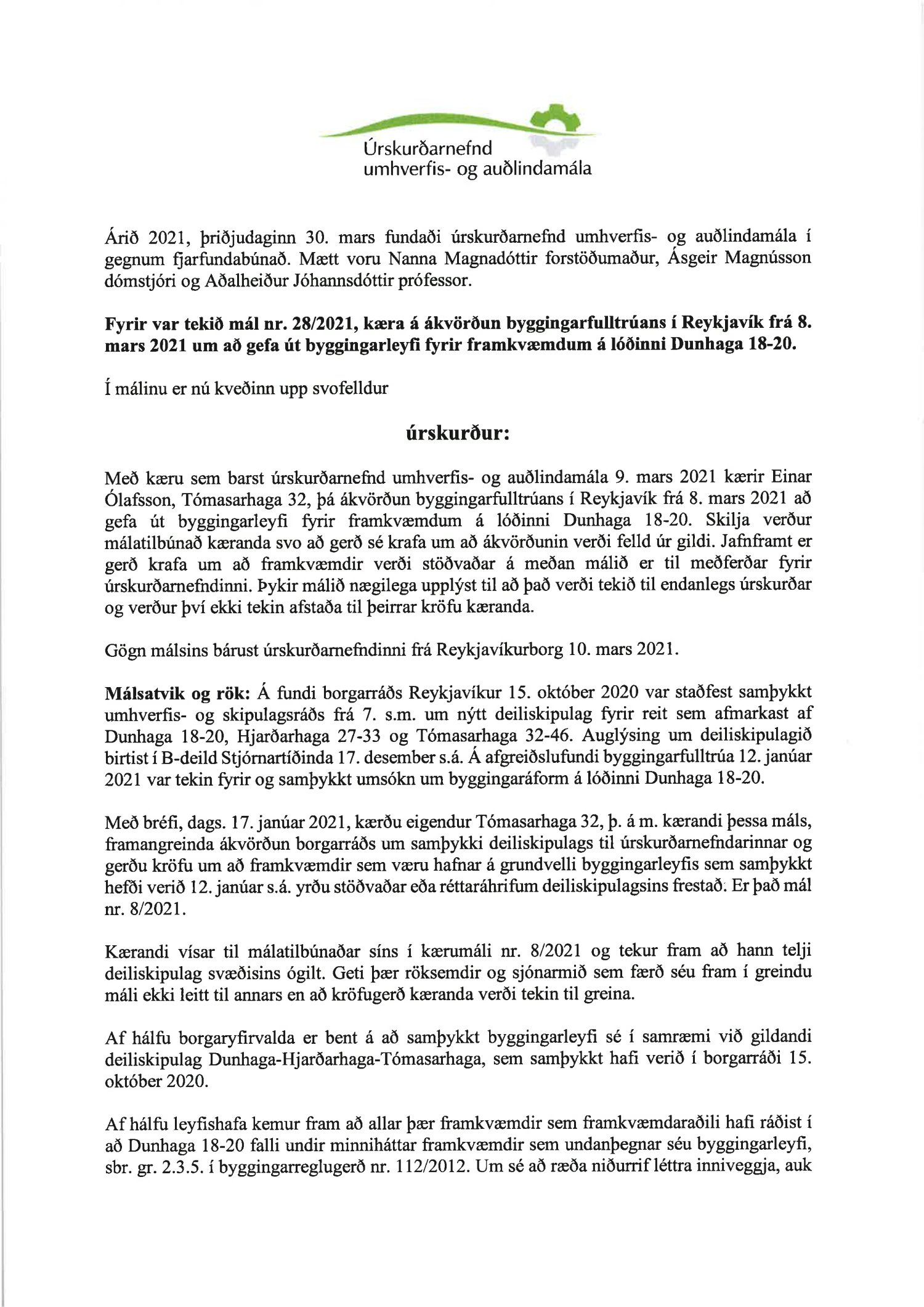 Lagt fram erindi úrskurðarnefndar umhverfis- og auðlindamála dags. 9. mars 2021 ásamt kæru dags. 9. mars 2021 þar sem kærð er ákvörðun byggingarfulltrúa Reykjavíkur frá 8. mars 2021 um útgáfu byggingarleyfis fyrir Dunhaga 18-20. Einnig er lögð fram umsögn skrifstofu sviðsstjóra dags. 10. mars 2021. Jafnframt er lagður fram úrskurður úrskurðarnefndar umhverfis- og auðlindamála frá 30. mars 2021. Úrskurðarorð: Kærumáli þessu er vísað frá nefndinni.
