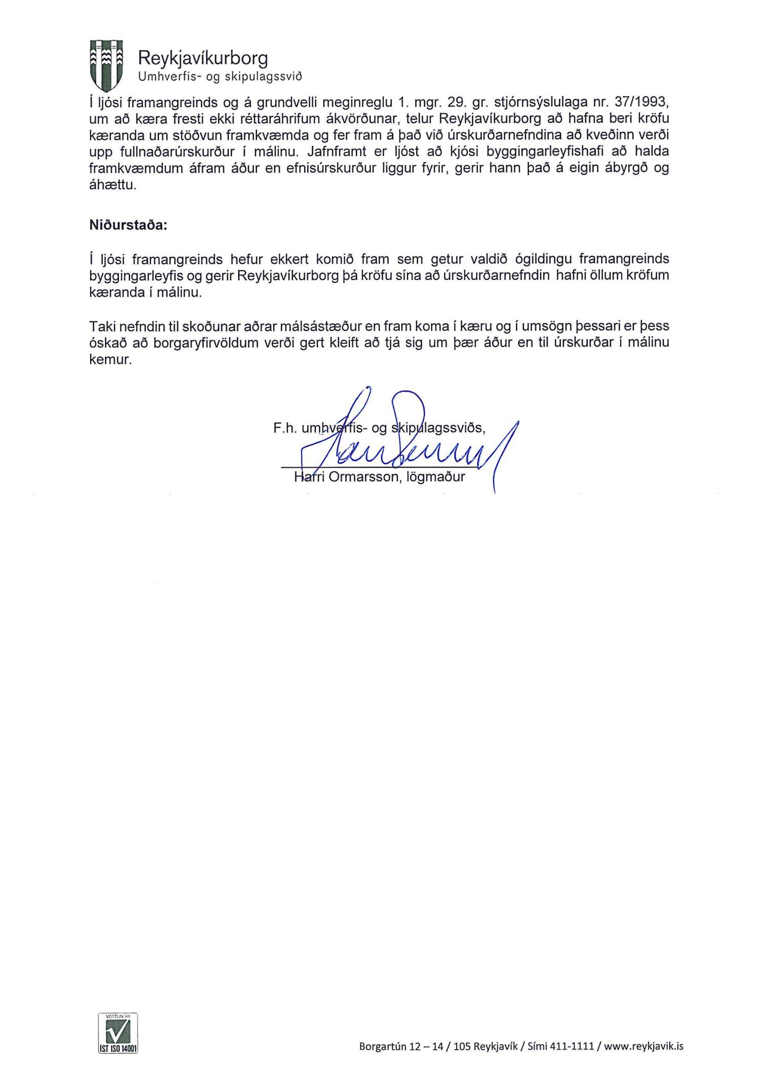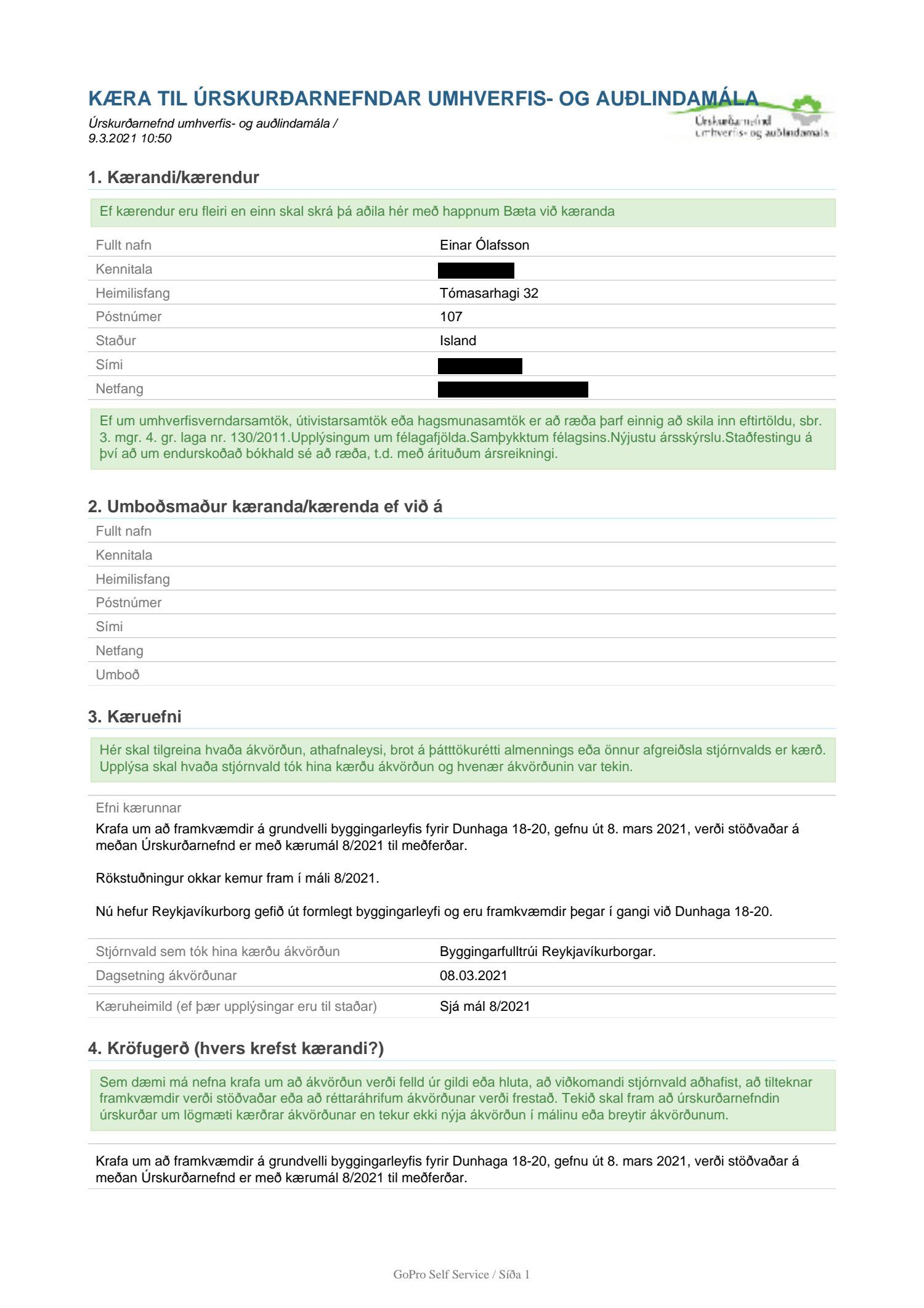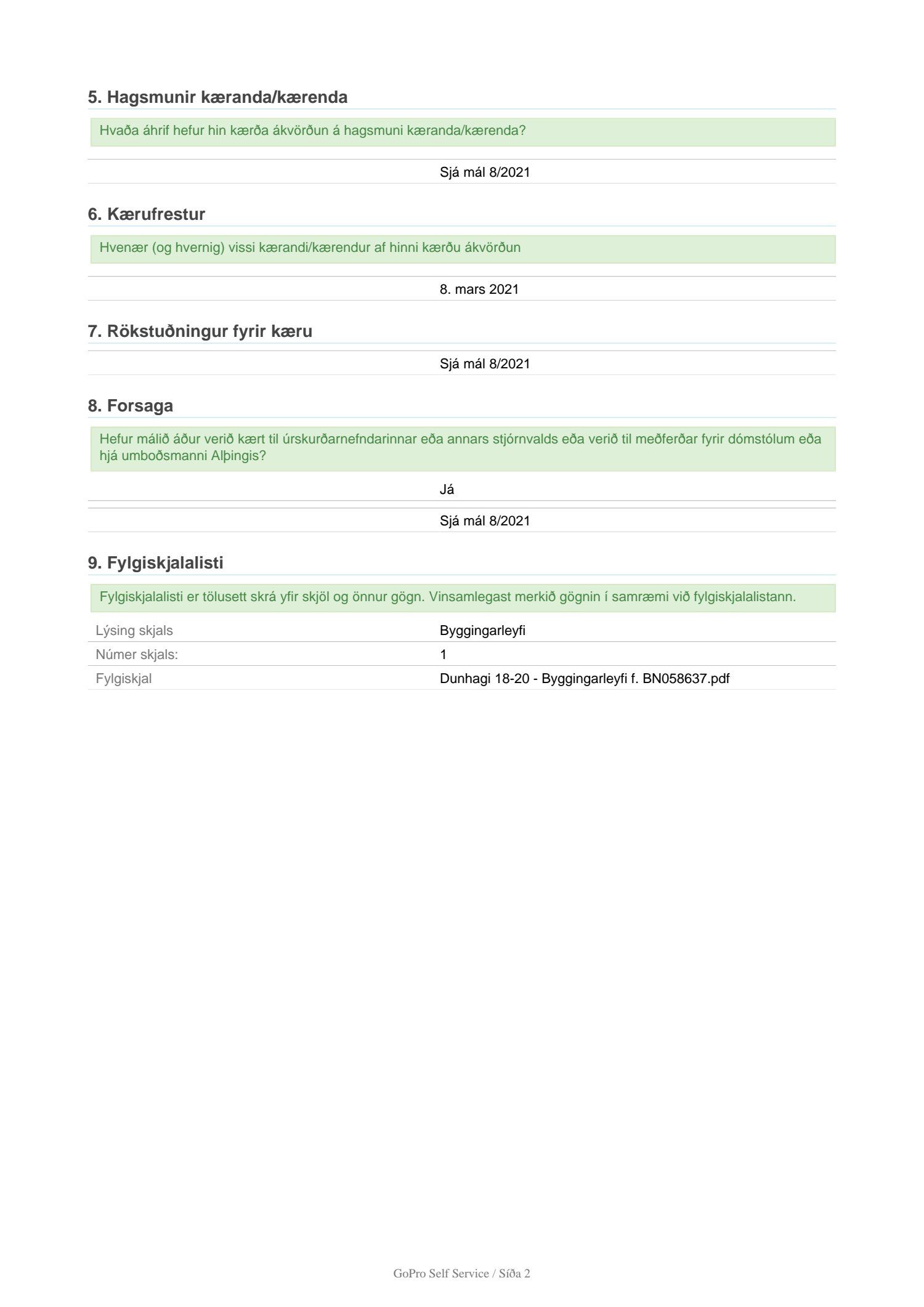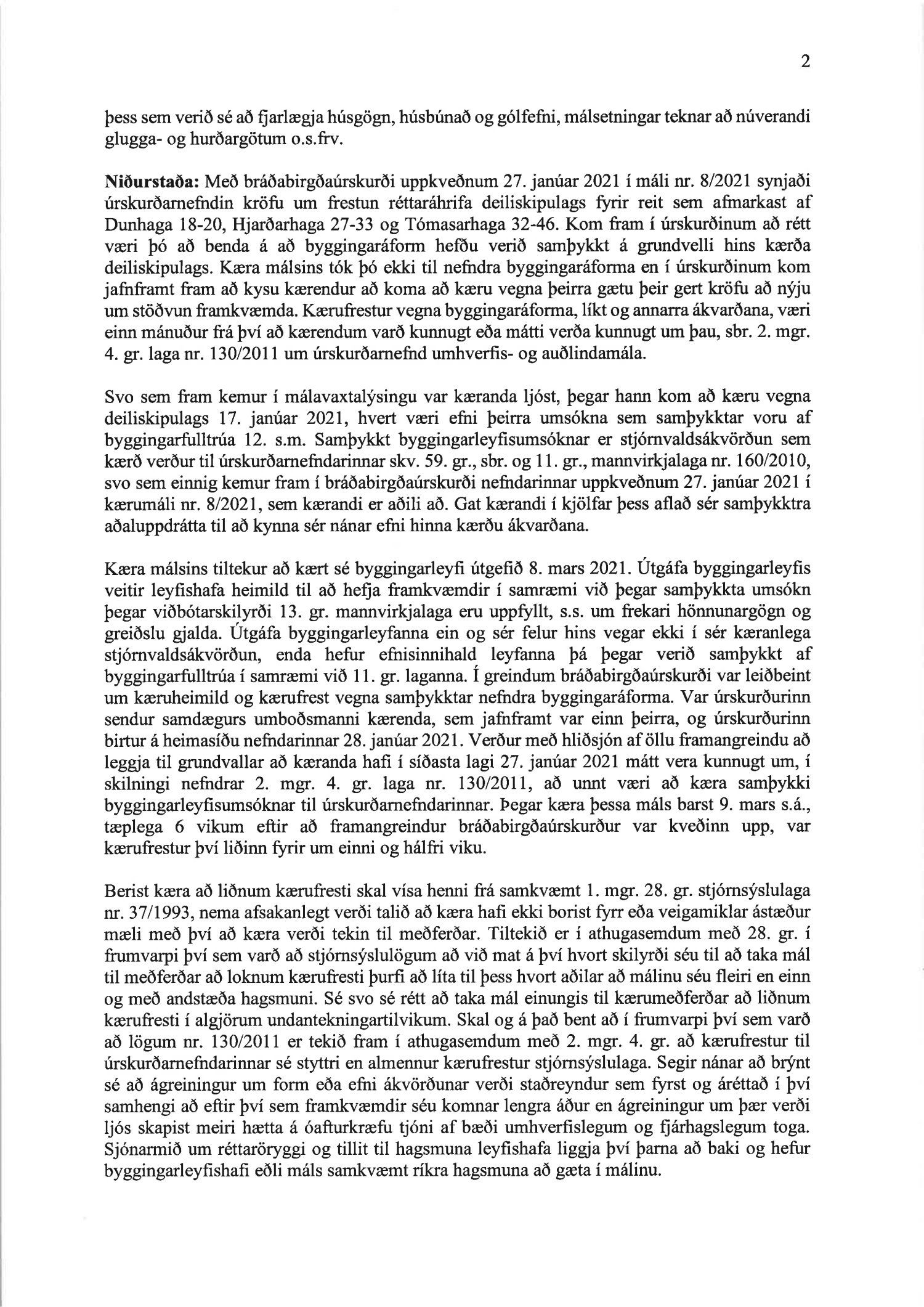 Lagt fram erindi úrskurðarnefndar umhverfis- og auðlindamála dags. 9. mars 2021 ásamt kæru dags. 9. mars 2021 þar sem kærð er ákvörðun byggingarfulltrúa Reykjavíkur frá 8. mars 2021 um útgáfu byggingarleyfis fyrir Dunhaga 18-20. Einnig er lögð fram umsögn skrifstofu sviðsstjóra dags. 10. mars 2021. Jafnframt er lagður fram úrskurður úrskurðarnefndar umhverfis- og auðlindamála frá 30. mars 2021. Úrskurðarorð: Kærumáli þessu er vísað frá nefndinni.