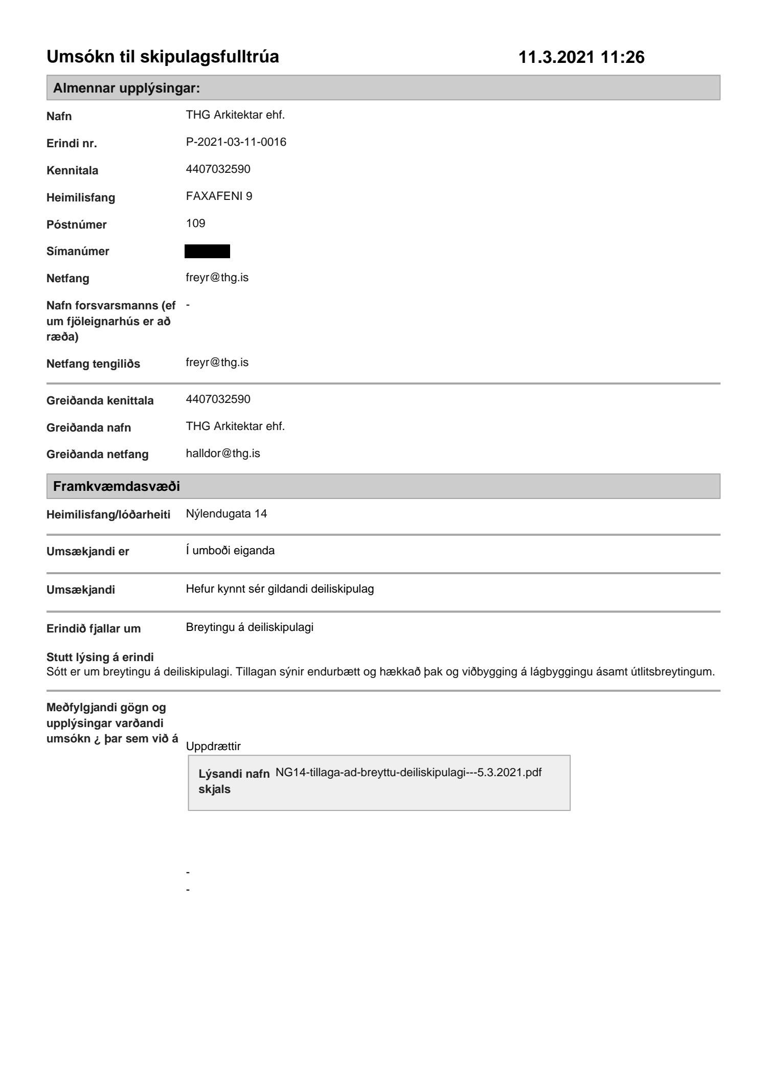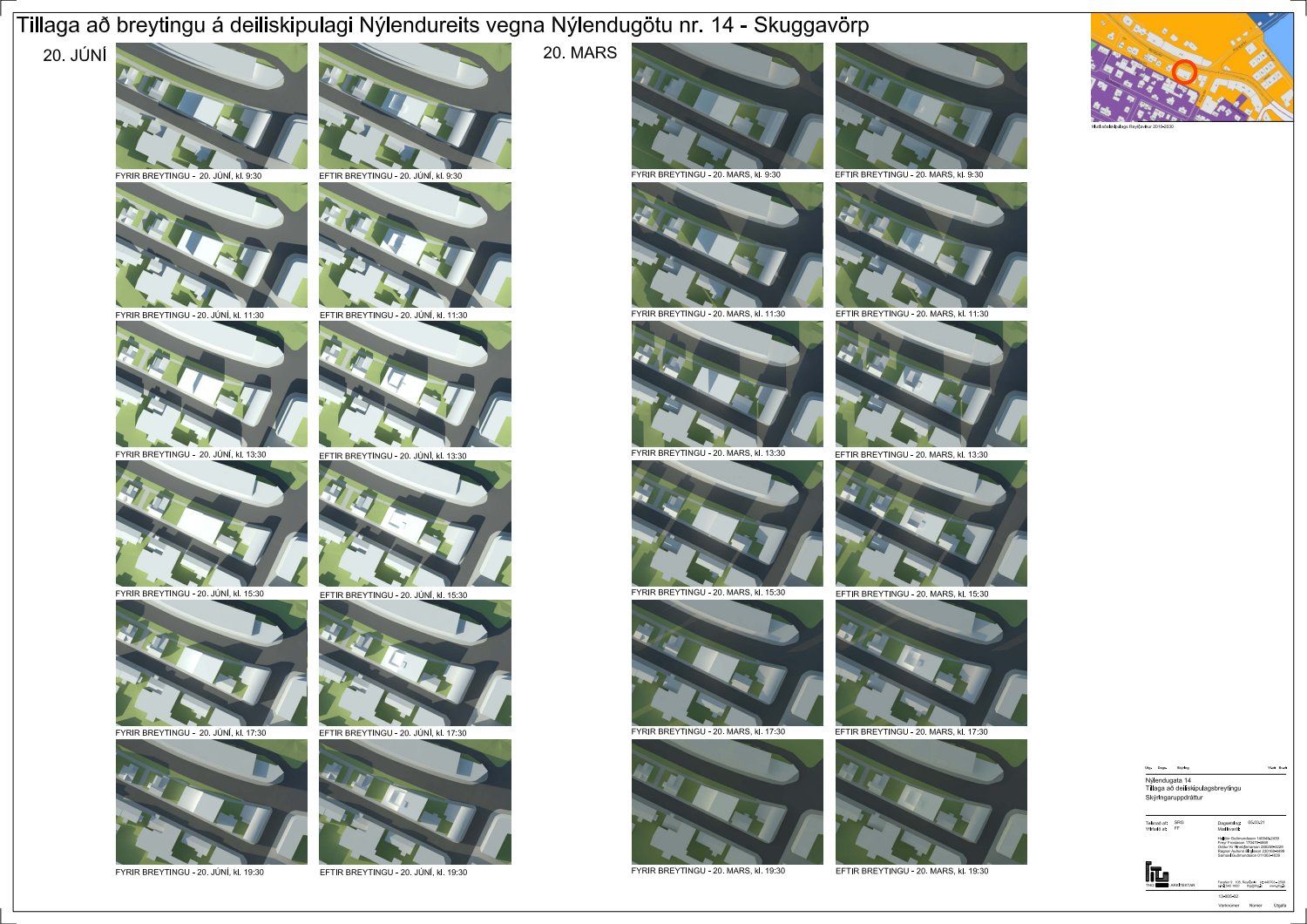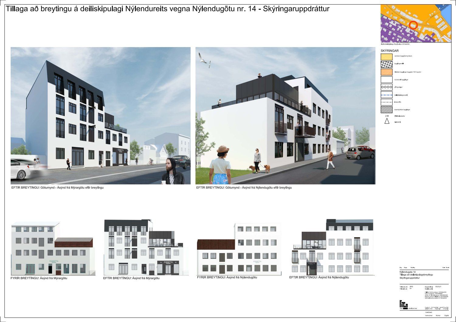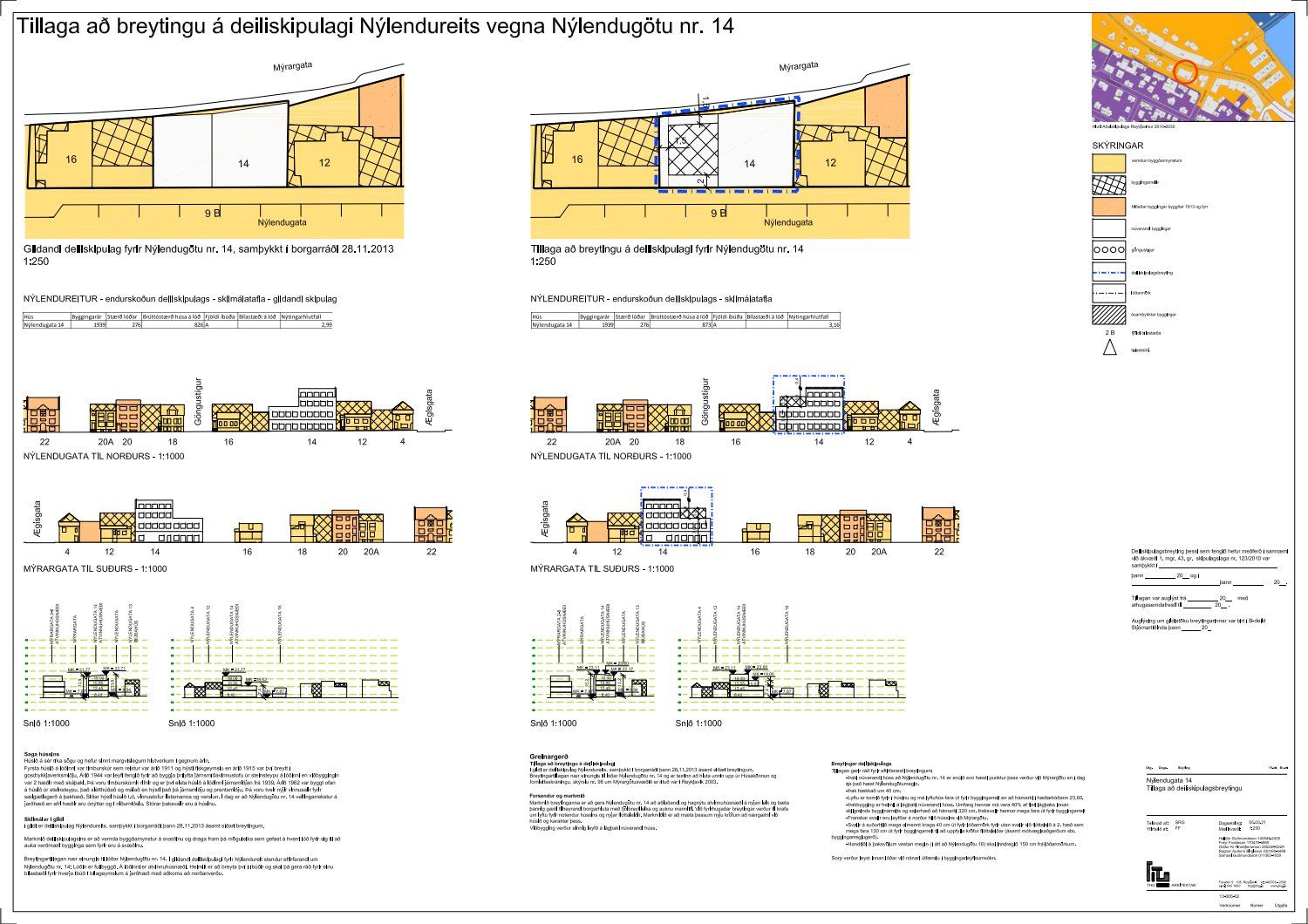 dags. 11. mars 2021 varðandi breytingu á deiliskipulagi Nýlendureits 1.131 vegna lóðarinnar nr. 14 við Nýlendugötu. Í breytingunni felst að heimilt verði að hækka þak hússins og að þakhalli verði hærri við Mýrargötu í stað Nýlendugötu. Koma fyrir lyftu í húsinu og að lyftuhús fari út fyrir byggingarreit. Gera þakbyggingu á lágþaki núverandi húss. Setja franskar svalir á norðurhlið húss við Mýrargötu og að svalir á suðurhlið húss megi almennt kraga 40 cm út fyrir lóðarmörk, fyrir utan svalir við flóttaleið á 2. hæð sem mega fara 130 cm út fyrir byggingarreit. Handrið á þaksvölum vestan megin skal vera inndregið 150 cm frá lóðamörkum, samkvæmt deiliskipulags- og skýringaruppdráttum