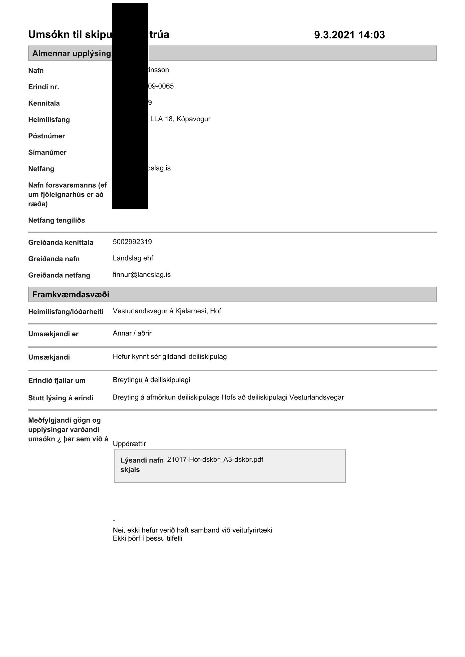 Lögð fram umsókn Finns Kristinssonar dags. 9. mars 2021 varðandi breytingu á deiliskipulagi Esjuhofs á Kjalarnesi. Í breytingunni felst að afmörkun deiliskipulags Esjuhofs hliðrast um 2-3 m til austurs, vegna breytingar á deiliskipulagi Vesturlandsvegar, samkvæmt uppdr.