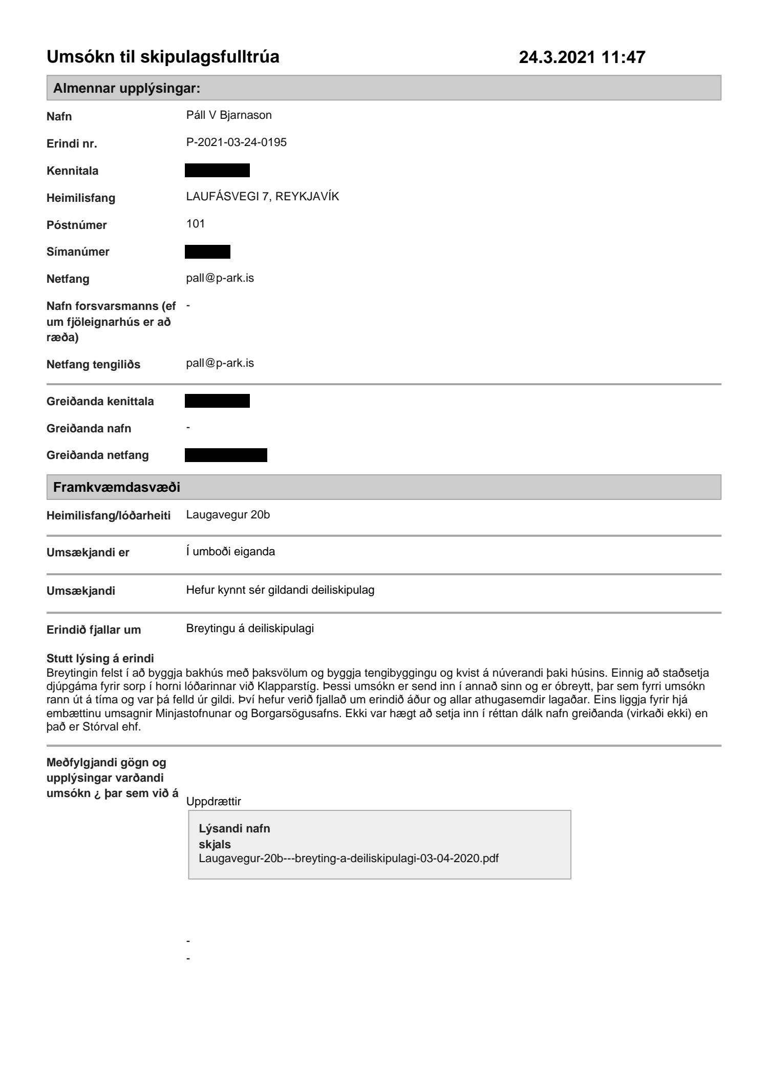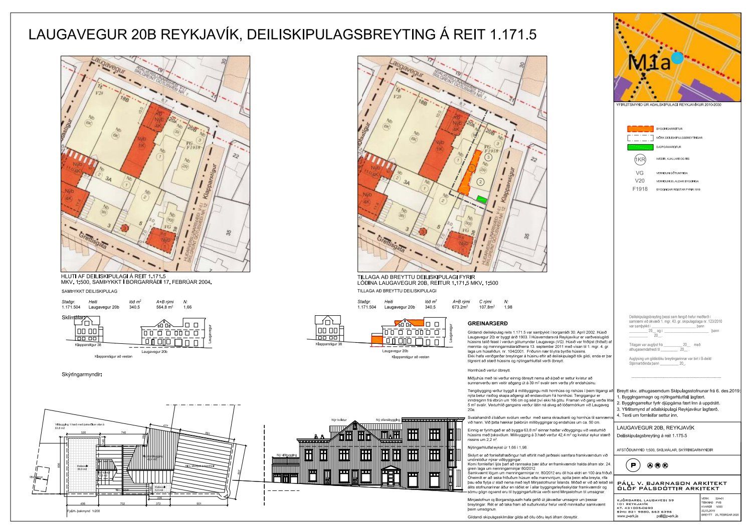 Lögð fram umsókn Páls V. Bjarnasonar dags. 24. mars 2021 varðandi breytingu á deiliskipulagi reits 1.171.5, Laugavegs- og Skólavörðustígsreitir, vegna lóðarinnar nr. 20B við Laugaveg. Í breytingunni felst að heimilt verði að gera einnar hæðar viðbyggingu á bakhlið hússins með þaksvölum auk þess að gera inndregna þakhæð, tengibyggingu á millibyggingu milli hornhúss og rishúss, með kvisti til suðurs úr mænisþaki sem veitir aðgang að þaksvölum sem verða yfir endahúsinu. Við breytinguna hækkar nýtingarhlutfall lóðar, samkvæmt uppdr. P