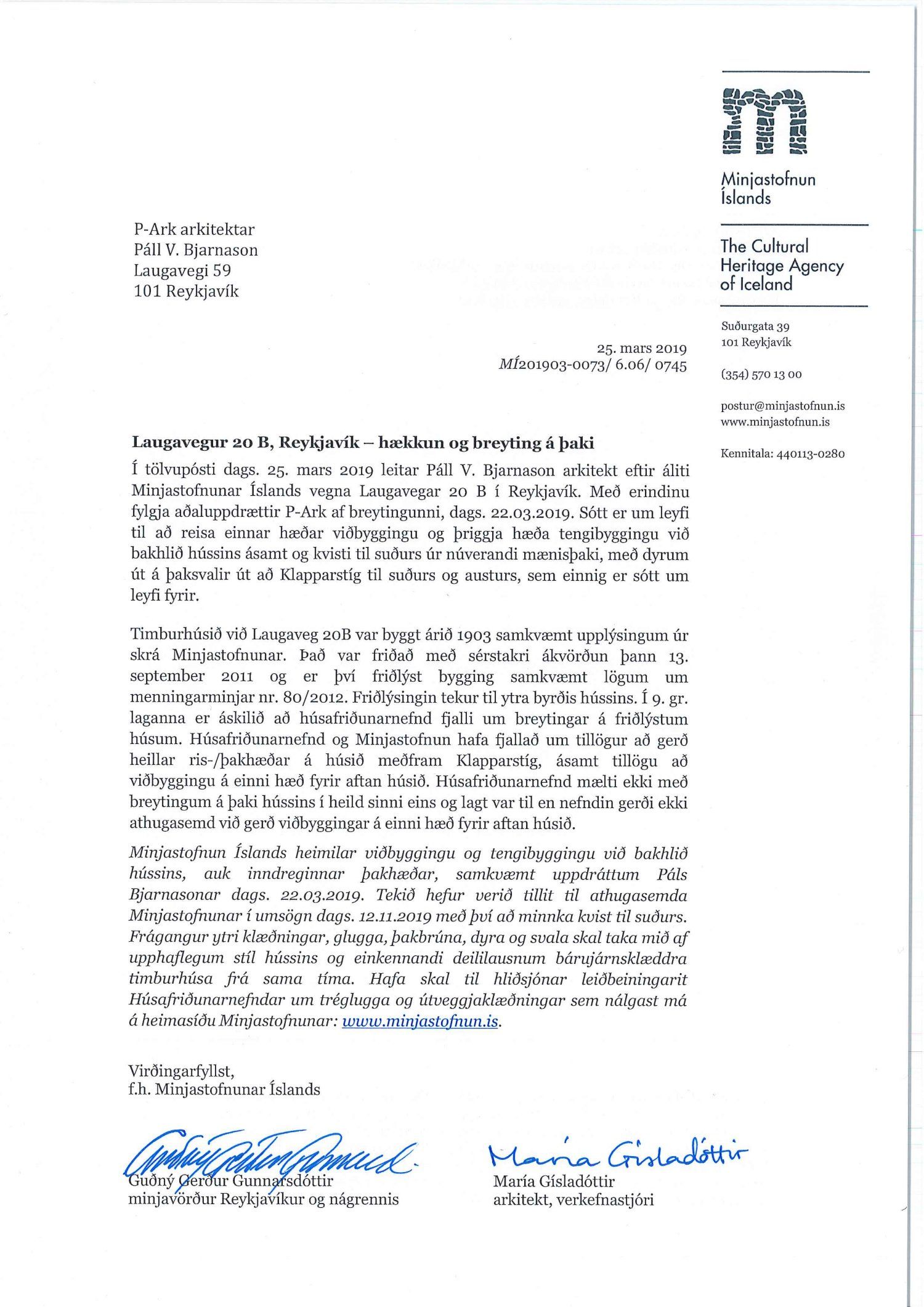 dags. 22. mars 2019, br. 20. febrúar 2020. Einnig eru lagðar fram umsagnir Minjastofnunar Íslands dags. 12. nóvember 2018 og 25. mars 2019 og umsögn Borgarsögusafns Reykjavíkur dags. 5. desember 2018.