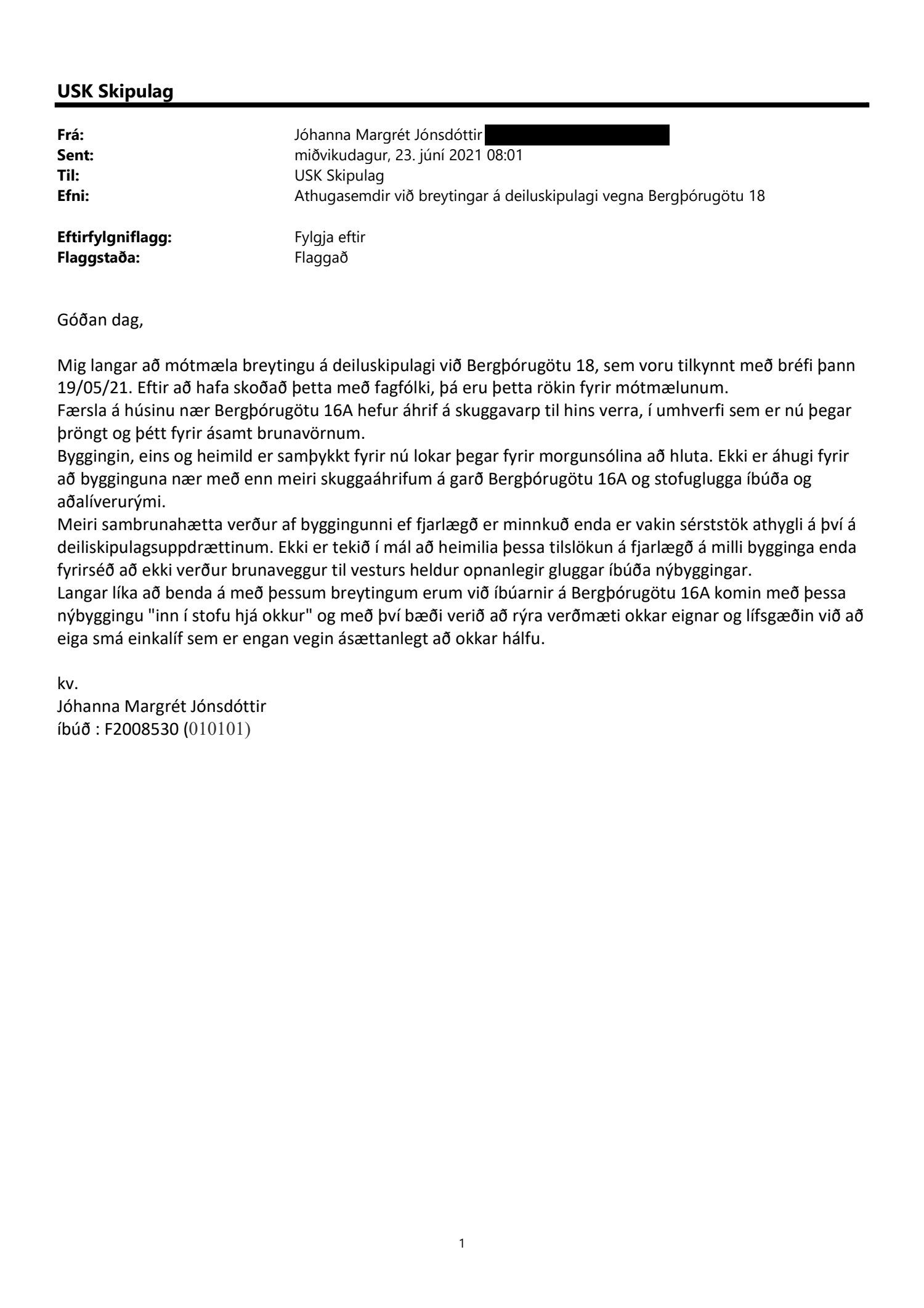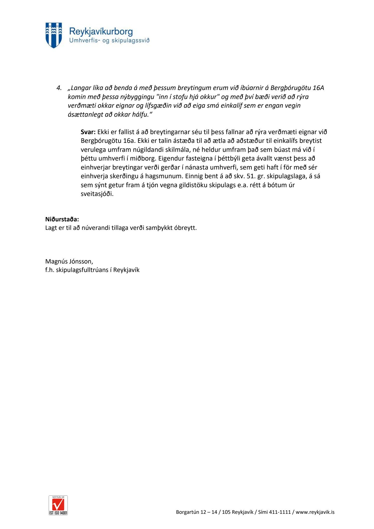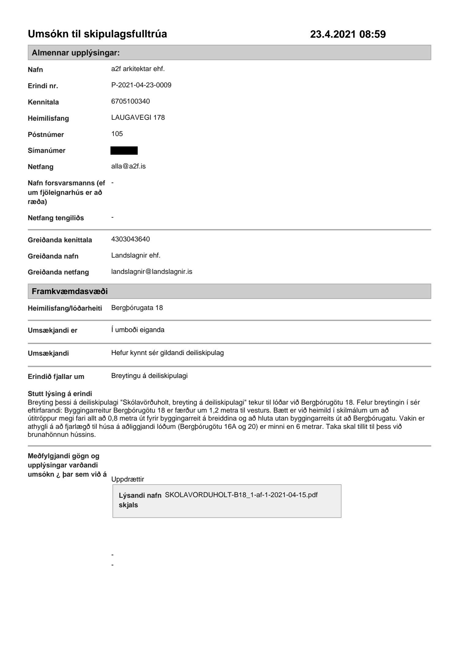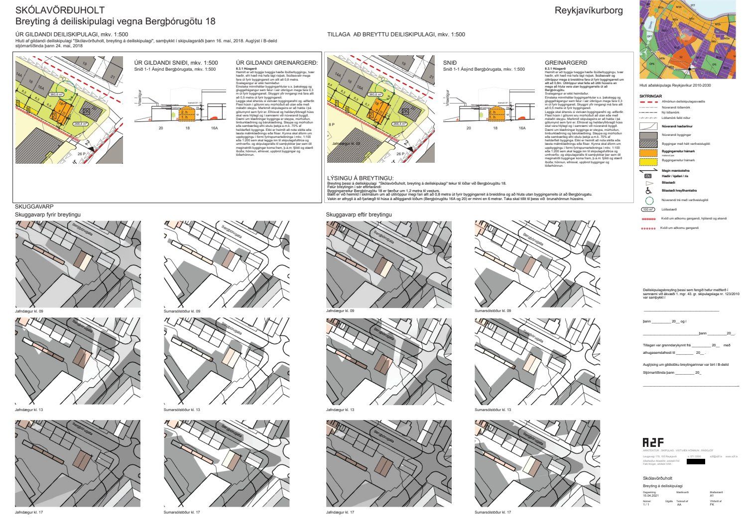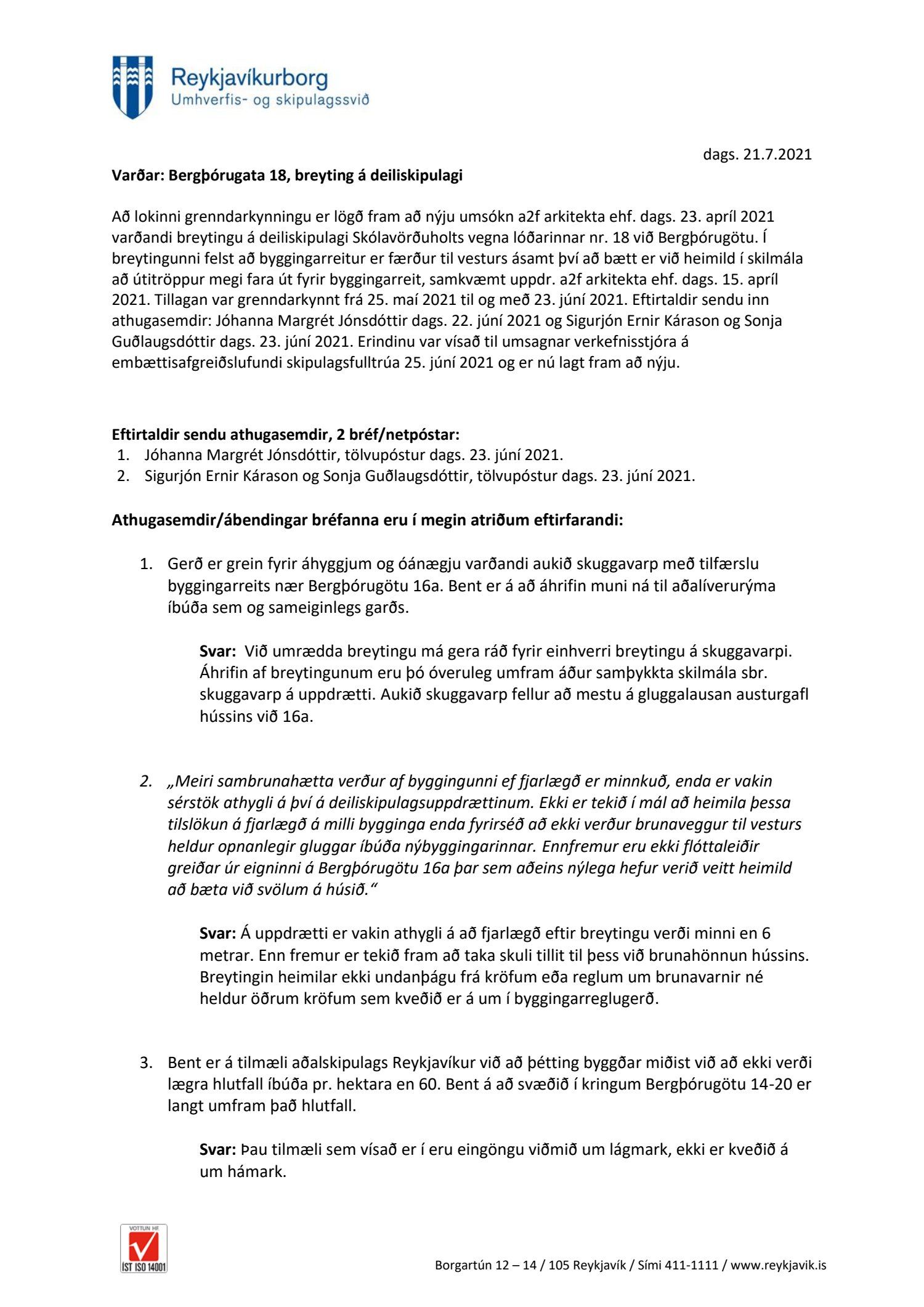 Að lokinni grenndarkynningu er lögð fram að nýju umsókn a2f arkitekta ehf. dags. 23. apríl 2021 varðandi breytingu á deiliskipulagi Skólavörðuholts vegna lóðarinnar nr. 18 við Bergþórugötu. Í breytingunni felst að byggingarreitur er færður til vesturs ásamt því að bætt er við heimild í skilmála að útitröppur megi fara út fyrir byggingarreit, samkvæmt uppdr. a2f arkitekta ehf. dags. 15. apríl 2021. Tillagan var grenndarkynnt frá 25. maí 2021 til og með 23. júní 2021. Eftirtaldir sendu inn athugasemdir: Jóhanna Margrét Jónsdóttir dags. 23. júní 2021 og Sigurjón Ernir Kárason og Sonja Guðlaugsdóttir dags. 23. júní 2021. Einnig er lögð fram umsögn skipulagsfulltrúa dags. 21. júlí 2021.