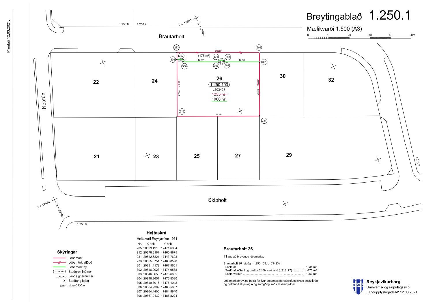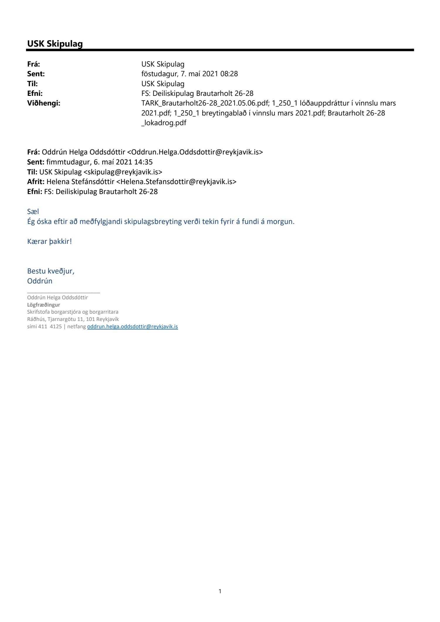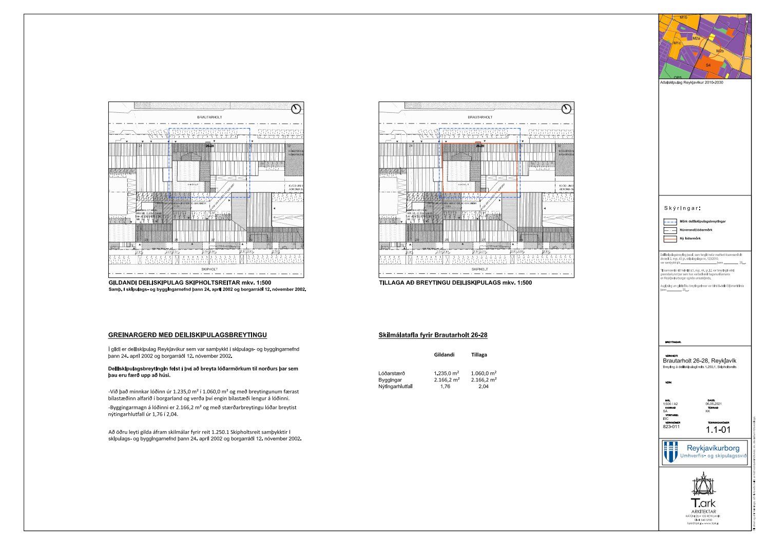 Lagt fram erindi skrifstofu borgarstjóra og borgarritara dags. 6. maí 2021 varðandi breytingu á deiliskipulagi Skipholtsreits vegna lóðarinnar nr. 26-28 við Brautarholt. Í breytingunni felst að breyta lóðarmörkum til norðurs þar sem þau eru færð upp að húsi, samkvæmt uppdr. umhverfis- og skipulagssviðs dags. 6. maí 2021. Einnig er lagður fram lóðauppdráttur í vinnslu dags. 12. mars 2021 og breytingablað í vinnslu dags. 12. mars 2021.