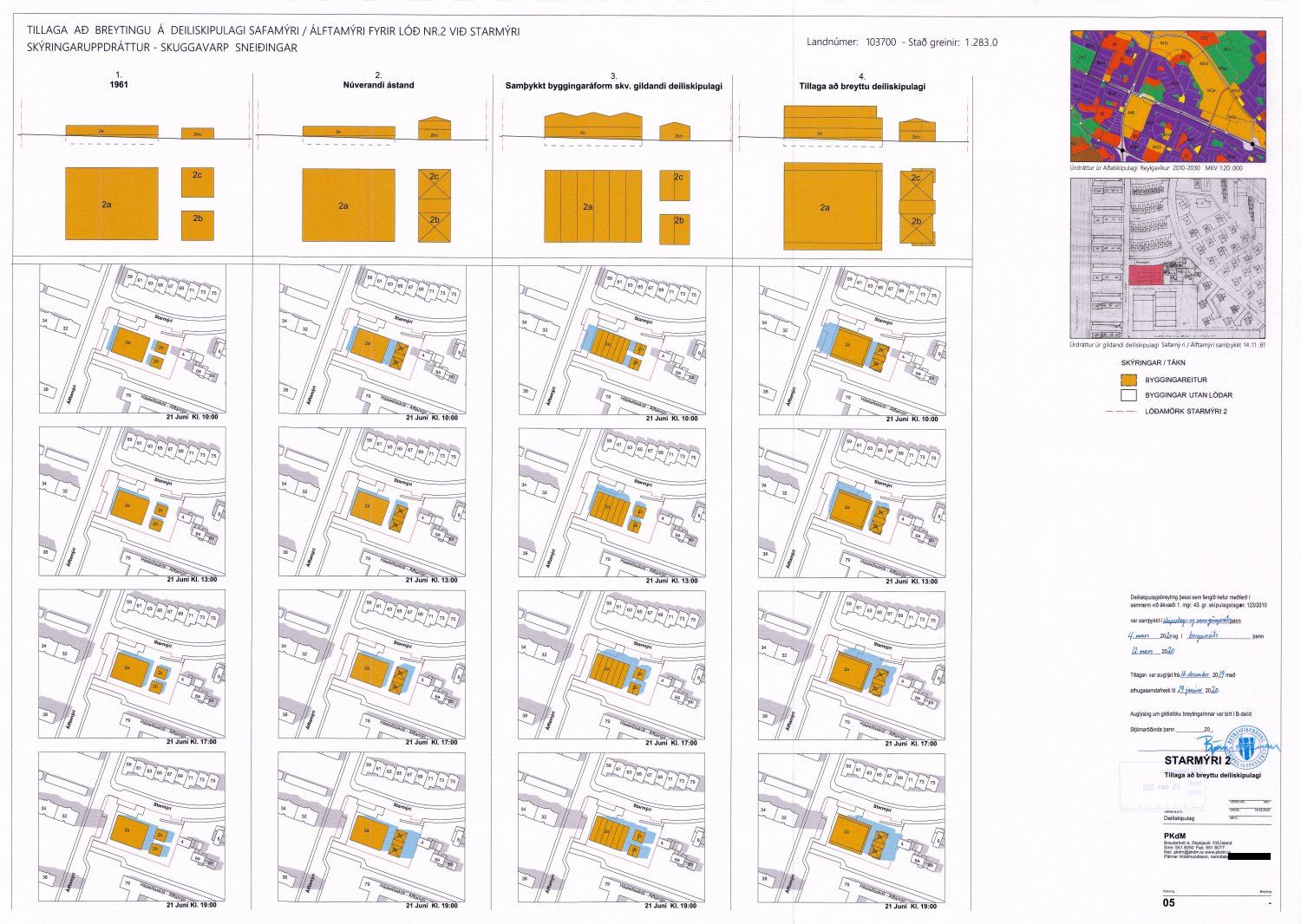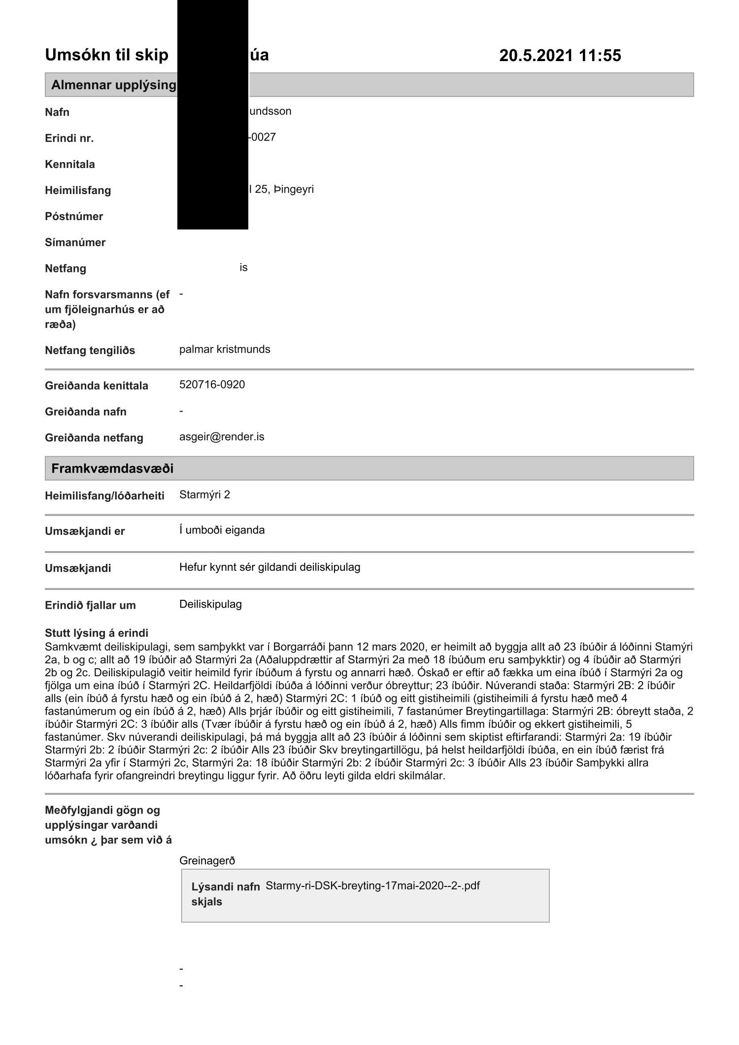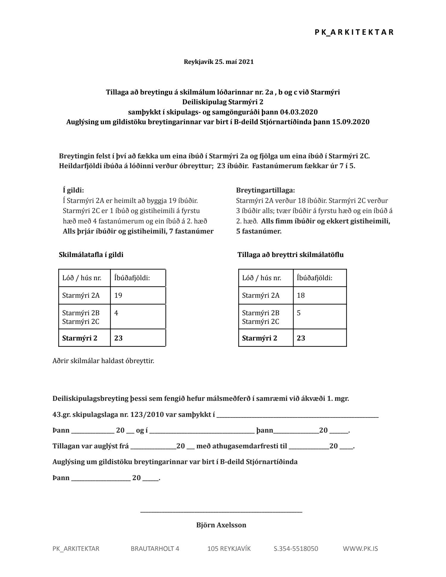 Lögð fram umsókn Pálmars Kristmundssonar dags. 20. maí 2021 varðandi breytingu á skilmálum deiliskipulags Safamýrar - Álftamýrar vegna lóðarinnar nr. 2 við Starmýri. Breytingin felst í því að fækka um eina íbúð í Starmýri 2a og fjölga um eina íbúð í Starmýri 2C. Heildarfjöldi íbúða á lóðinni verður óbreyttur; 23 íbúðir. Fastanúmerum fækkar úr 7 í 5. Heildarfjöldi íbúða á lóðinni verður óbreyttur; 23 íbúðir. Fastanúmerum fækkar úr 7 í 5., samkvæmt tillögu KP Arkitekta ehf. dags. 25. maí 2021.