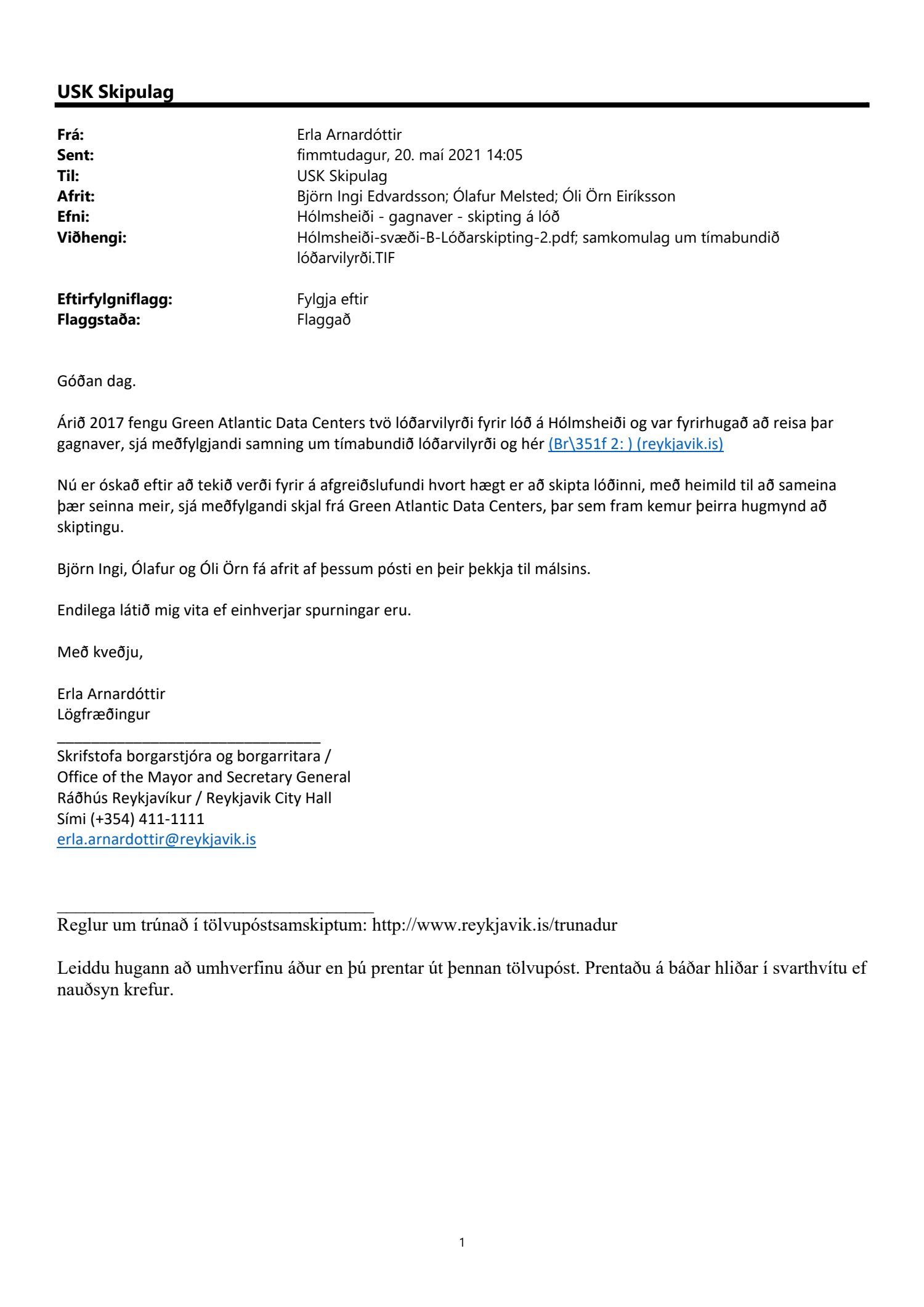 Lagt fram erindi skrifstofu borgarstjóra og borgarritara dags. 20. maí 2021 um skiptingu lóðarinnar, með heimild til að sameina þær seinna meir, samkvæmt tillögu ódags. Einnig er lagður fram samningur milli Reykjavíkurborgar og Green Atlantic Date Centers dags. 13. febrúar 2017 um tímabundið lóðarvilyrði.