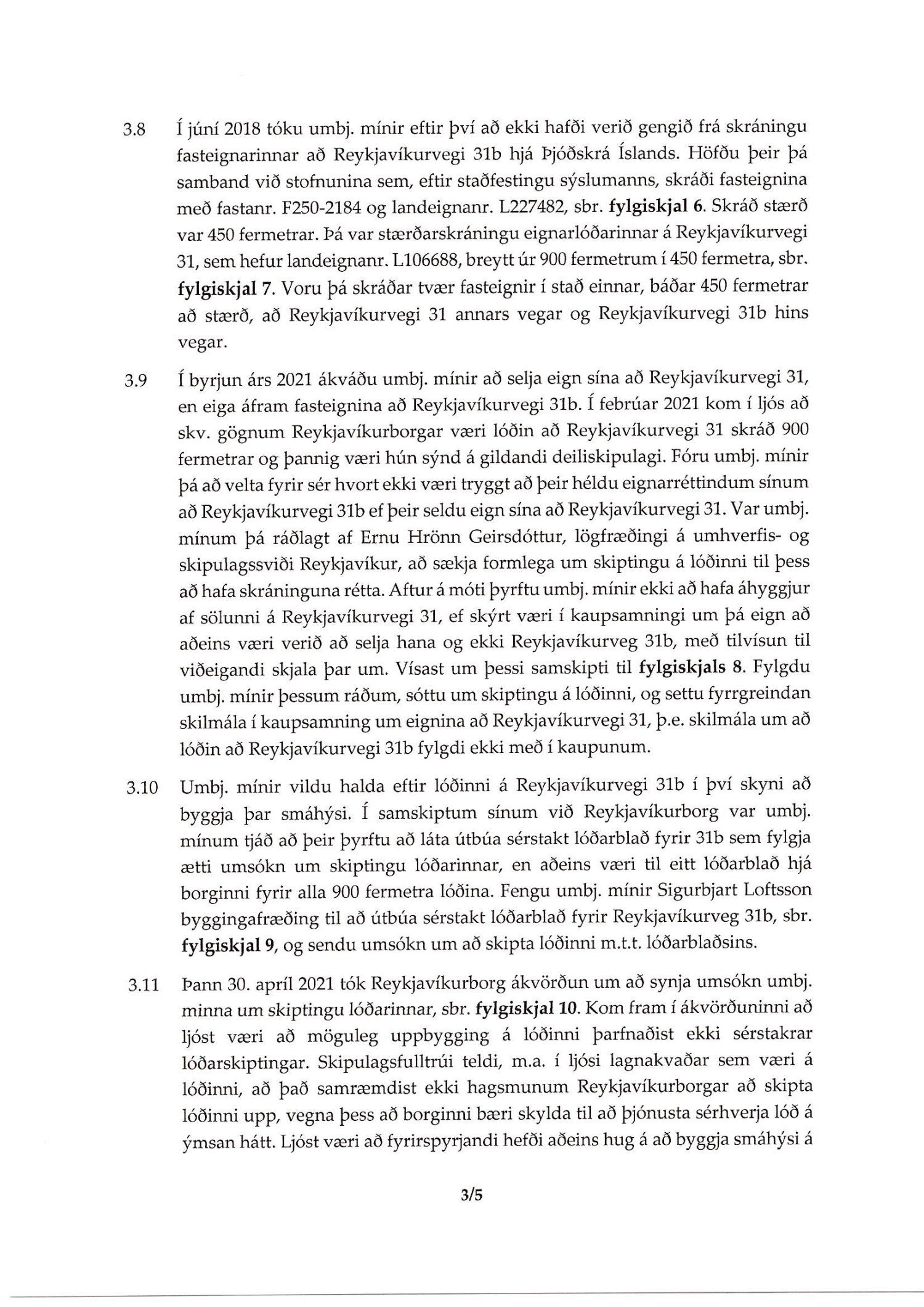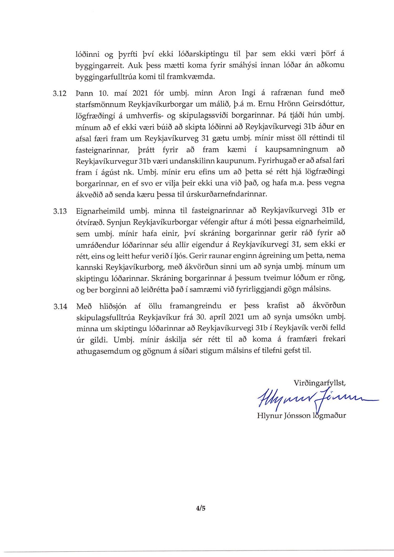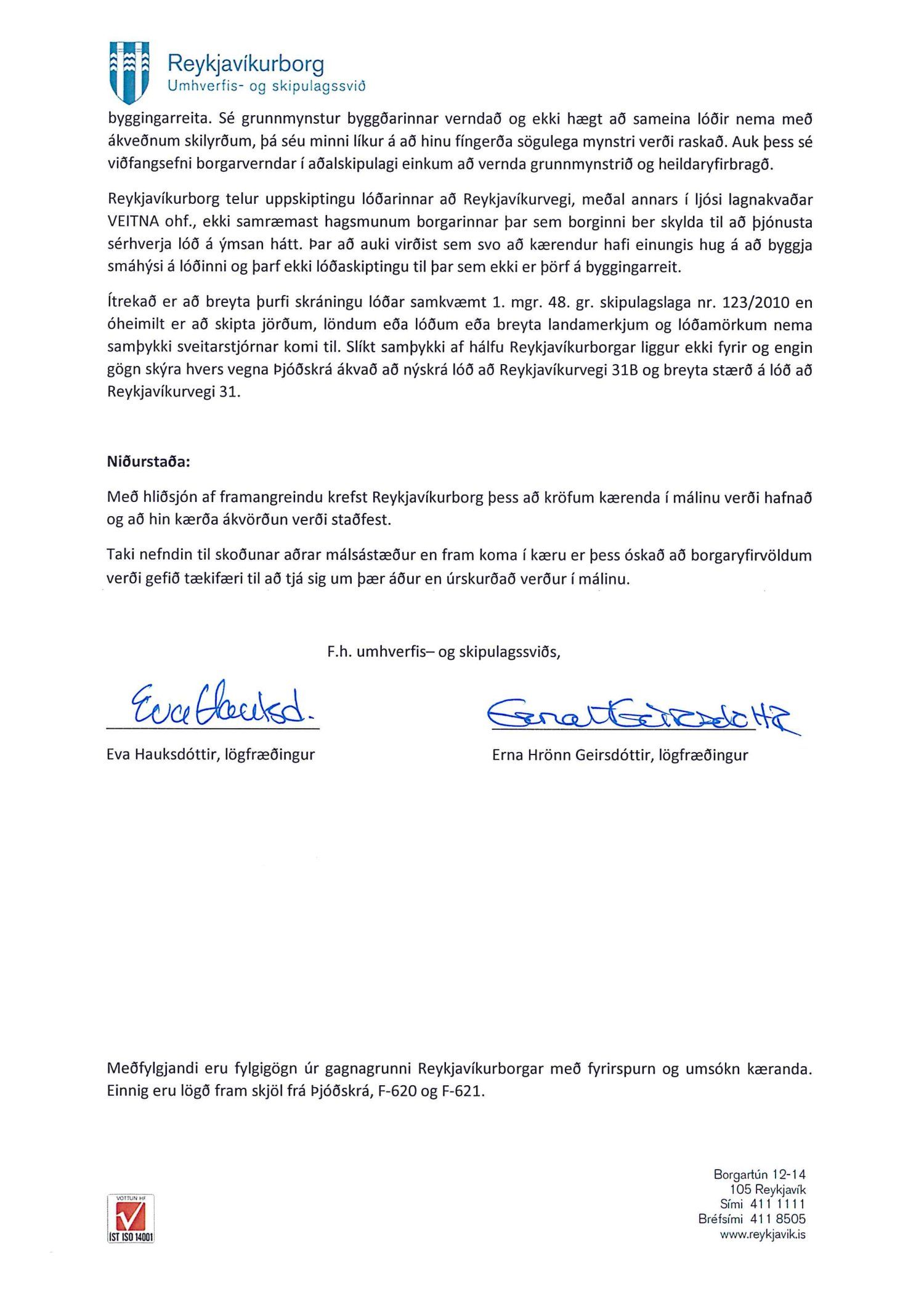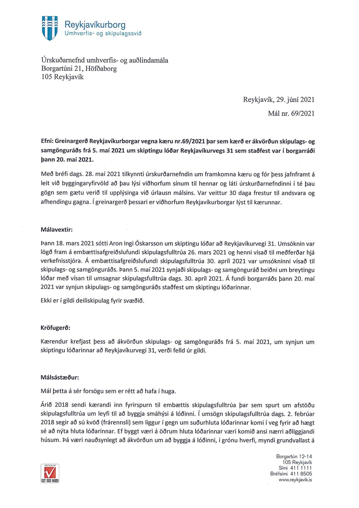 Lagt fram erindi úrskurðanefndar umhverfis- og auðlindamála dags. 28. maí 2021 ásamt kæru dags. 27. maí 2021 þar sem kærð er staðfesting borgarráðs á synjun skipulags- og samgönguráðs frá 5. maí 2021 um skiptingu lóðarinnar nr. 31 við Reykjavíkurveg. Einnig er lögð fram umsögn skrifstofu sviðsstjóra dags. 29. júní 2021.