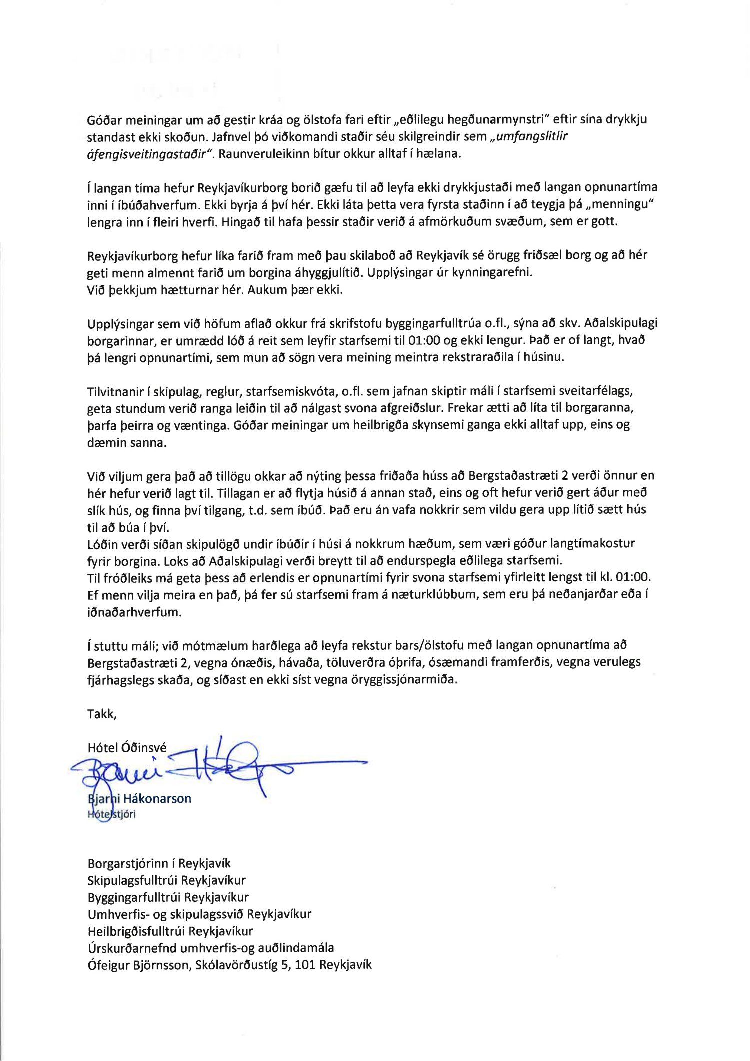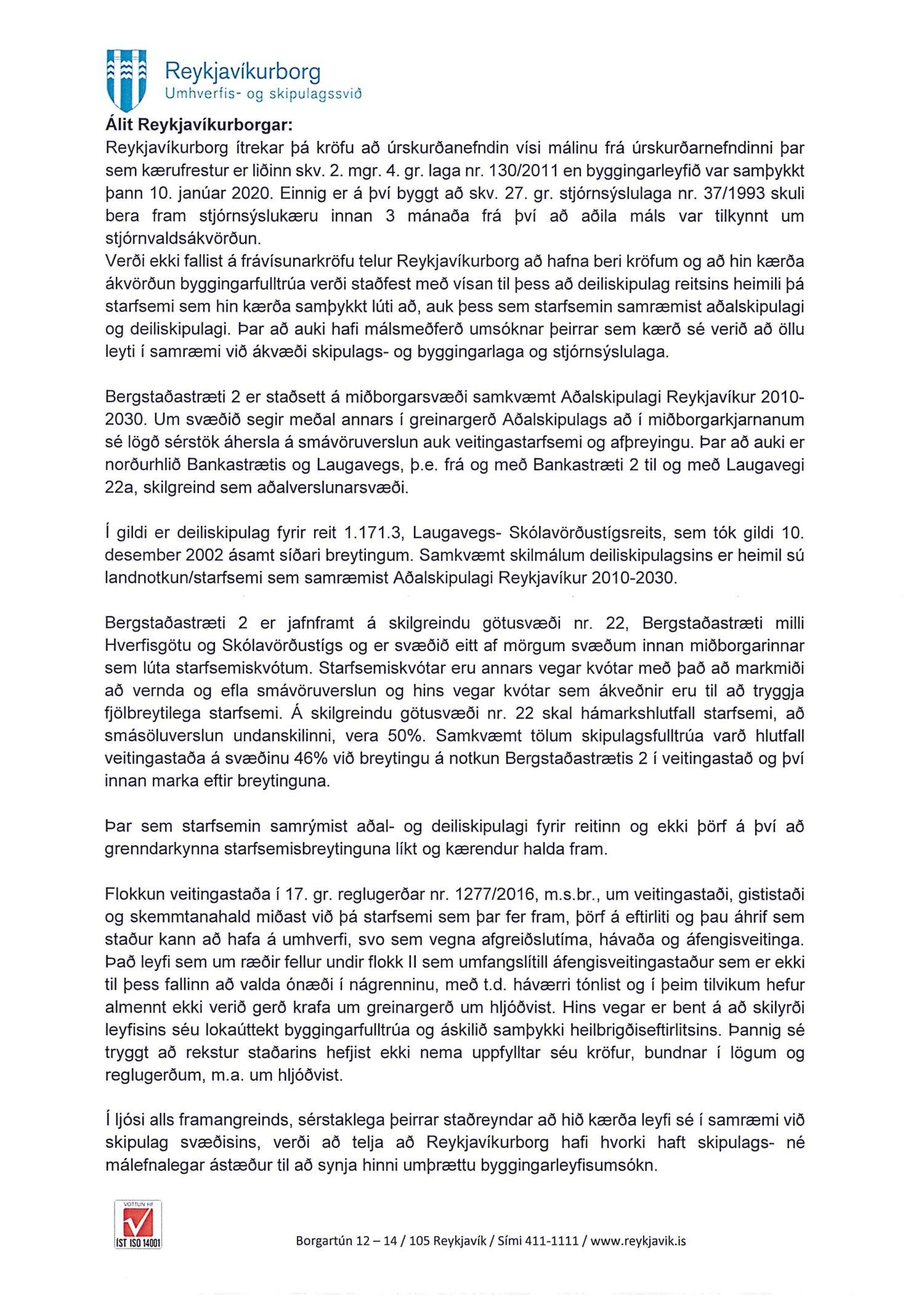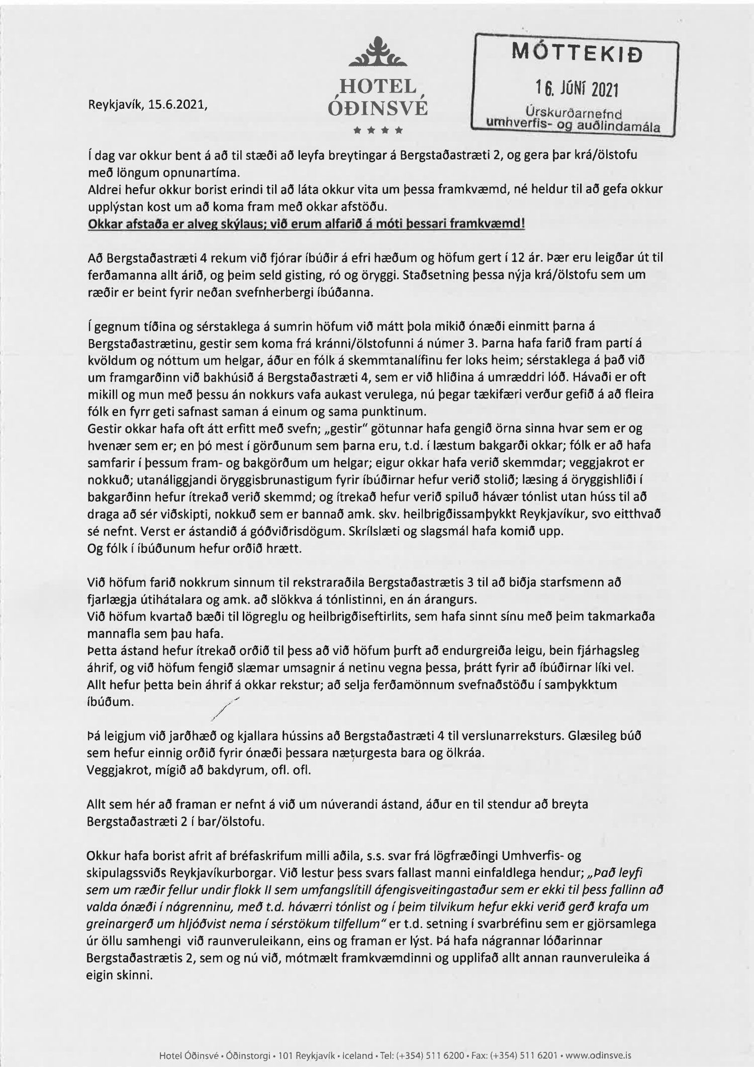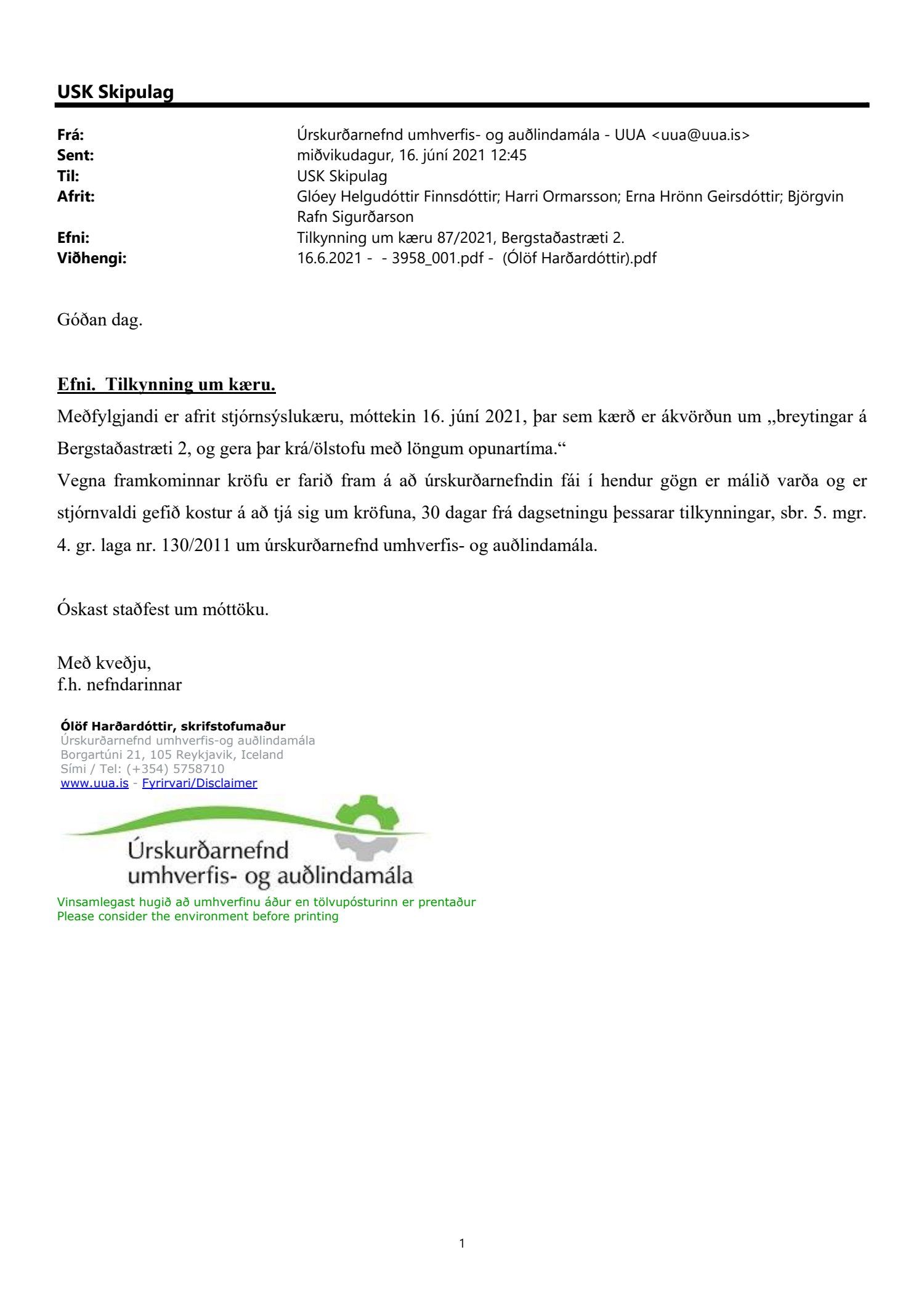 Lagt fram erindi frá úrskurðarnefnd umhverfis- og auðlindamála dags. 16. júní 2021 ásamt kæru dags. 15. júní 2021 þar sem kærð er samþykkt byggingarfulltrúa frá 7. janúar 2020 um að innrétta krá/ölstofu að Bergstaðastræti 2. Einnig er lögð fram umsögn skrifstofu sviðsstjóra dags. 25. júní 2021.