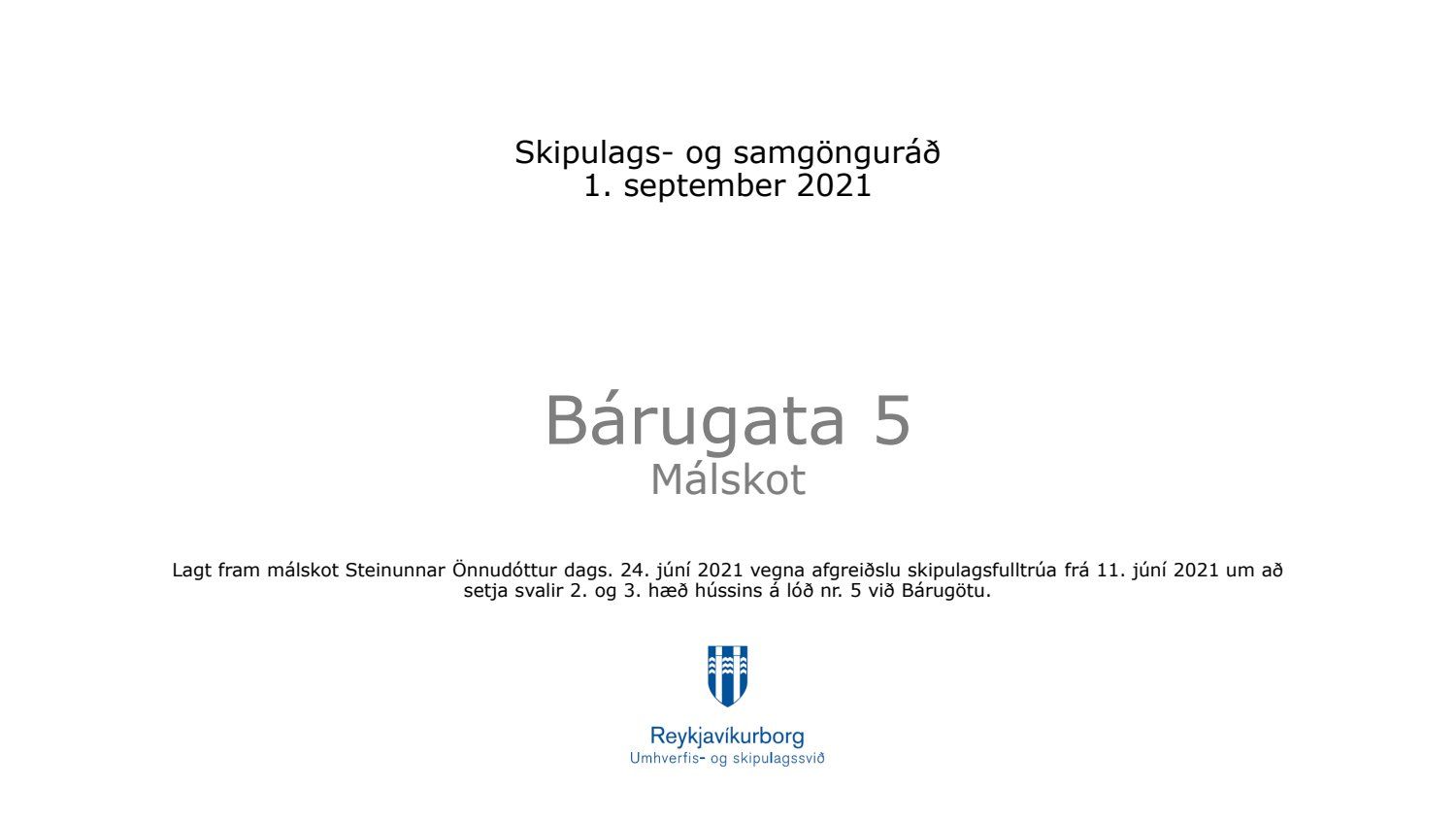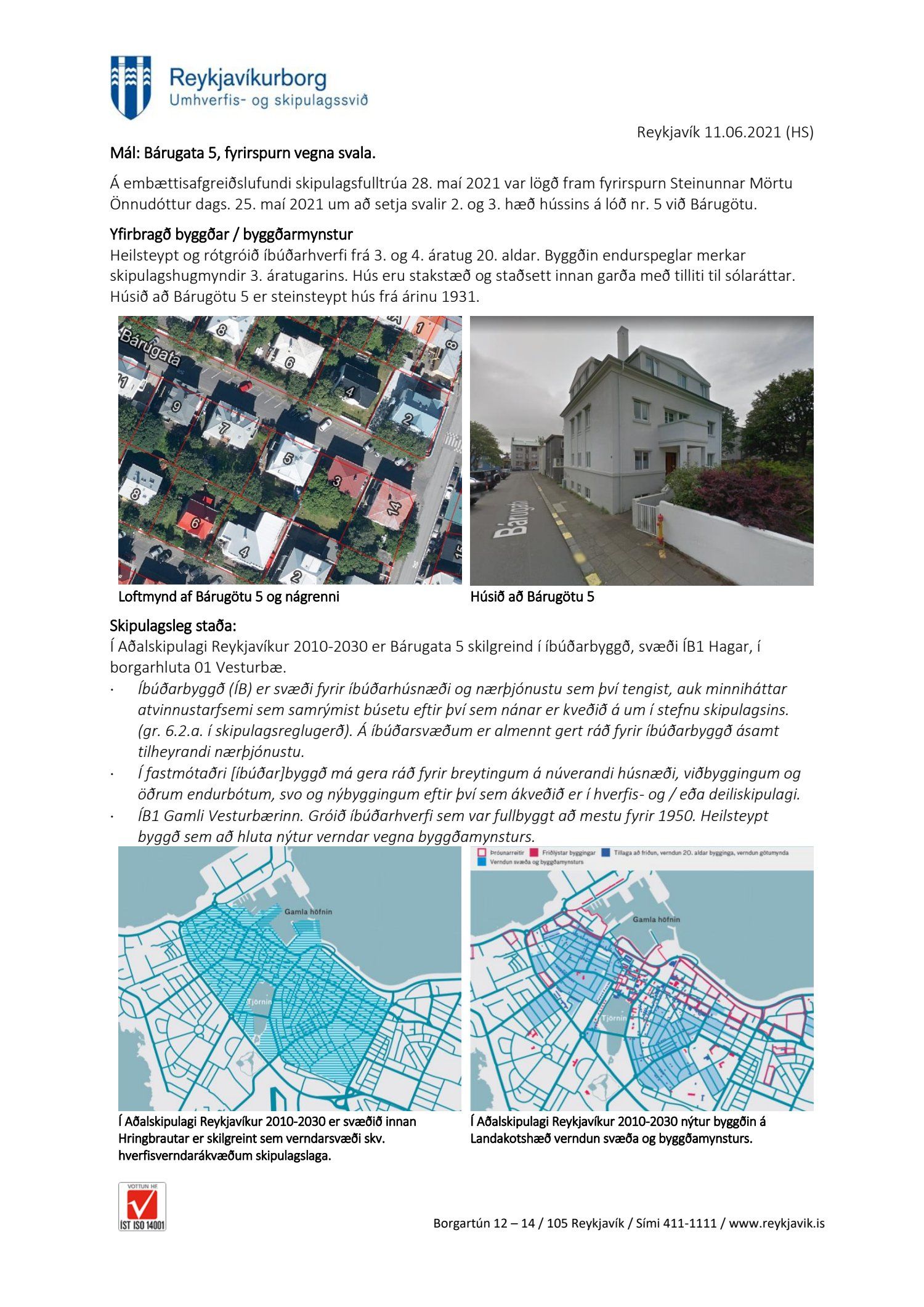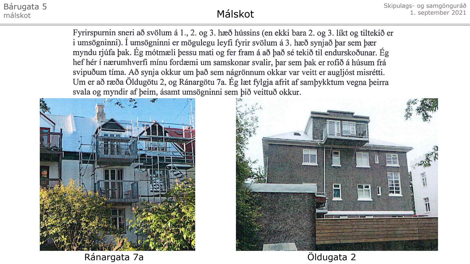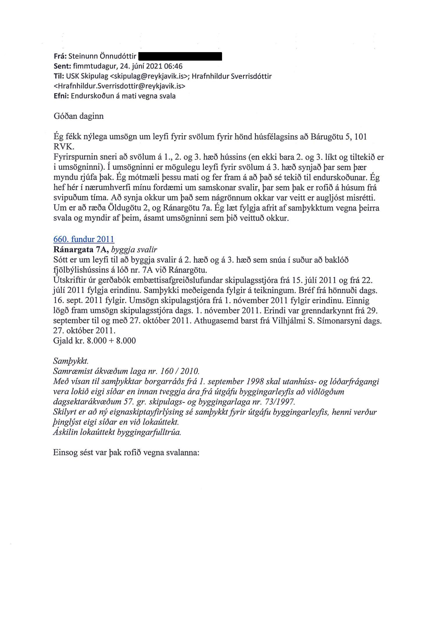Lagt fram málskot Steinunnar Önnudóttur dags. 24. júní 2021 vegna afgreiðslu skipulagsfulltrúa frá 11. júní 2021 um að setja svalir 2. og 3. hæð hússins á lóð nr. 5 við Bárugötu. Einnig er lögð fram umsögn skipulagsfulltrúa, dags. 11. júní 2021.
