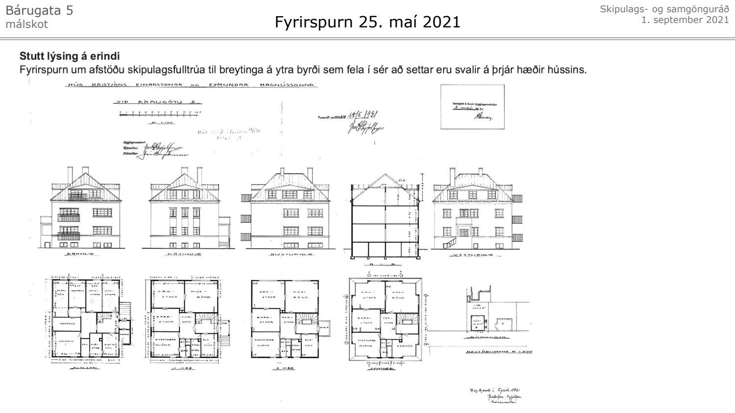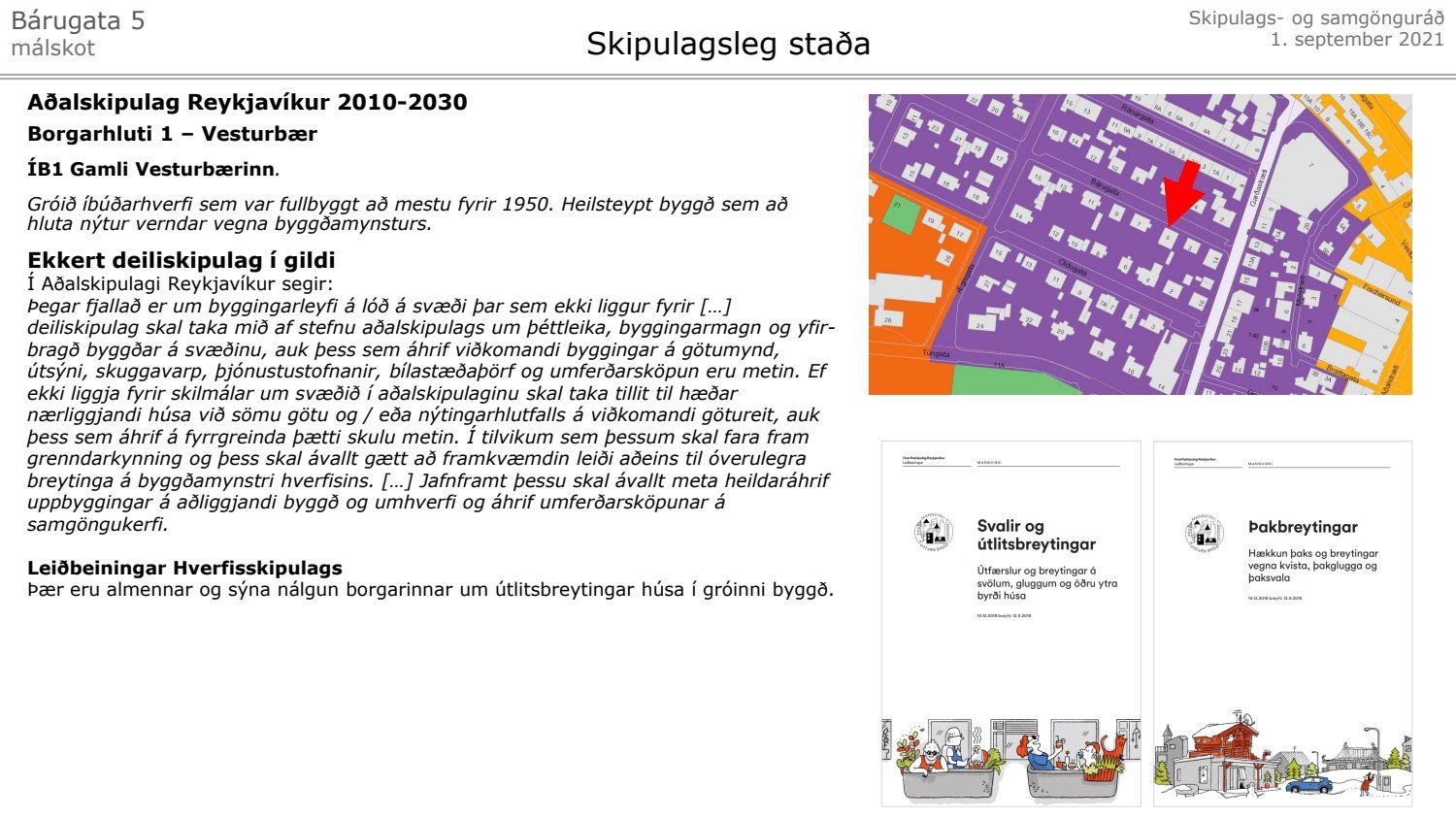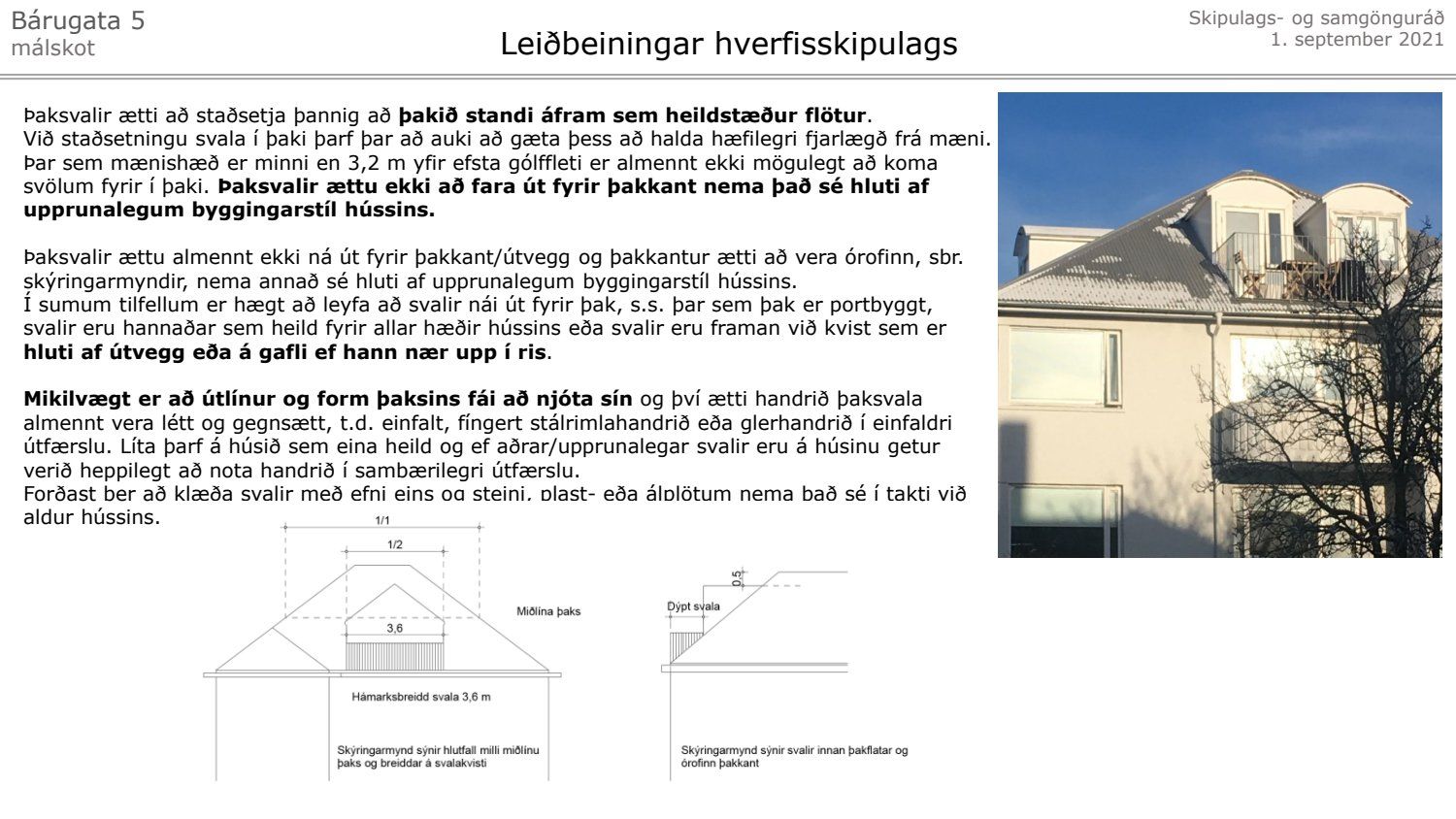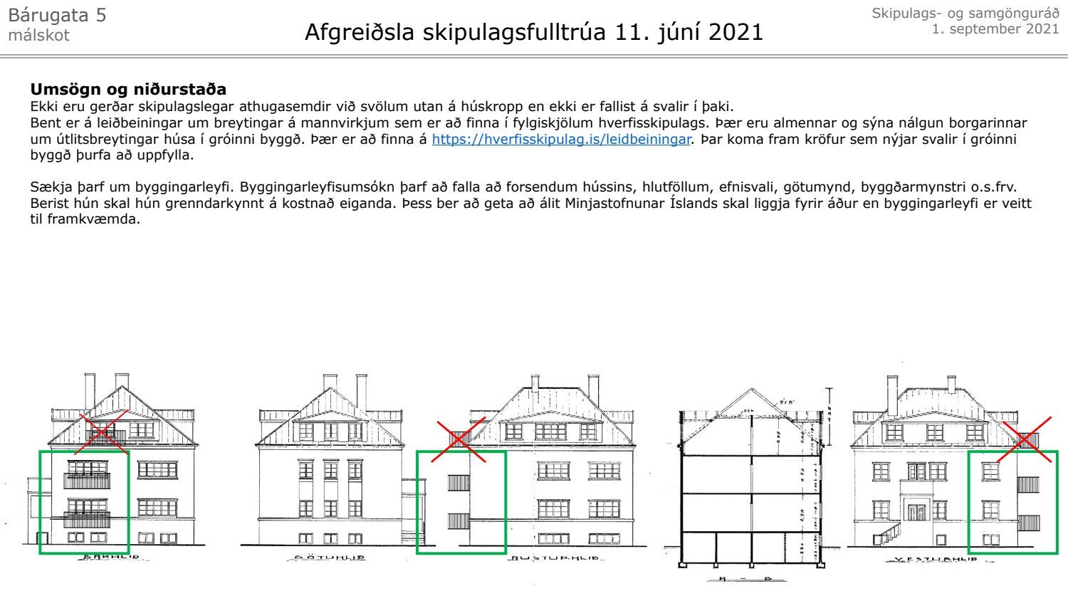 Lagt fram málskot Steinunnar Önnudóttur dags. 24. júní 2021 vegna afgreiðslu skipulagsfulltrúa frá 11. júní 2021 um að setja svalir 2. og 3. hæð hússins á lóð nr. 5 við Bárugötu. Einnig er lögð fram umsögn skipulagsfulltrúa, dags. 11. júní 2021.
