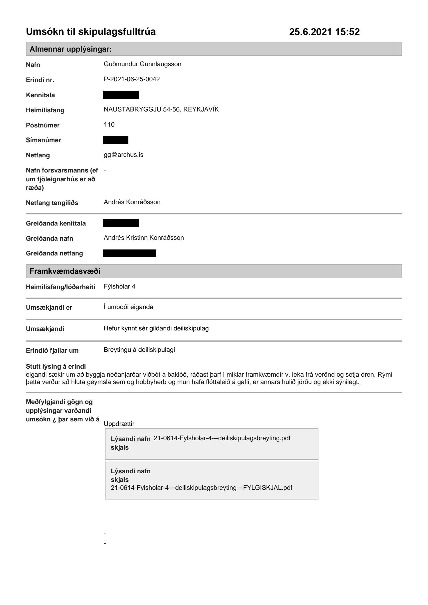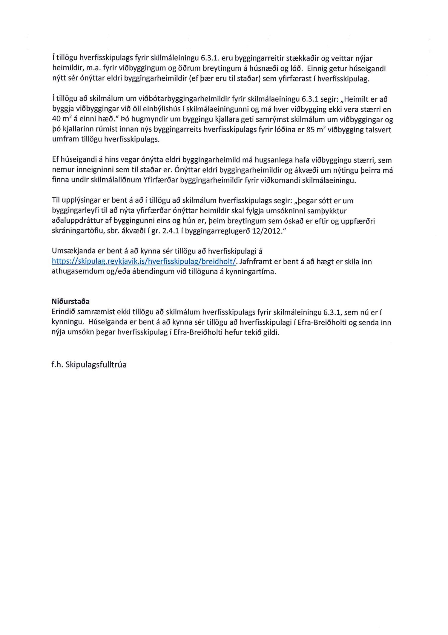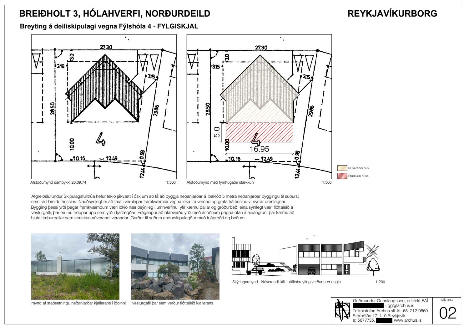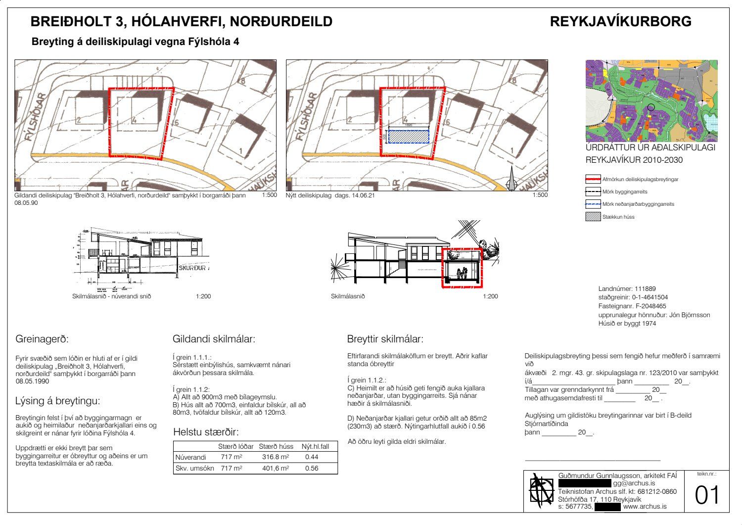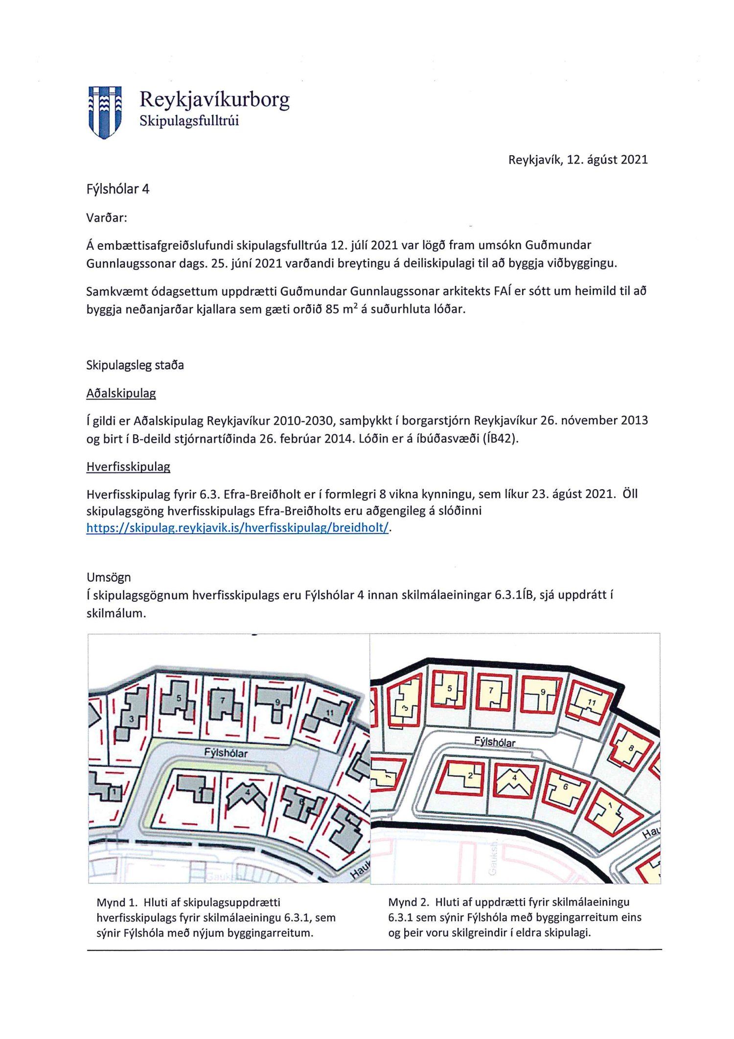 Lögð fram umsókn Guðmundar Gunnlaugssonar dags. 25. júní 2021 varðandi breytingu á deiliskipulagi Breiðholts 3, Hólahverfi vegna lóðarinnar nr. 4 Fýlshóla. Í breytingunni felst að heimilt verði að stækka kjallara hússins, samkvæmt uppdr. Guðmundar Gunnlaugssonar arkitekts FAÍ ódags. Við stækkunina eykst nýtingarhlutfall lóðar. Einnig er lögð fram umsögn skipulagsfulltrúa dags. 12. ágúst 2021.