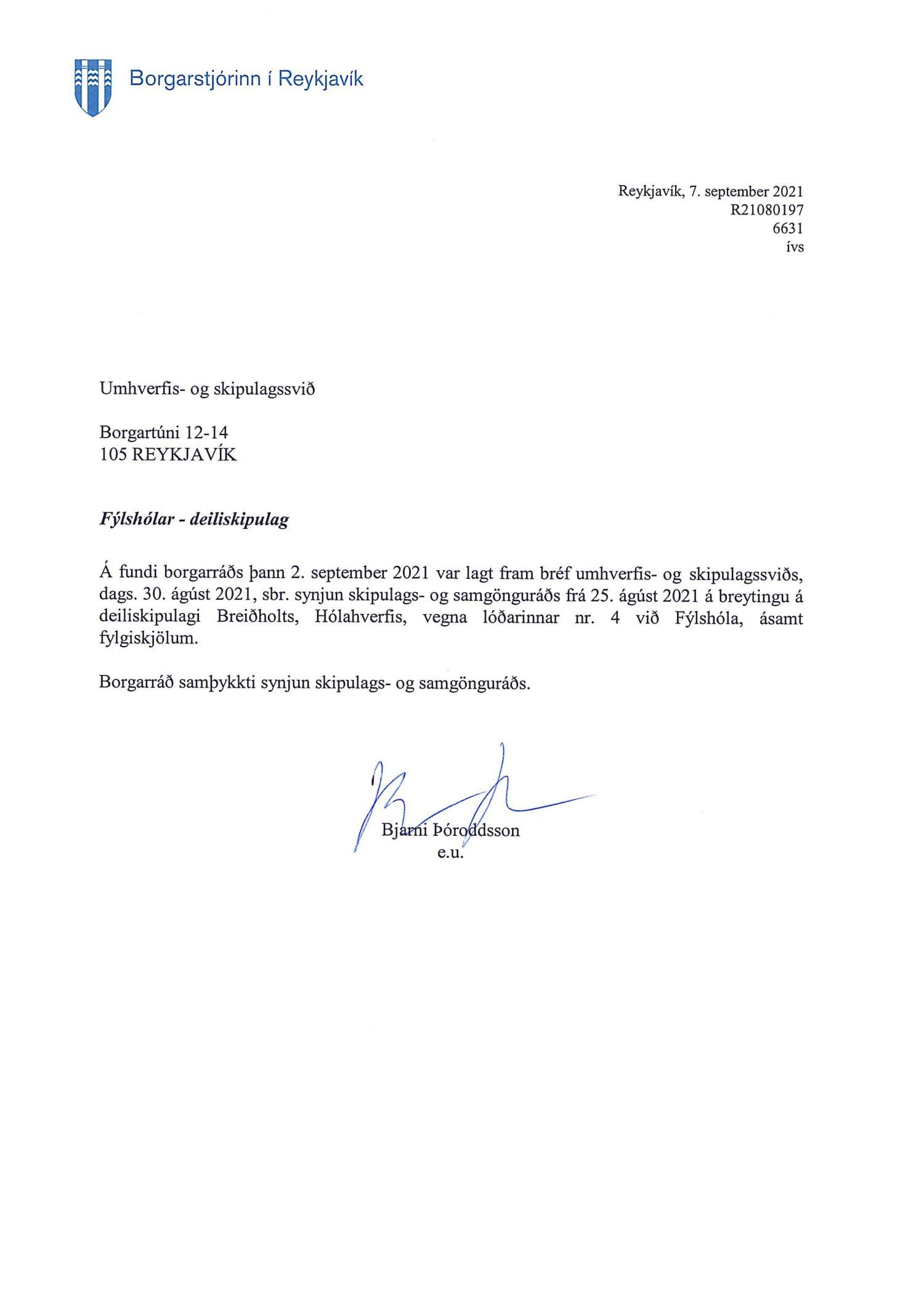 Lagt fram bréf borgarstjóra dags. 7. september 2021 vegna samþykktar borgarráðs frá 2. september 2021 á tillögu að breytingu á deiliskipulagi Breiðholts, Hólahverfis, vegna lóðarinnar nr. 4 við Fýlshóla.