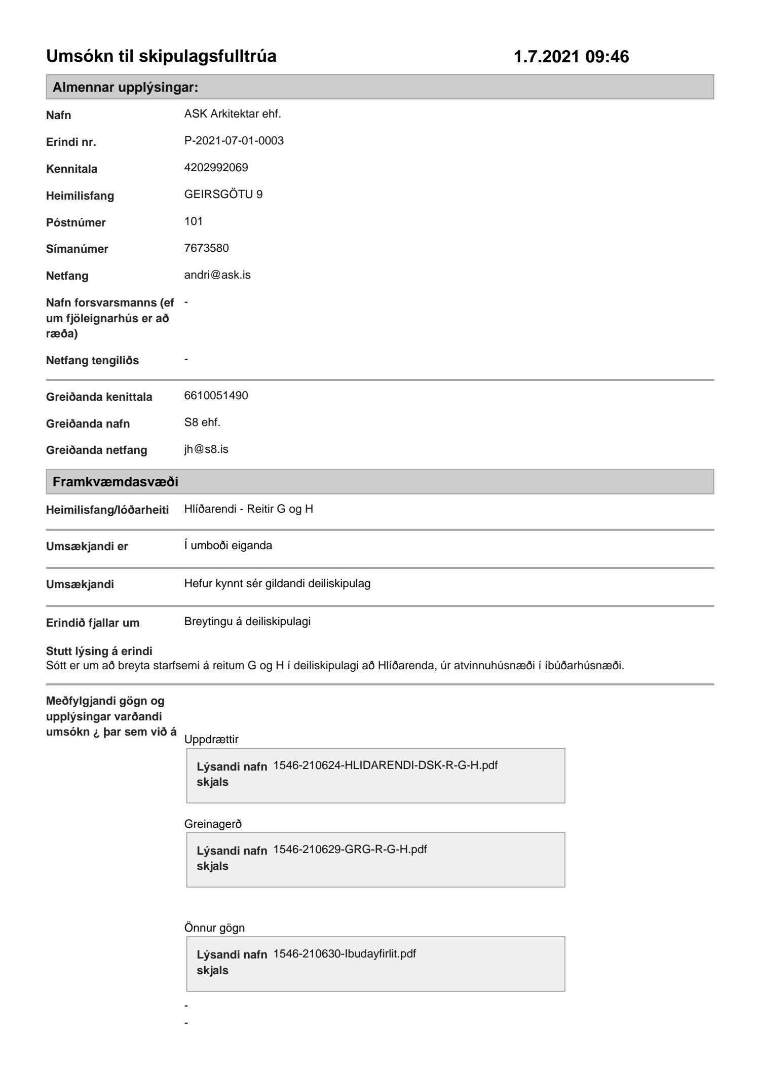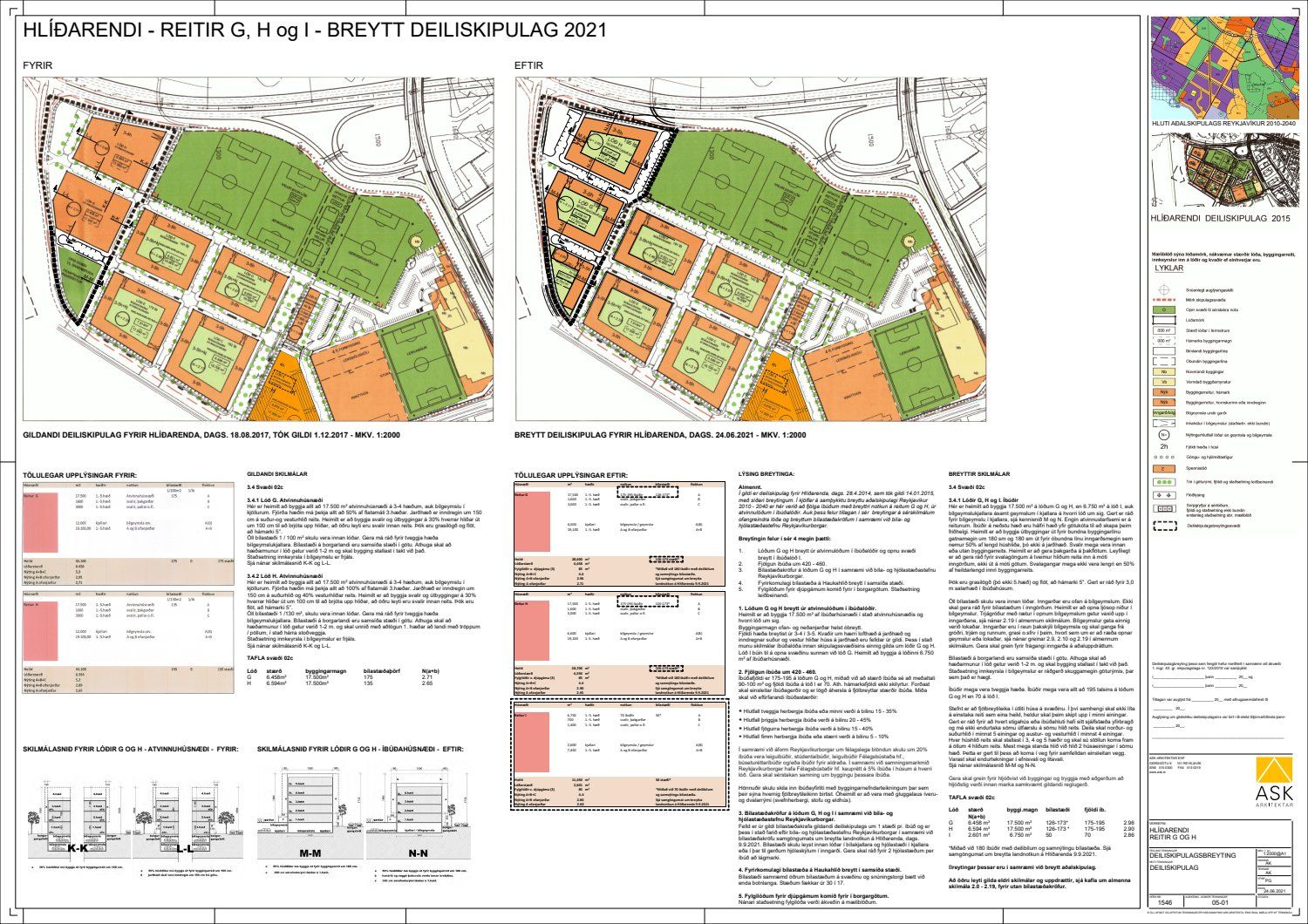 Lögð fram umsókn ASK Arkitekta dags. 1. júlí 2021 varðandi breytingu á deiliskipulagi Hlíðarenda vegna reita G, H og I. Í breytingunni felst að breyta lóðum G og H úr atvinnulóðum í íbúðalóðir, breyta opnu svæði til bráðabirgða í íbúðalóð ,I, fjölga íbúðum og breyta bílastæðakröfum til samræmis við bíla- og hjólastæðastefnu Reykjavíkurborgar, samkvæmt uppdrætti