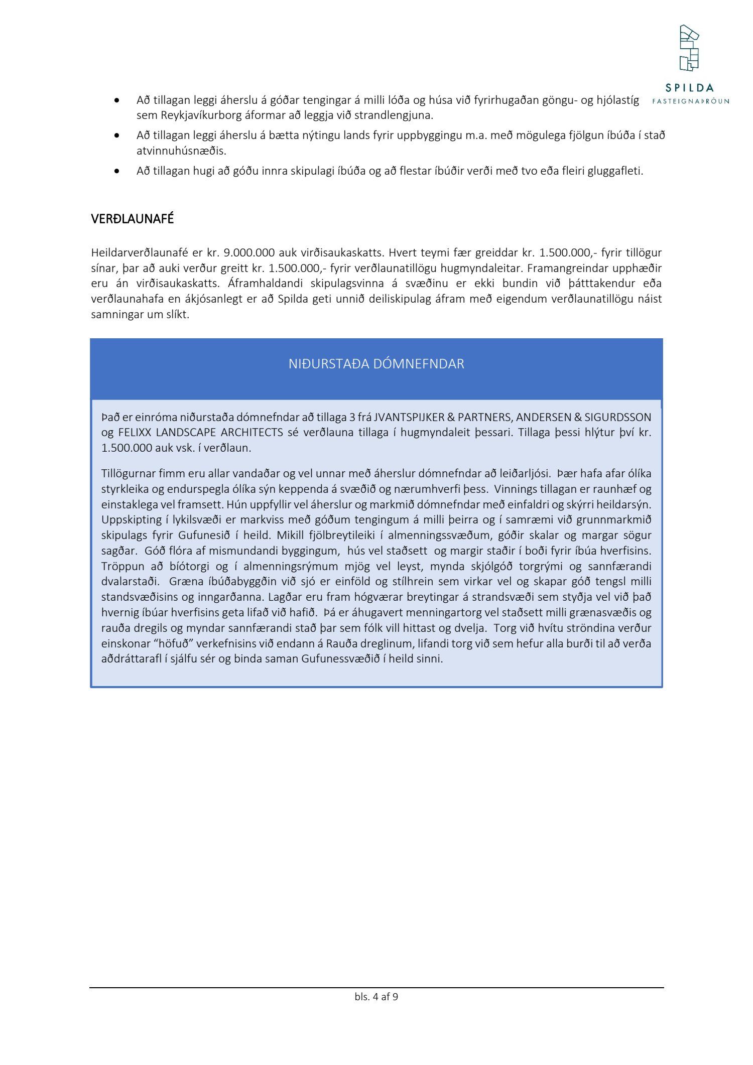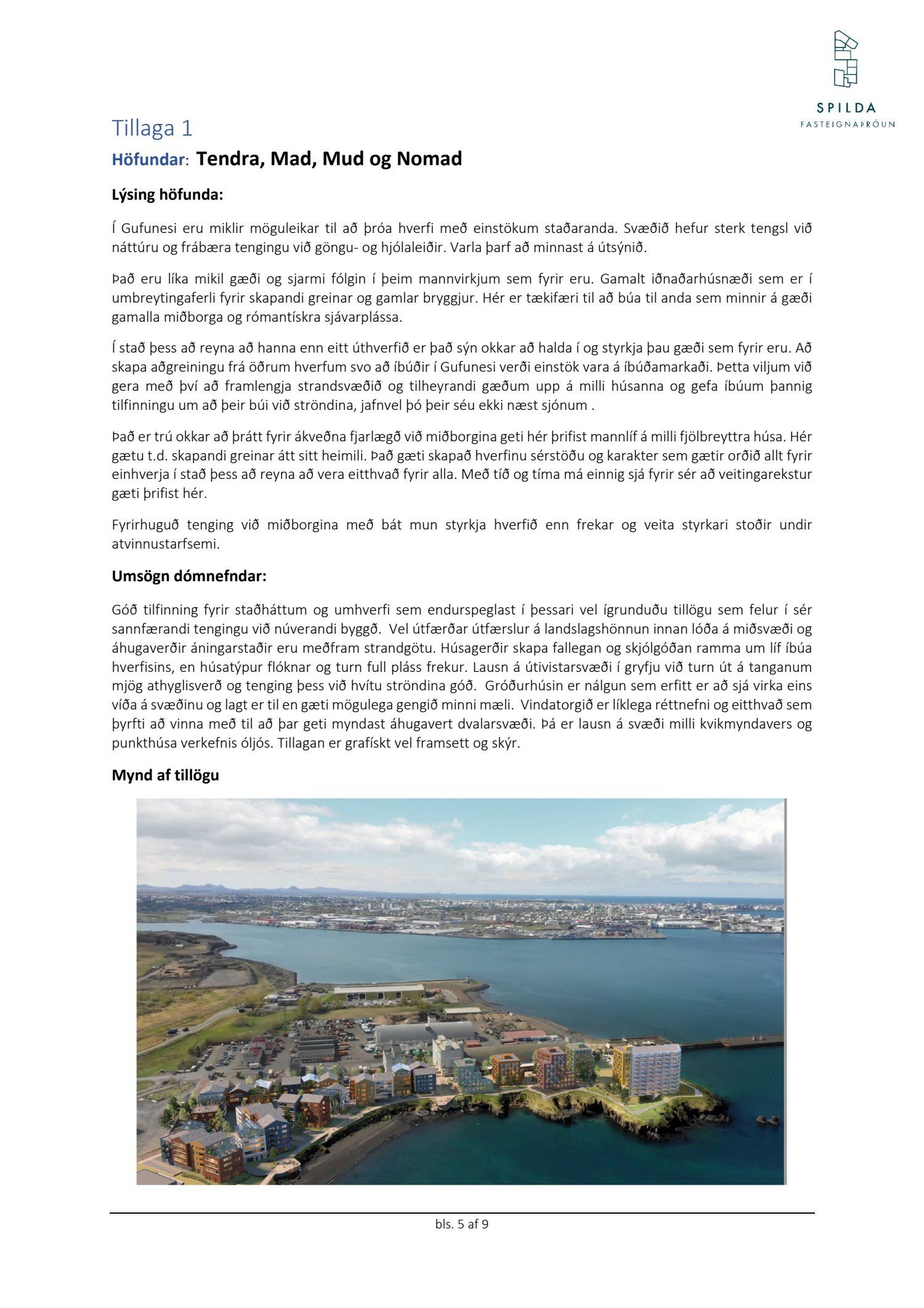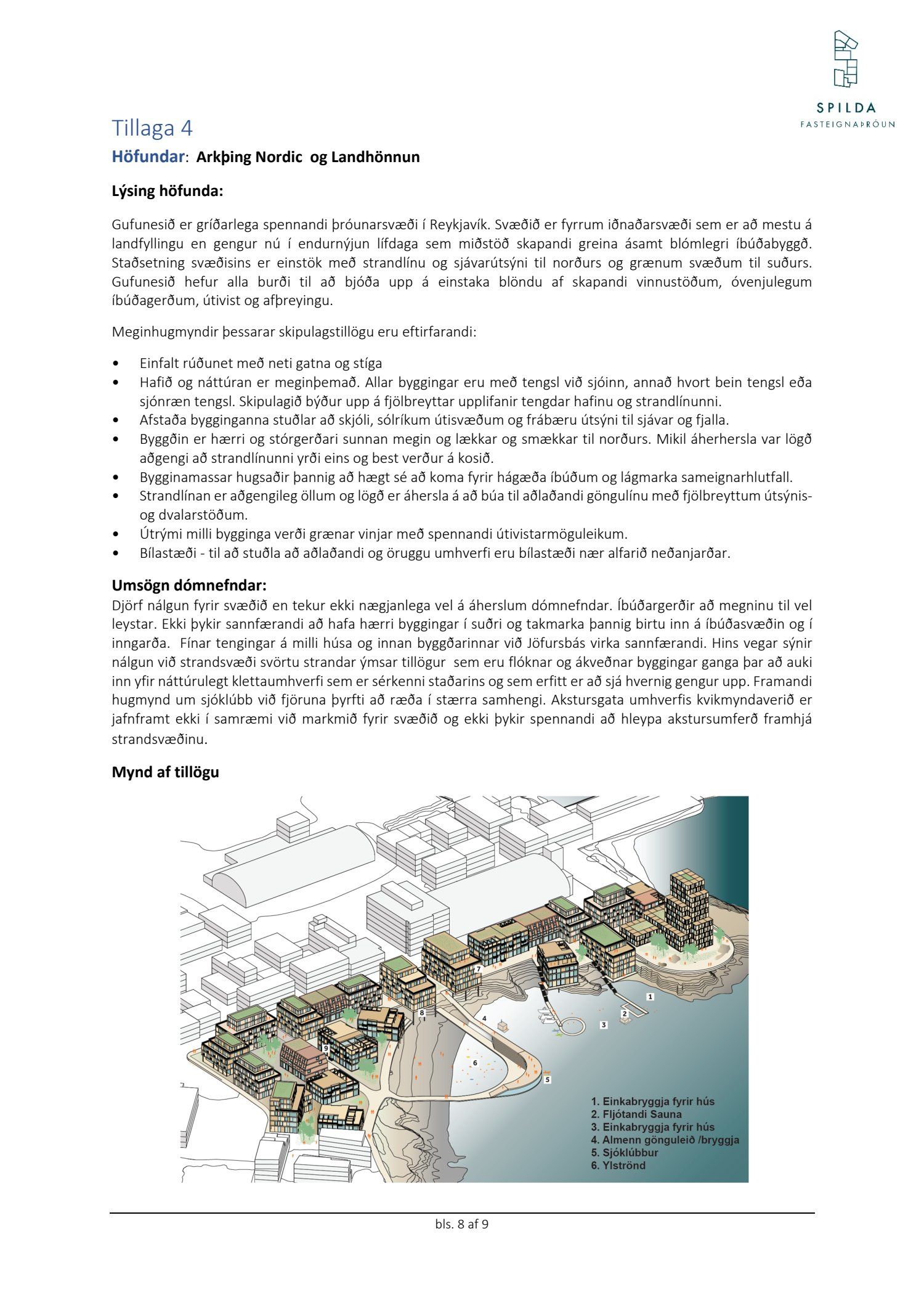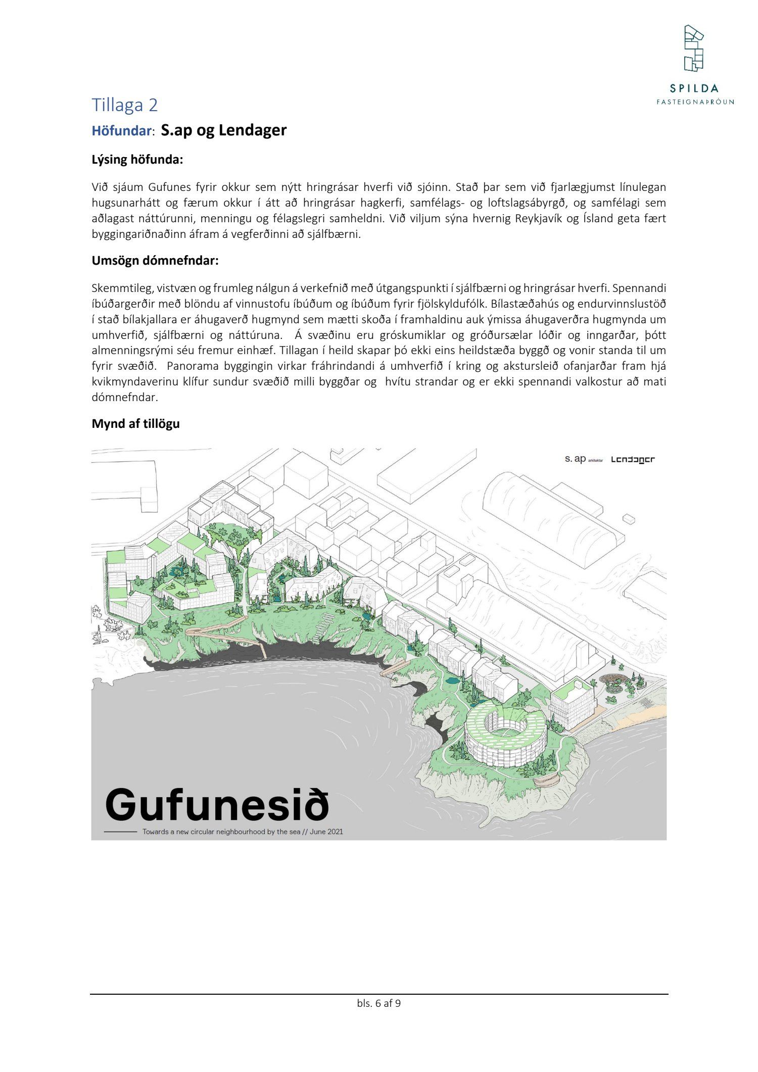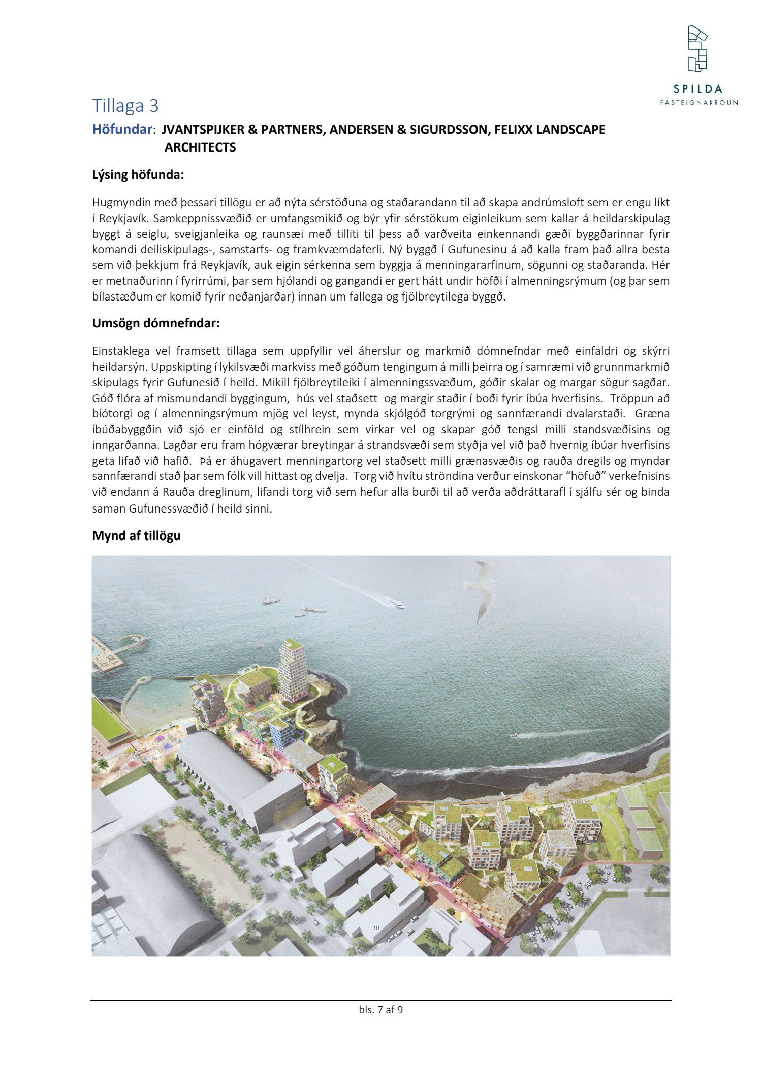 Lagðar eru fram tillögur í hugmyndaleit Spildu ehf. í samstarfi við AÍ um framtíðaruppbyggingu og skipulag átta lóða í eigu Spildu ehf. við sjávarsíðuna í Gufunesi. Niðurstöður hugmyndaleitar voru kynntar í júní. Í hugmyndaleitinni var óskað eftir að heildarmynd væri á uppbyggingu lóða með góðri tengingu við göngustígakerfi Reykjavíkurborgar. Leitast var eftir tillögum sem myndu sýna ákveðið heildaryfirbragð; vönduð og góð byggingarlist sem yrði aðlöguð að umhverfinu með áherslu á yfirbragð svæðisins og að nýbyggingar uppfylli á hagkvæman hátt kröfur og hugmyndafræði forsagnar. Niðurstaða dómnefndar var að tillaga frá JVANTSPIJKER & PARTNERS, ANDERSEN & SIGURDSSON og FELIXX LANDSCAPE ARCHITECTS yrði verðlaunatillagan í hugmyndaleitinni.