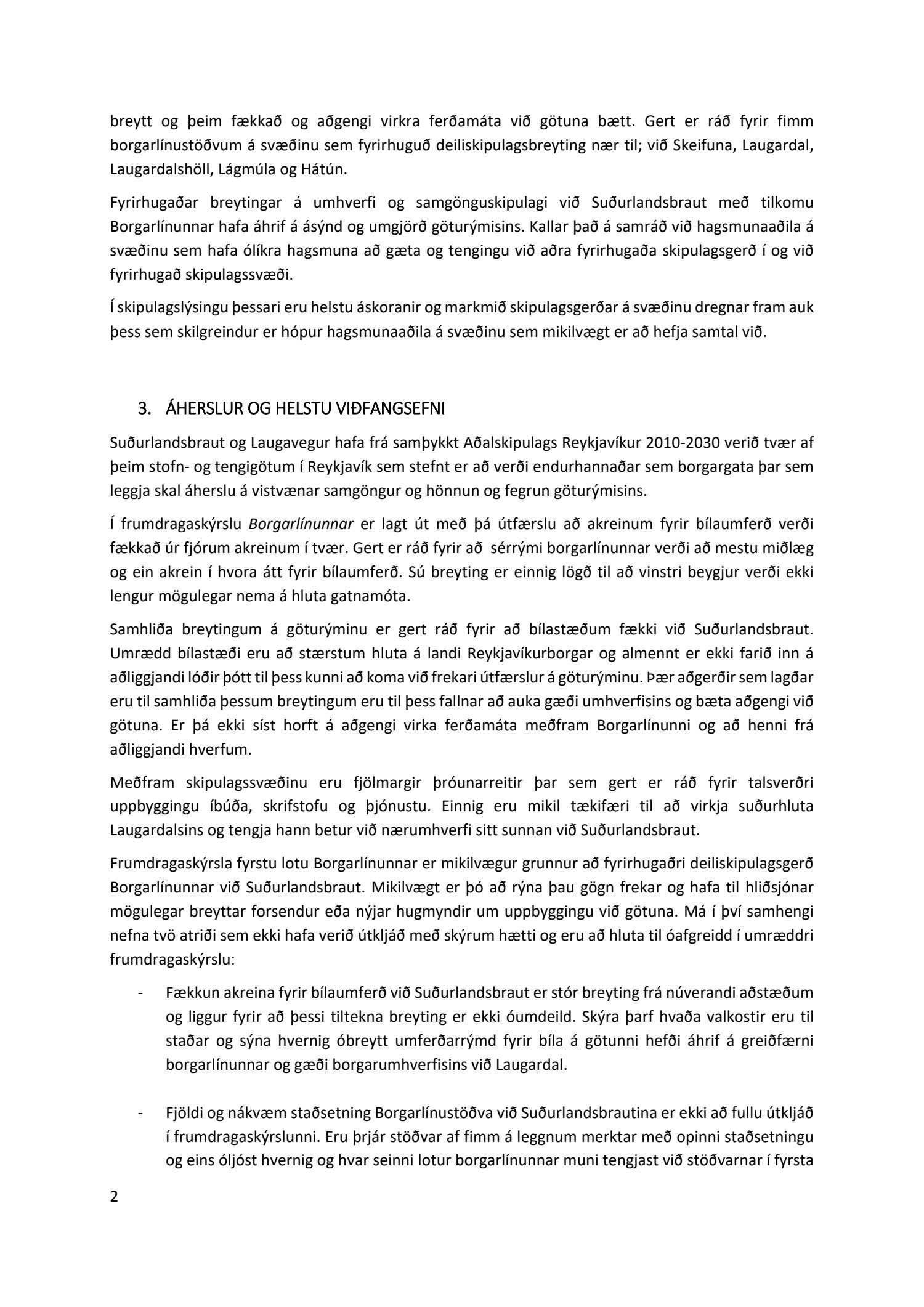 Við fögnum næsta áfanga í skipulagsvinnu vegna Borgarlínu sem snýst um að skapa græna borg með valfrelsi í ferðamátum. Skipulag og samgönguinnviðir geta mótað venjur íbúa að miklu leyti og þar sem loftslagsmálin eru stærsta áskorun okkar tíma verður hið opinbera að axla sína mikilvægu ábyrgð, meðal annars með uppbyggingu hágæða almenningssamgangna og innviða fyrir virka ferðamáta. Skipulagslýsingin er undanfari deiliskipulags Borgarlínu eftir Suðurlandsbraut. Umræddur kafli gegnir lykilhlutverki í því að Borgarlínan í heild sinni verði hágæða BRT-kerfi. Mikilvægt er að leggja ríka áherslu þau gæðaviðmið í deiliskipulagsvinnunni framundan. Við leggjum mikla áherslu á að Borgarlínan á að njóta forgangs þegar kemur að plássnotkun, í borgarrými og við gatnamót.