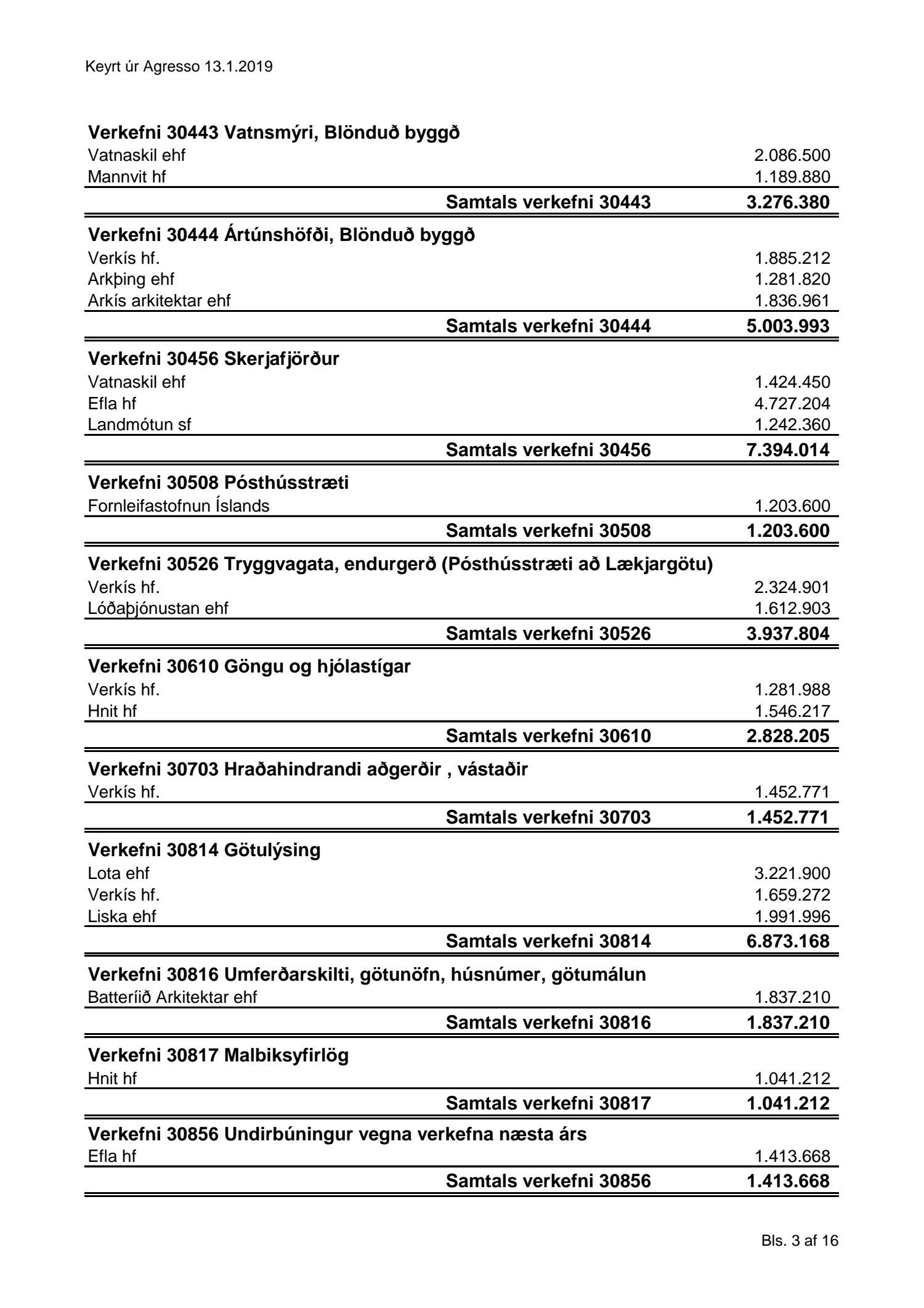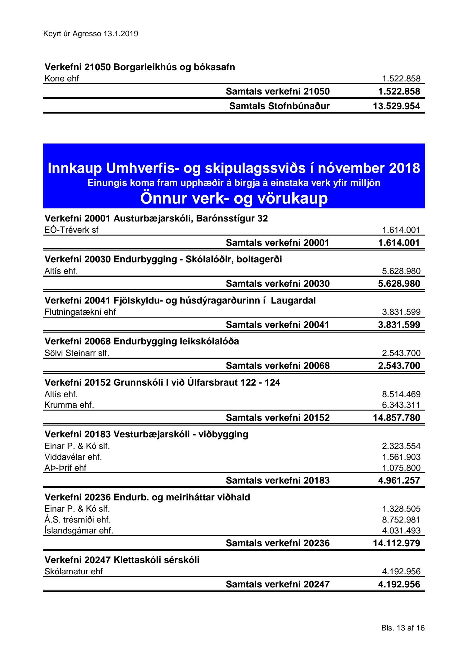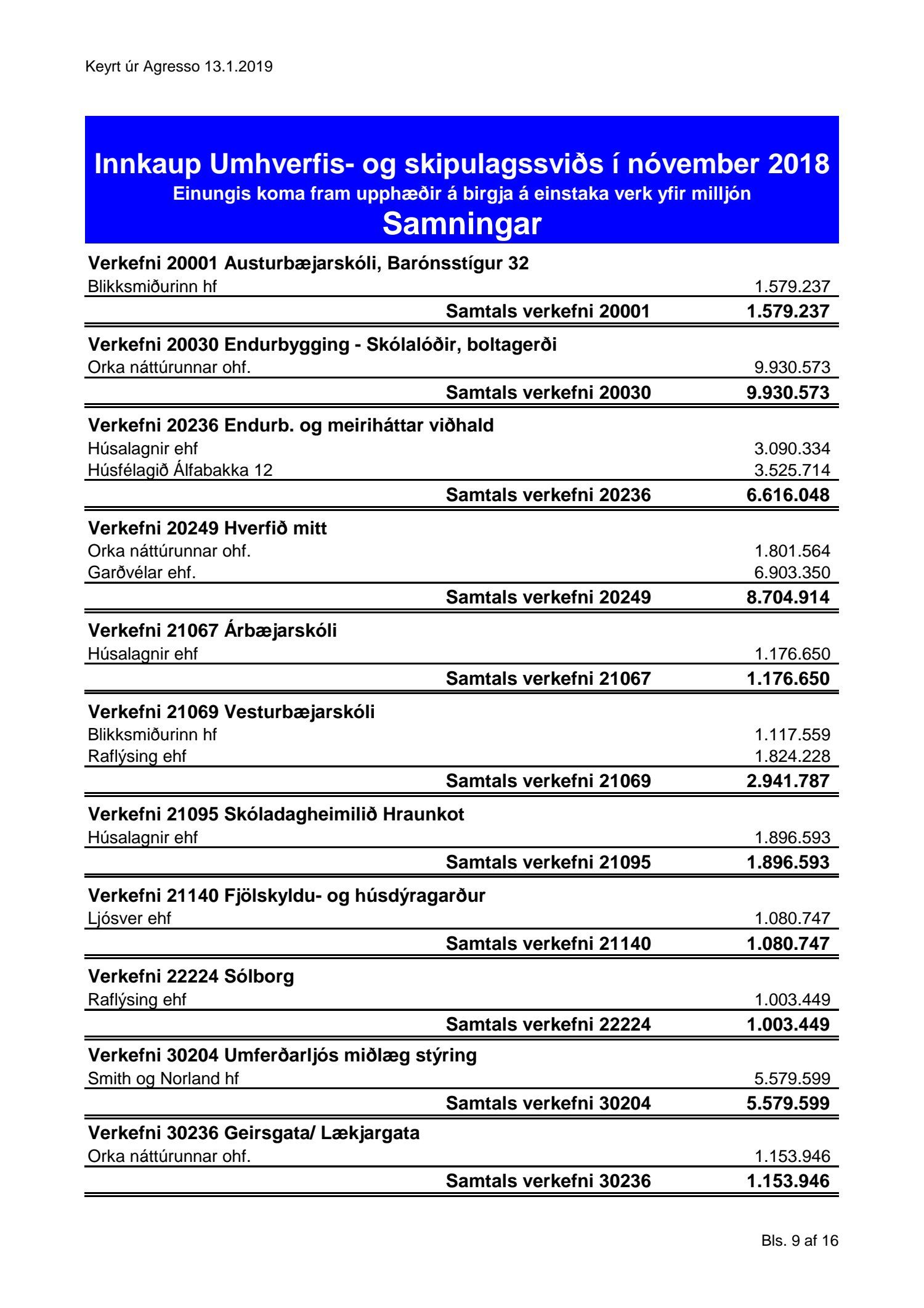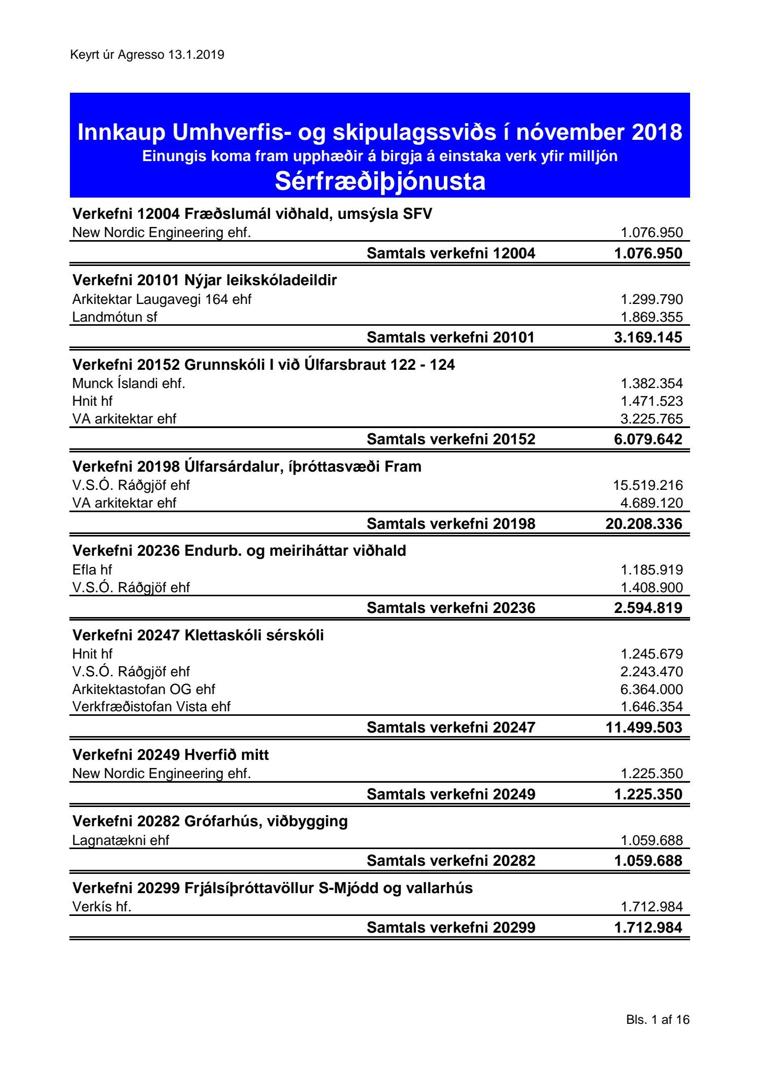 Lagt fram yfirlit yfir innkaup umhverfis- og skipulagssviðs á verkum yfir milljón í nóvember 2018.
