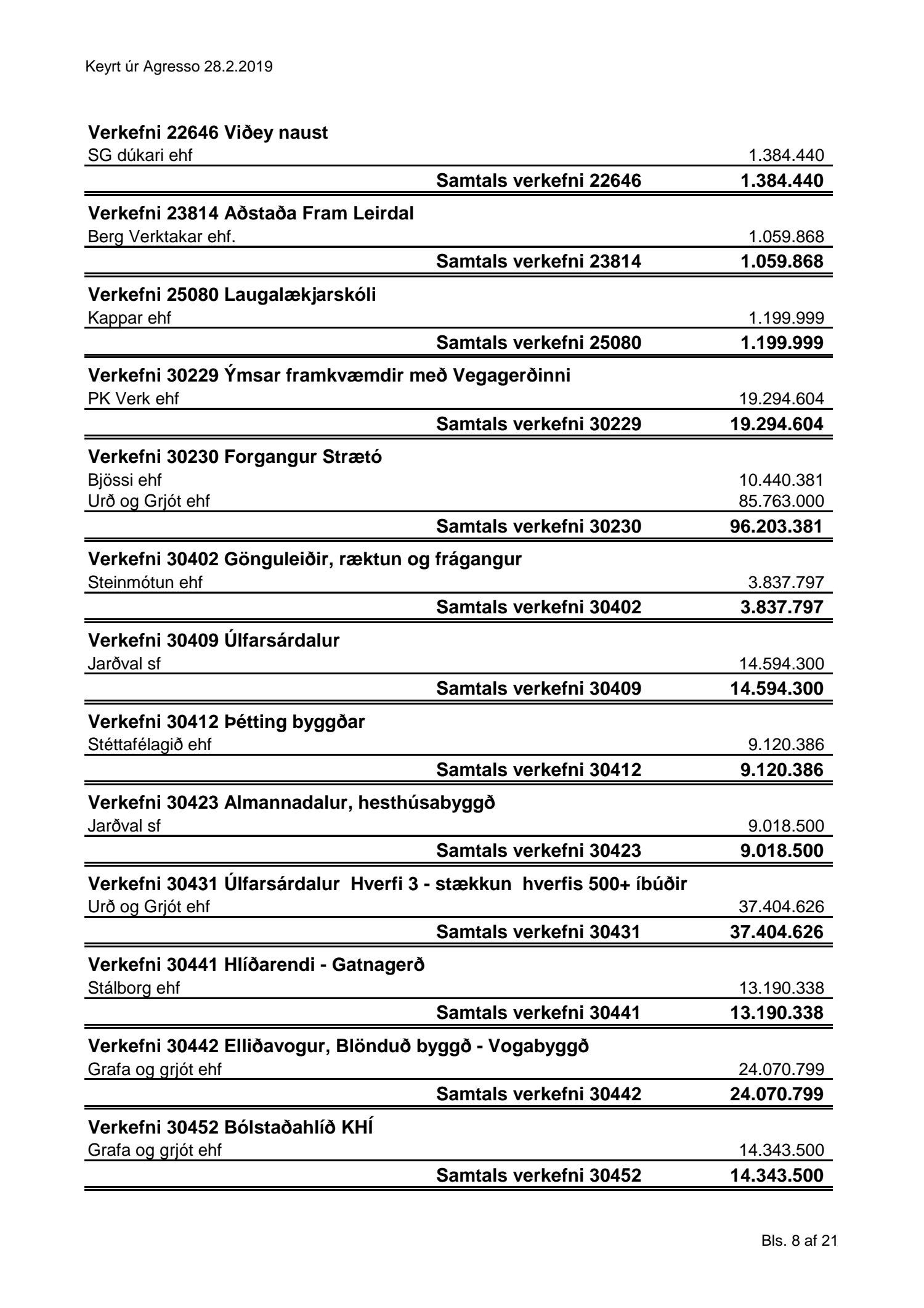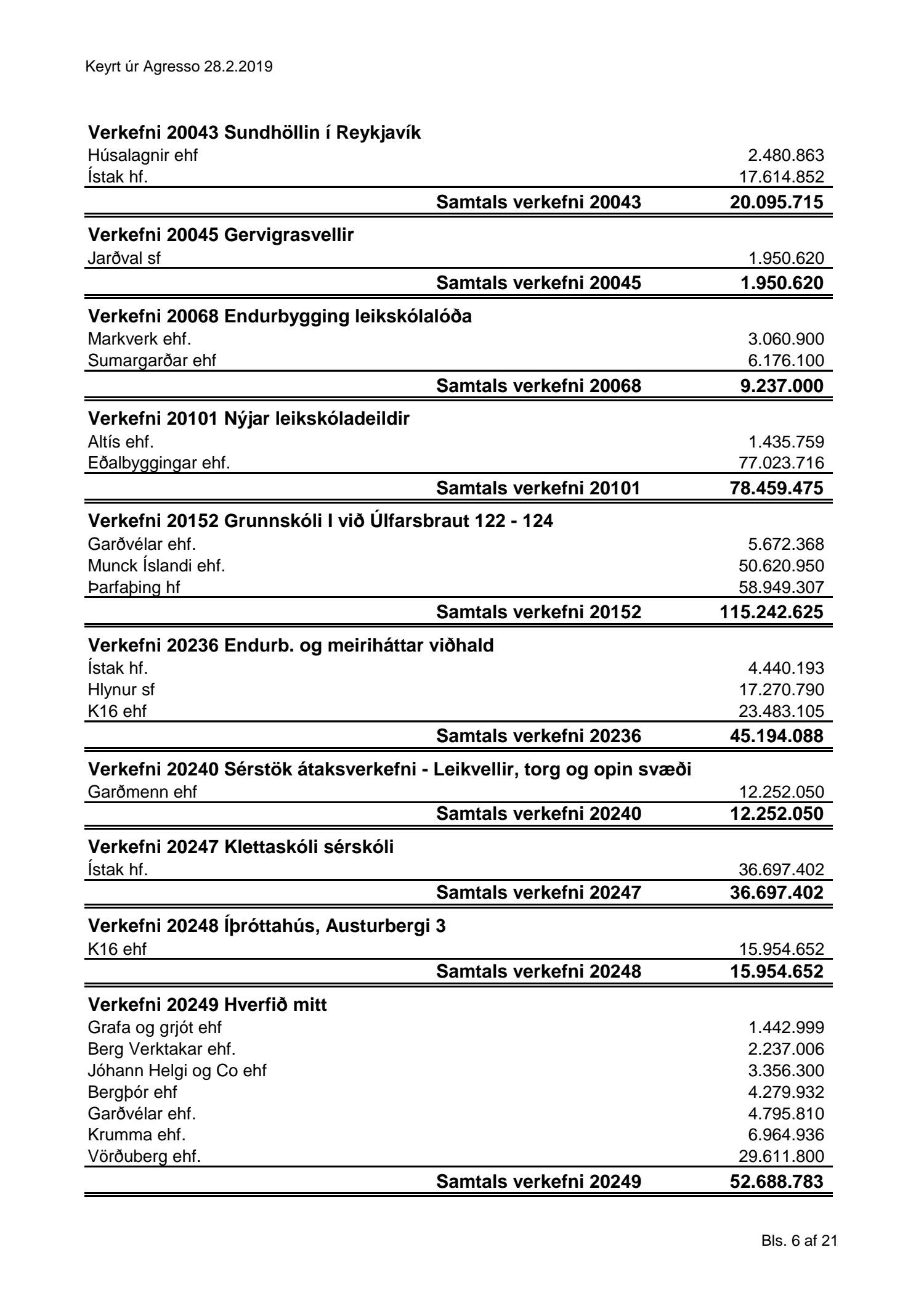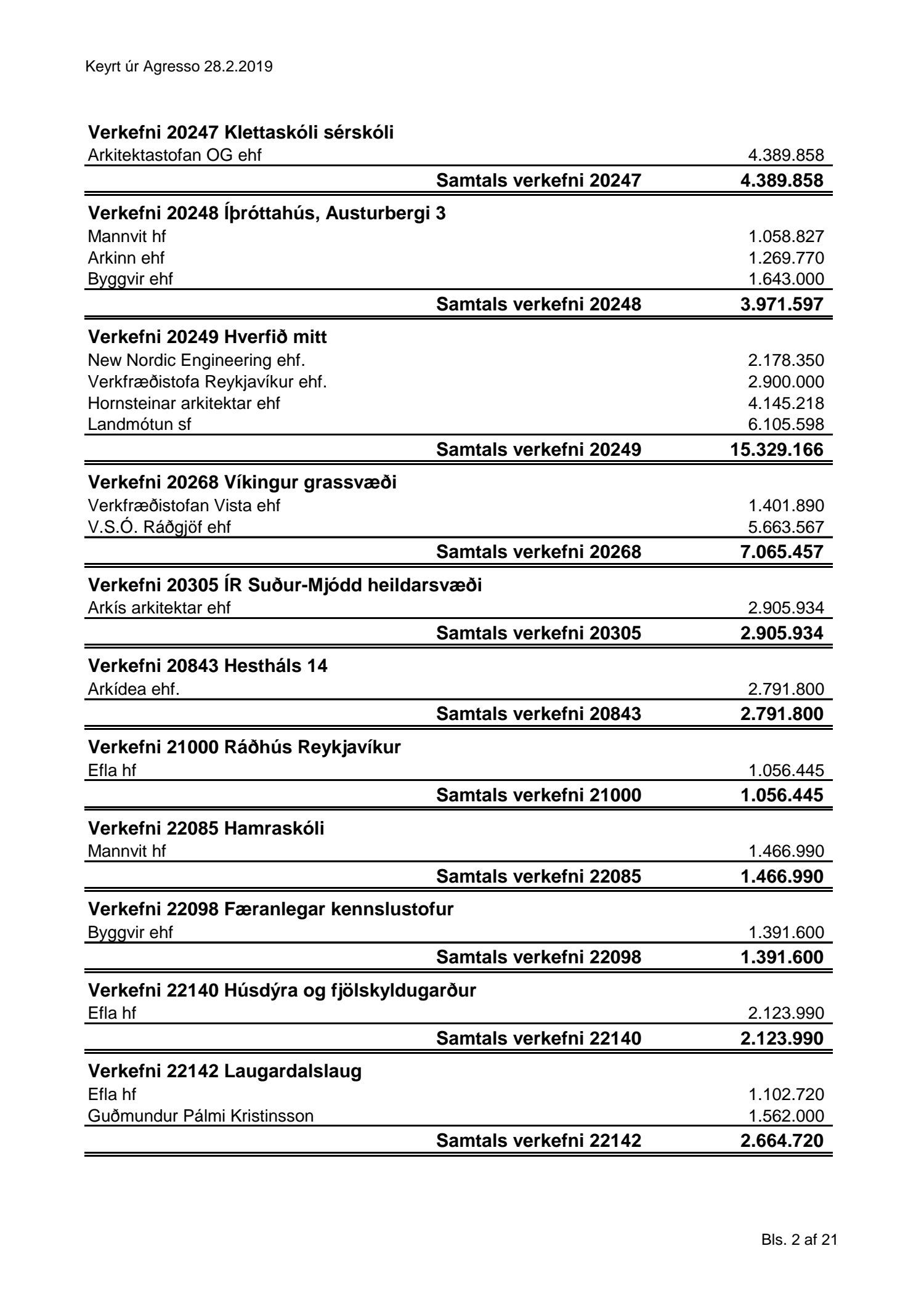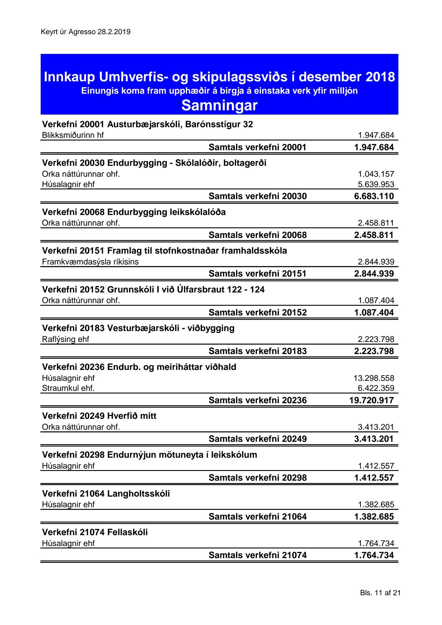 Umhverfis- og skipulagssvið, yfirlit yfir innkaup