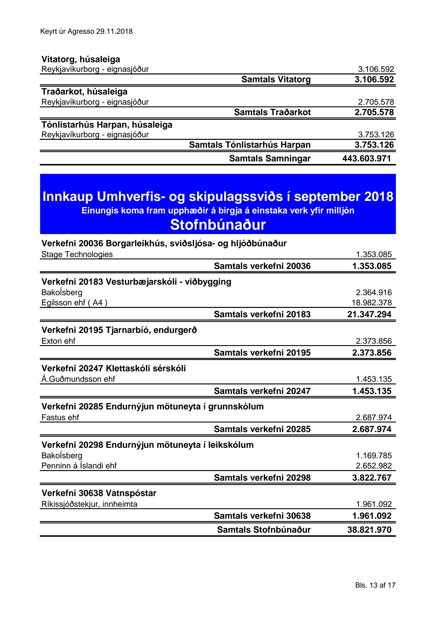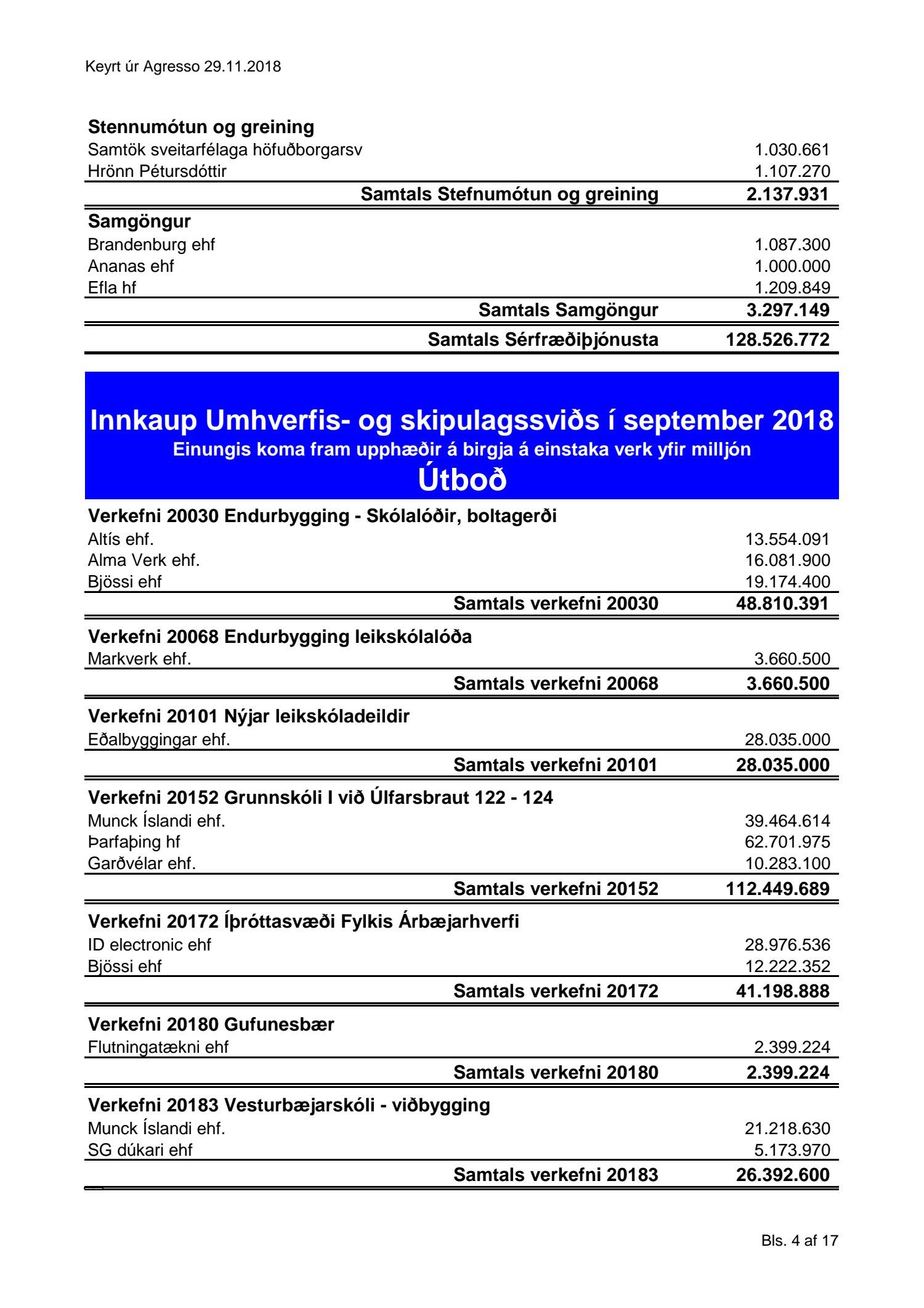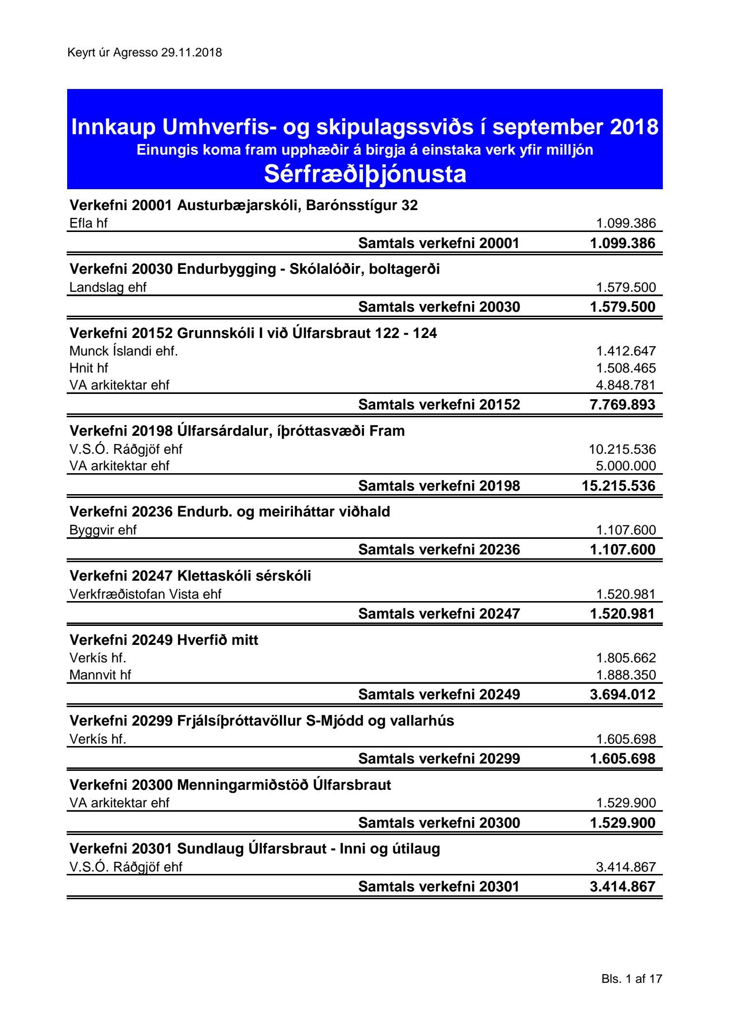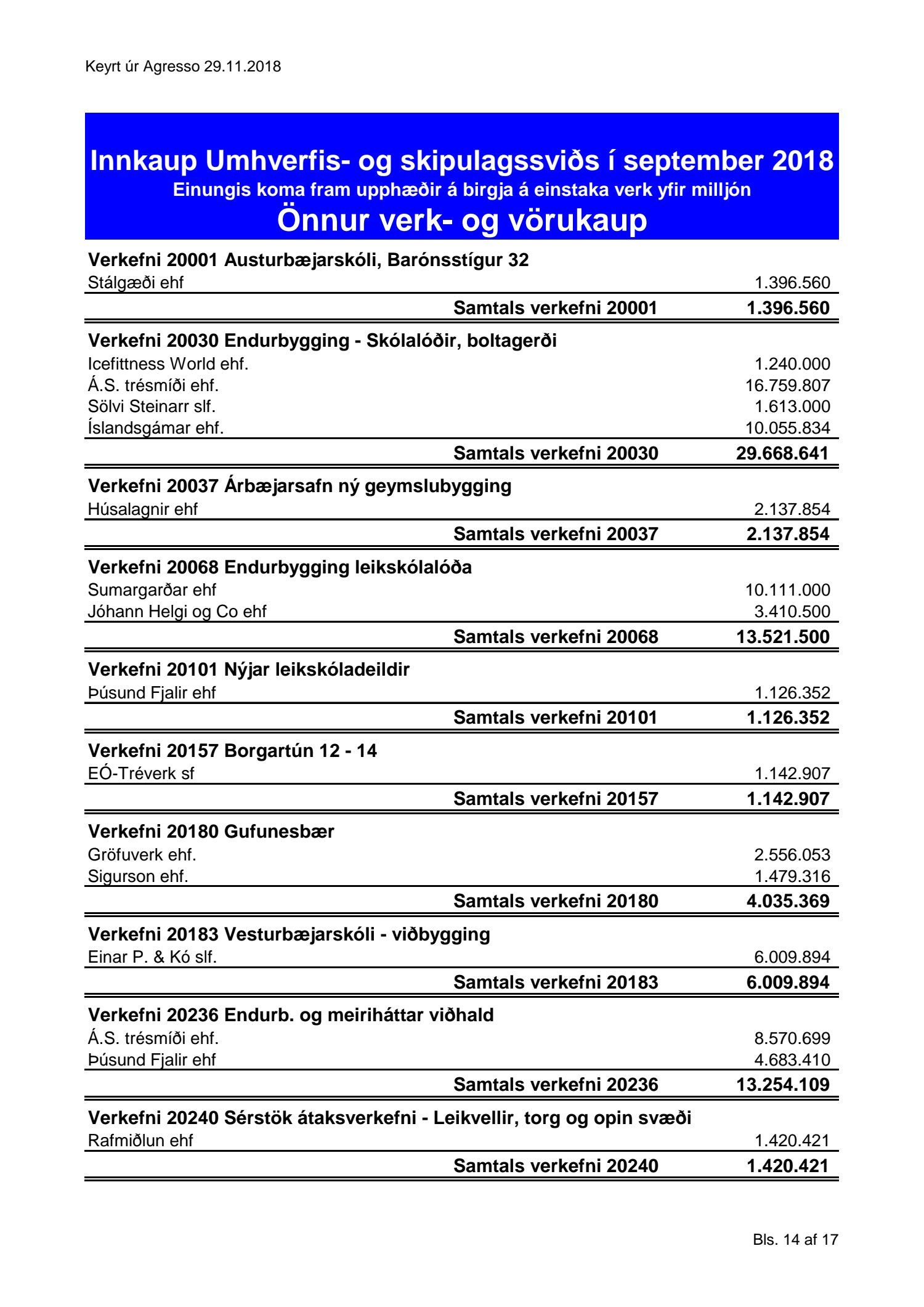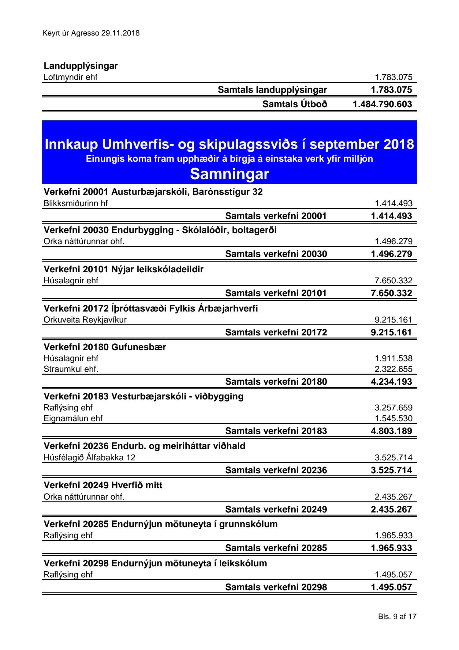 Umhverfis- og skipulagssvið, yfirlit yfir innkaup