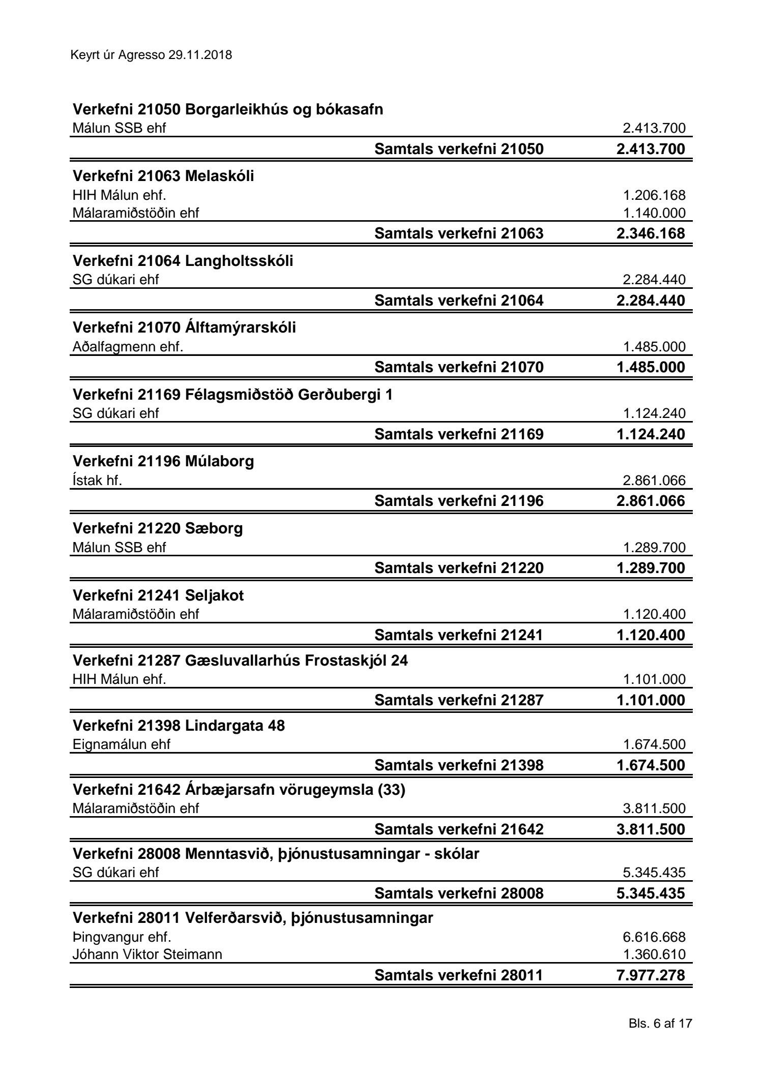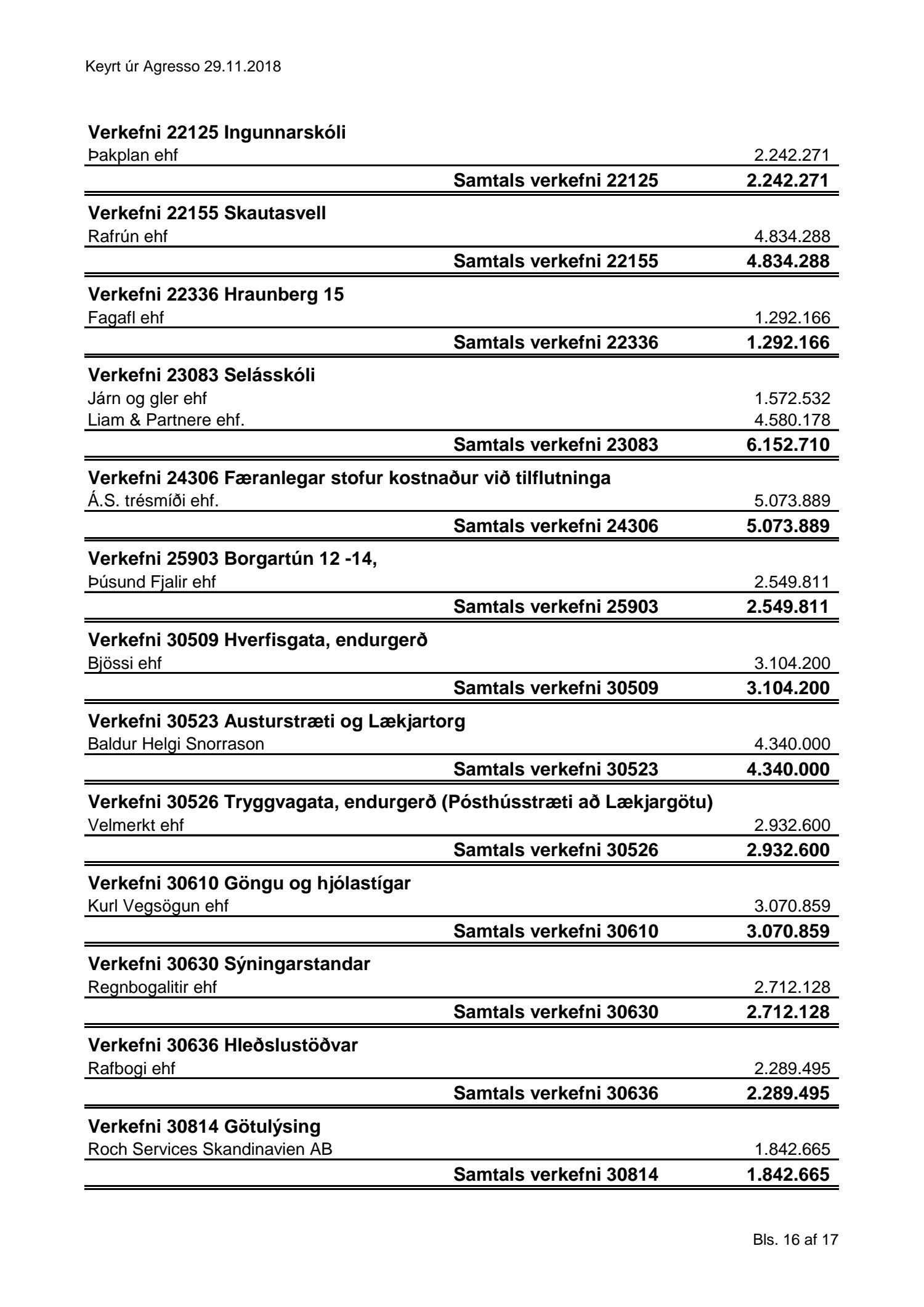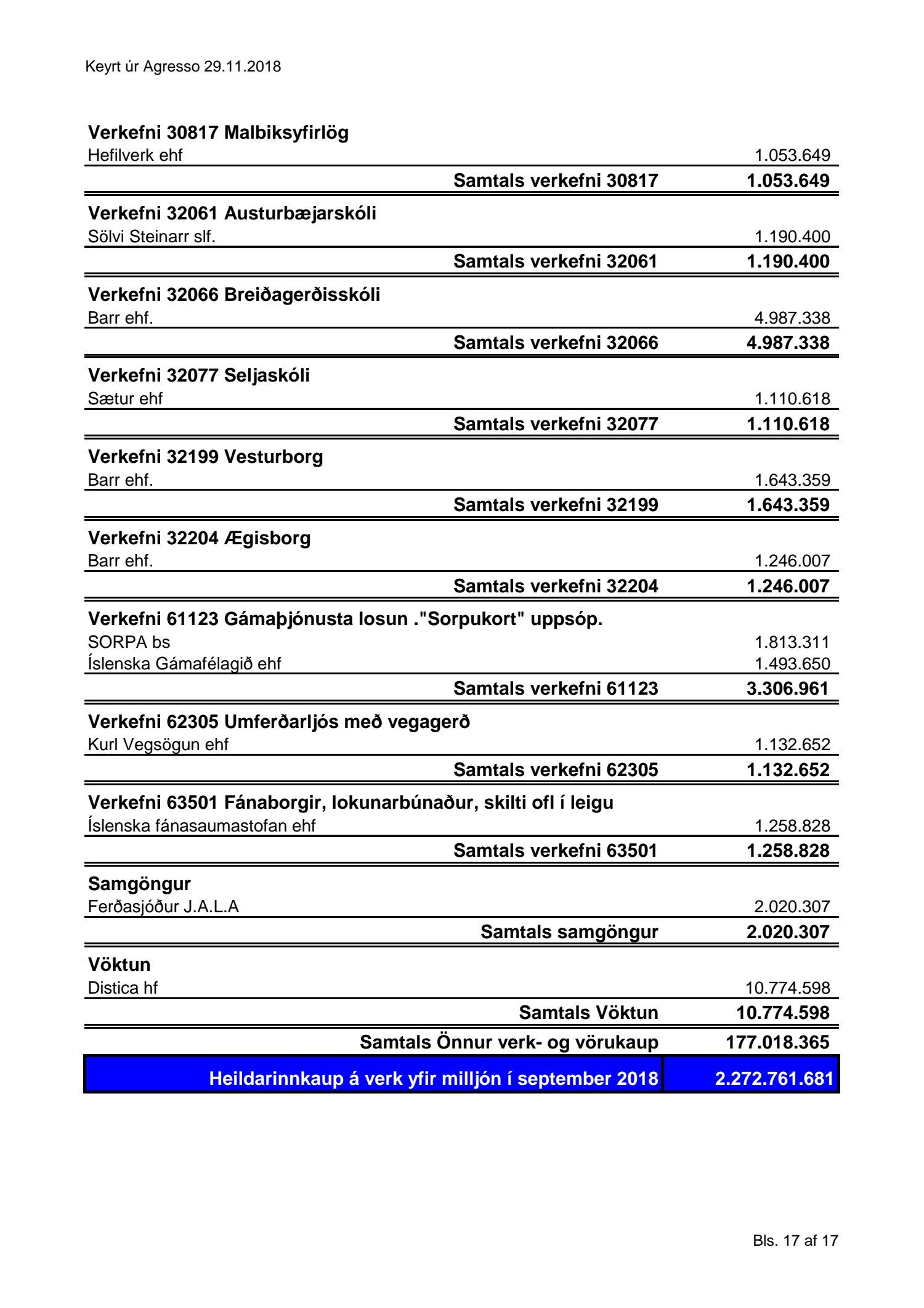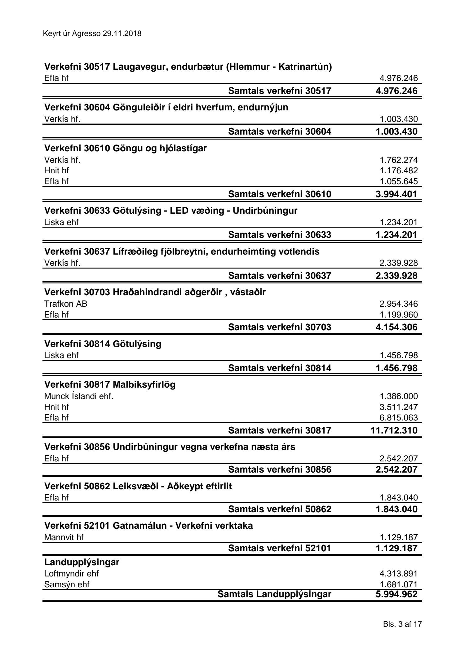 Umhverfis- og skipulagssvið, yfirlit yfir innkaup