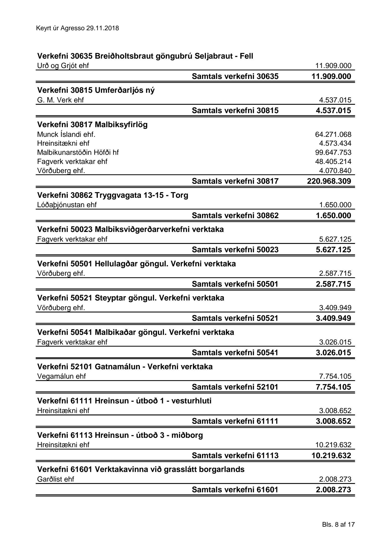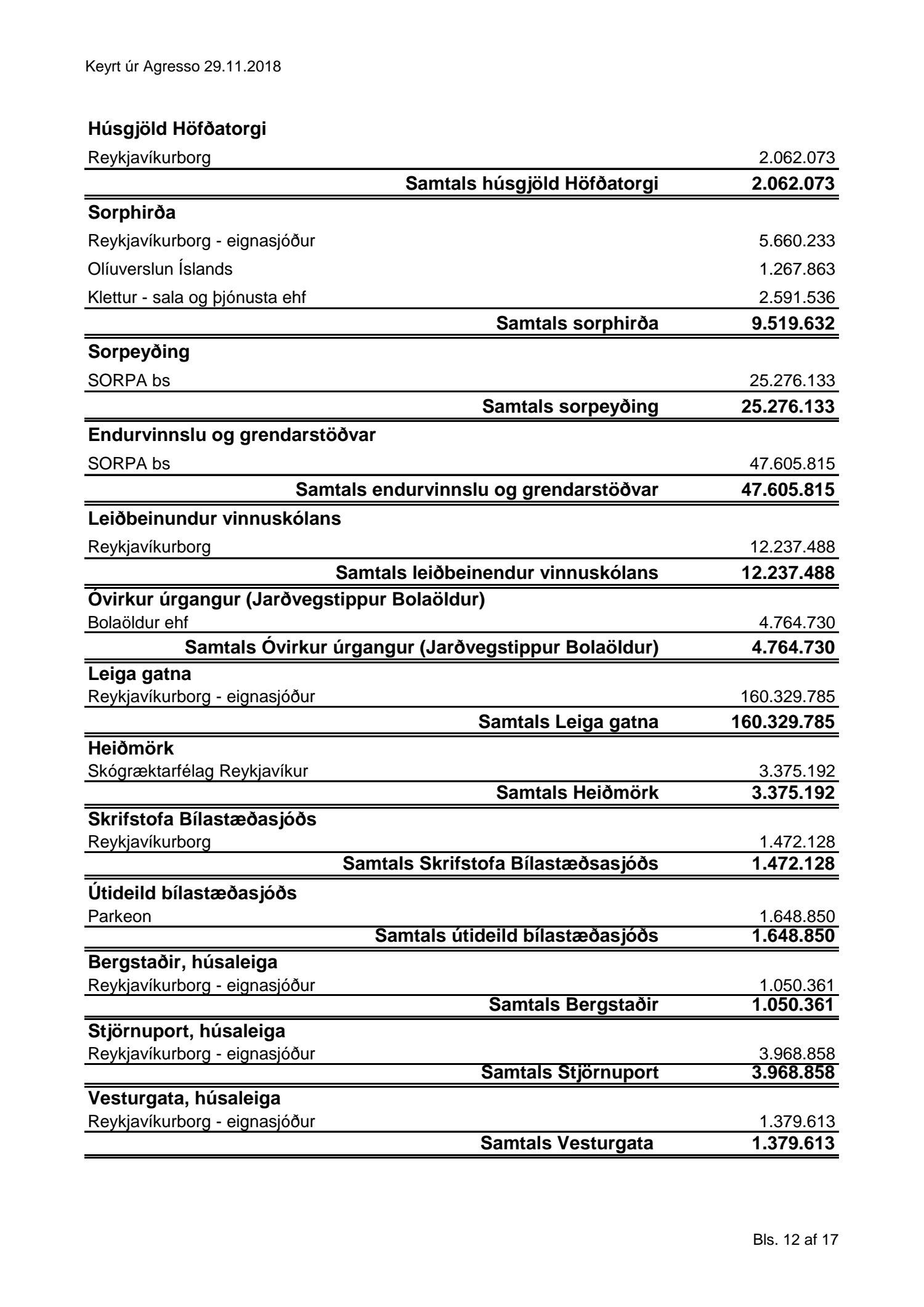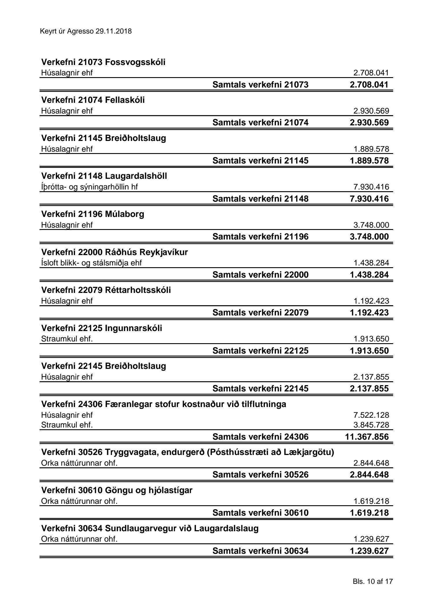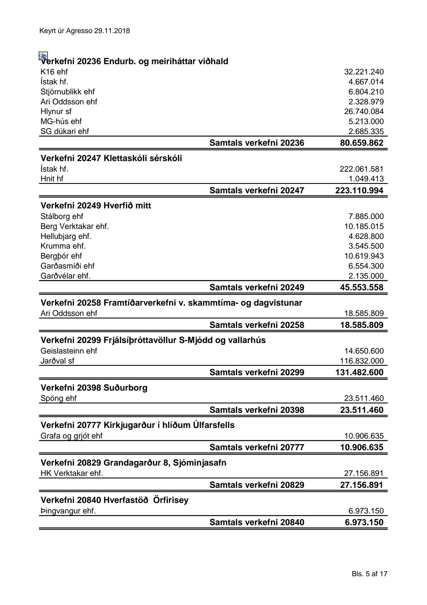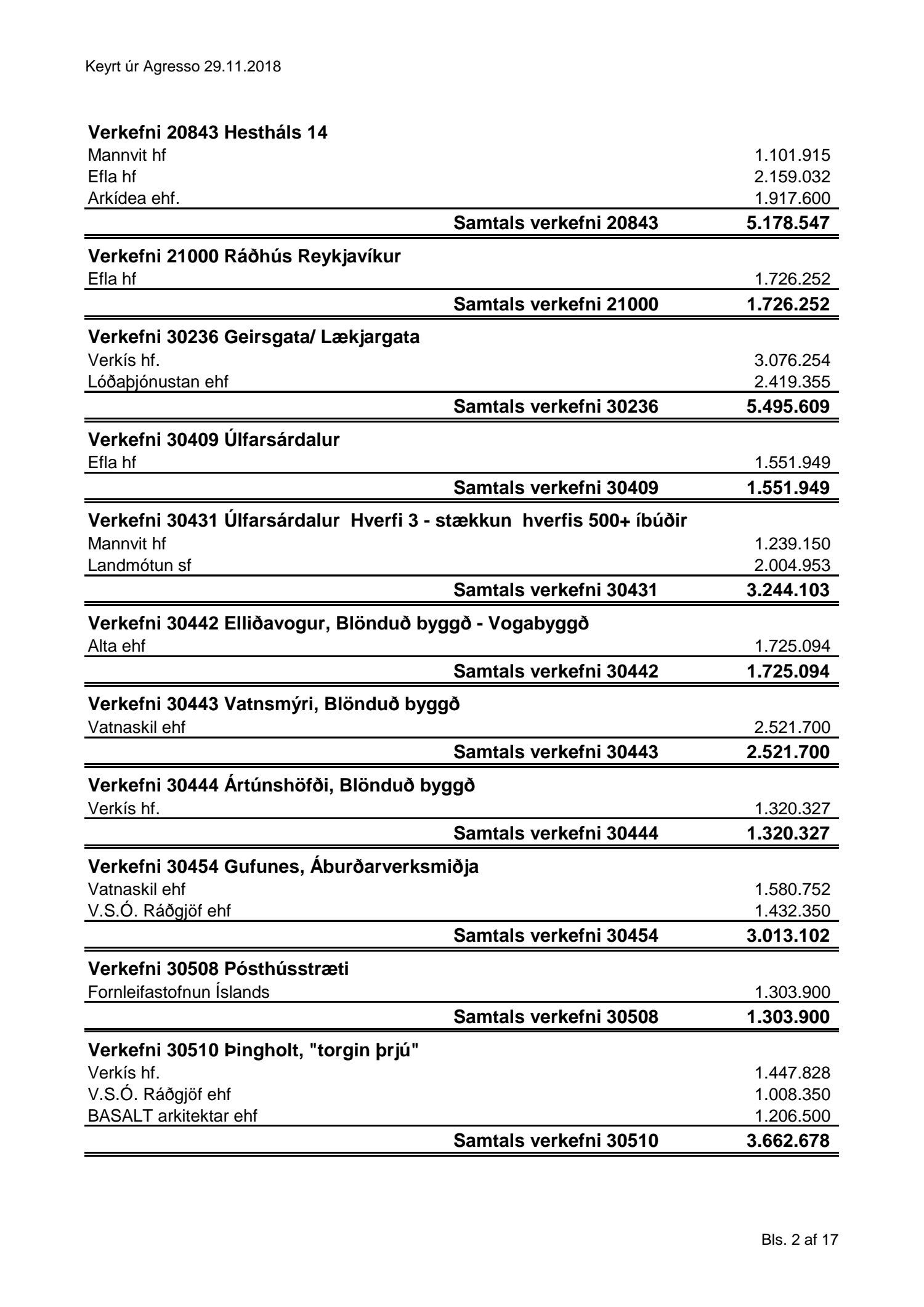 Umhverfis- og skipulagssvið, yfirlit yfir innkaup