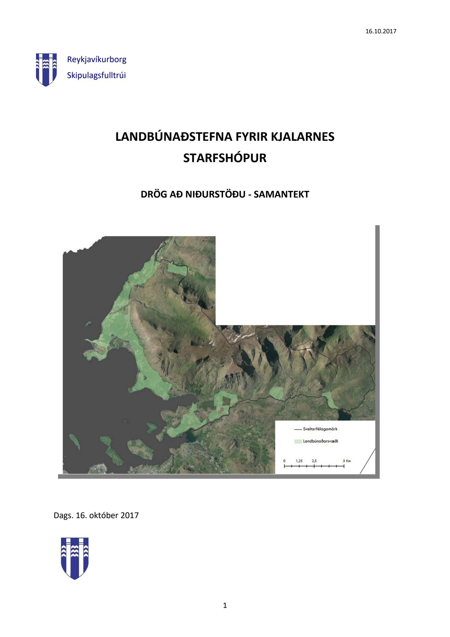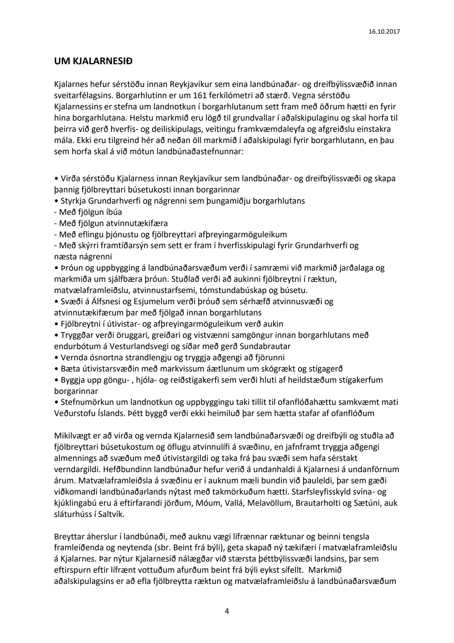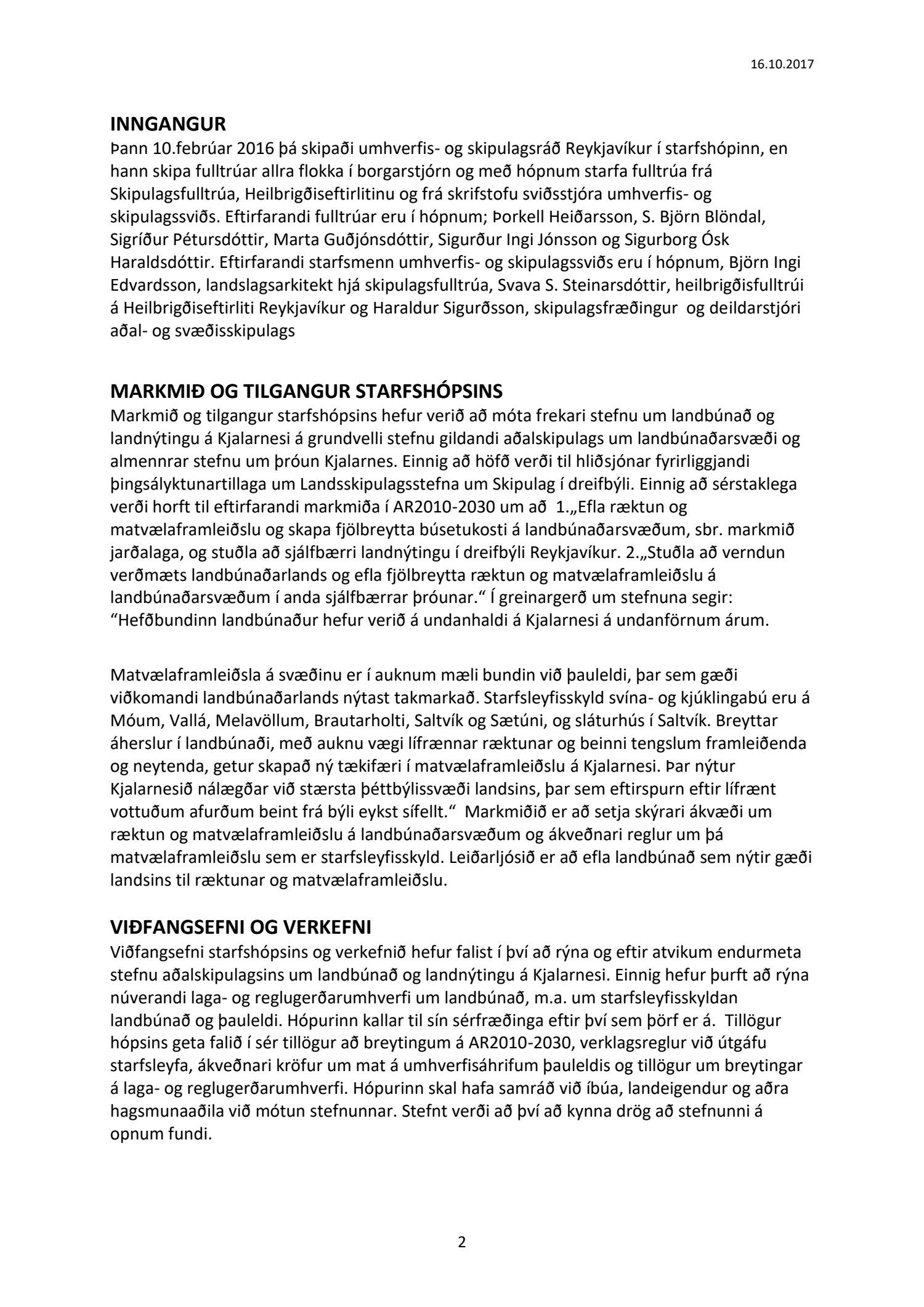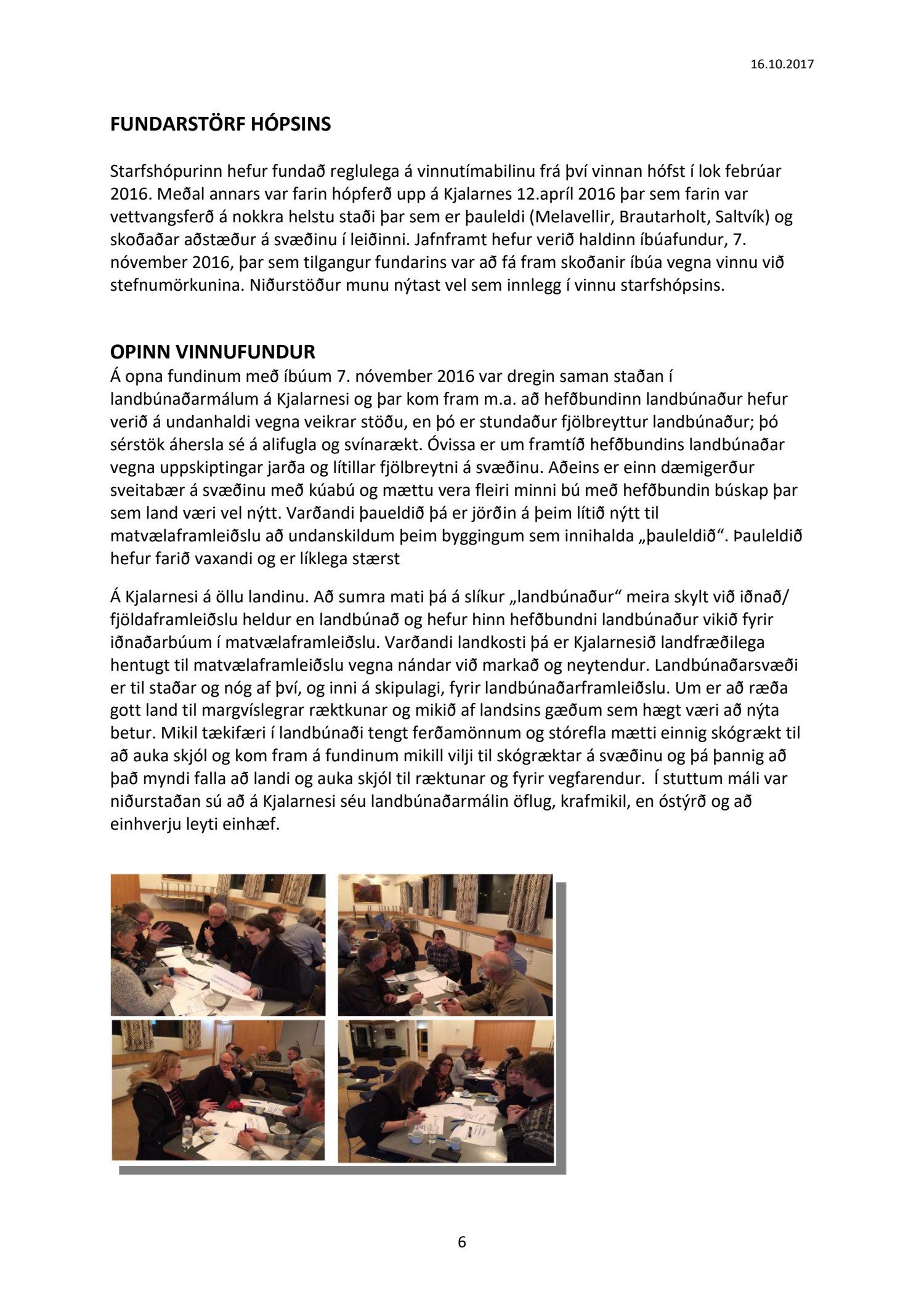 Lögð fram til kynningar drög að samantekt starfshóps um landbúnaðarstefnu fyrir Kjalarnes, dags. 16. október 2017. Markmið og tilgangur starfshópsins var að móta frekari stefnu, og mögulega leggja fram nýjar tillögur, um landbúnað og landnýtingu á Kjalarnesi á grundvelli stefnu gildandi aðalskipulags um landbúnaðarsvæði og almennrar stefnu um þróun á Kjalarnesi.
