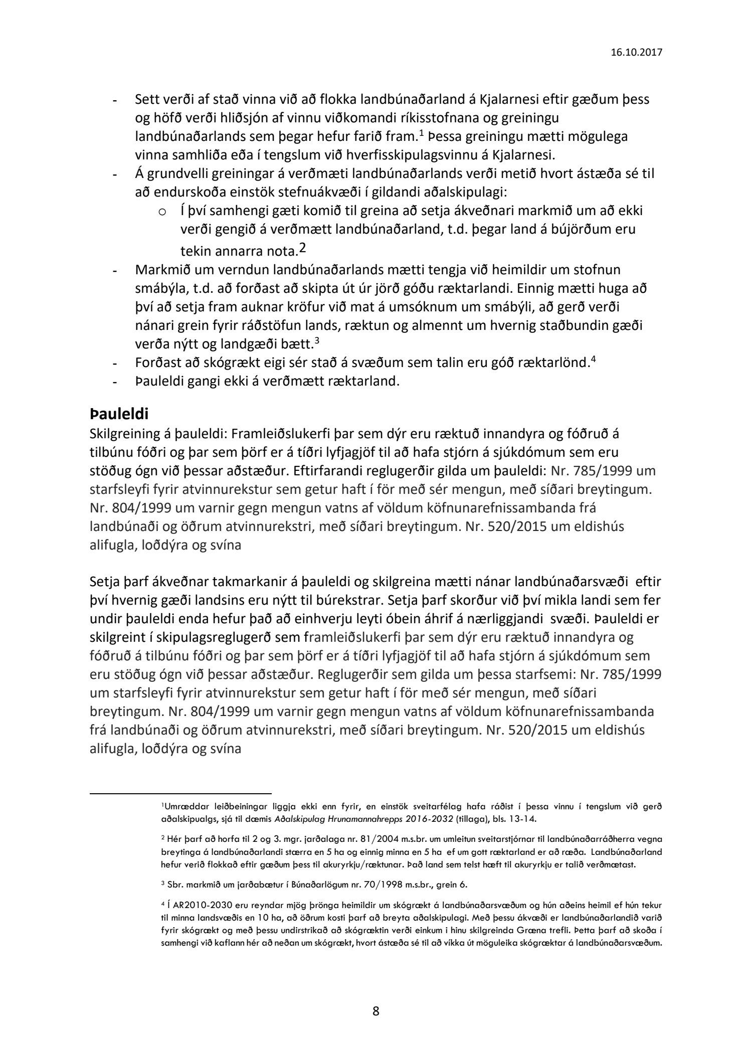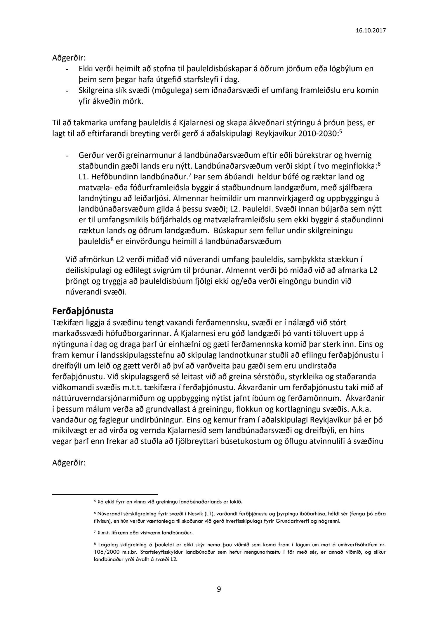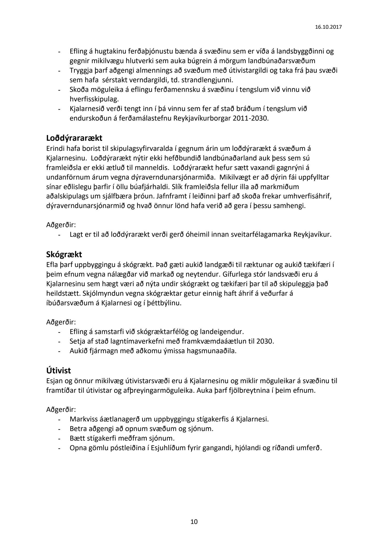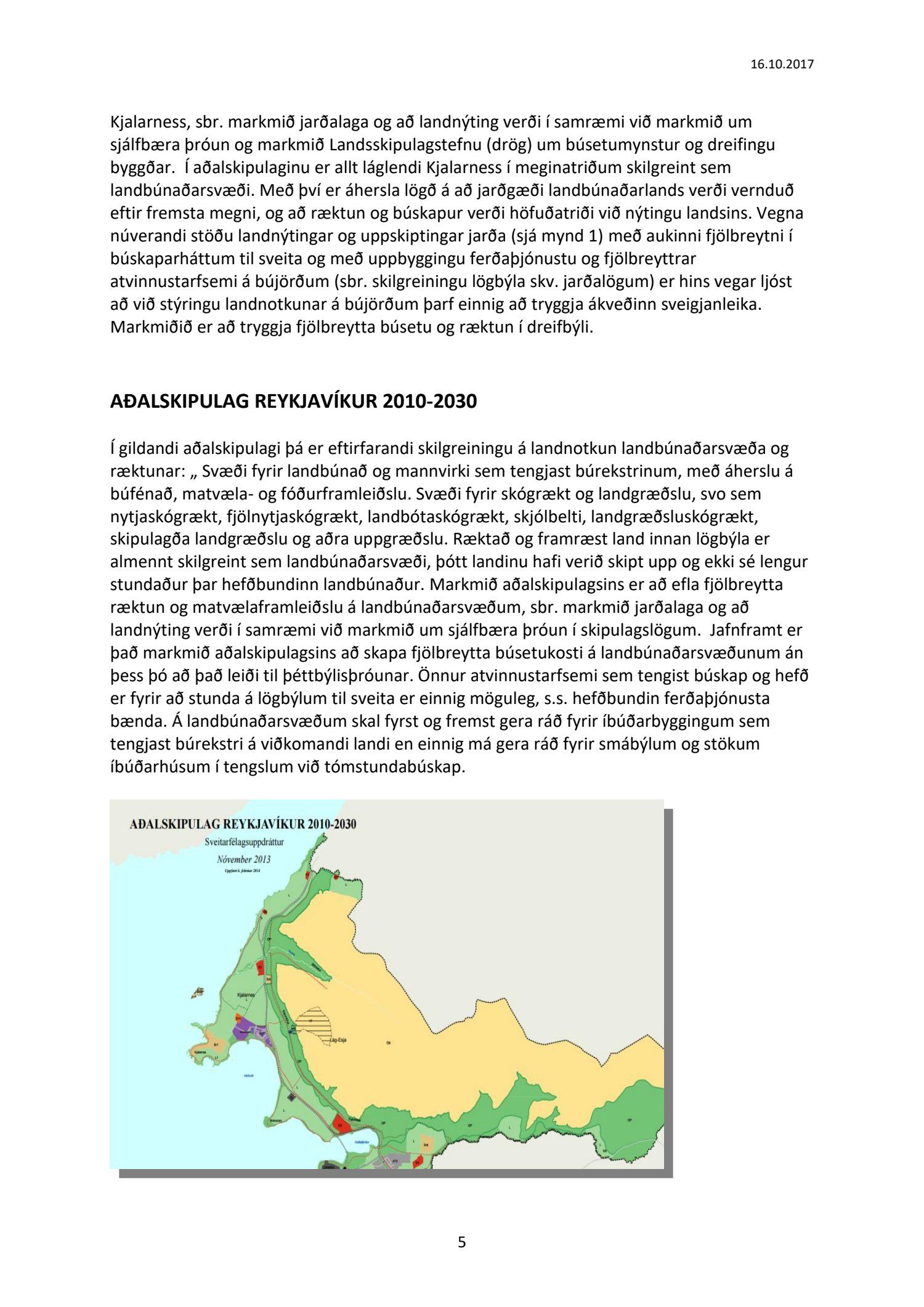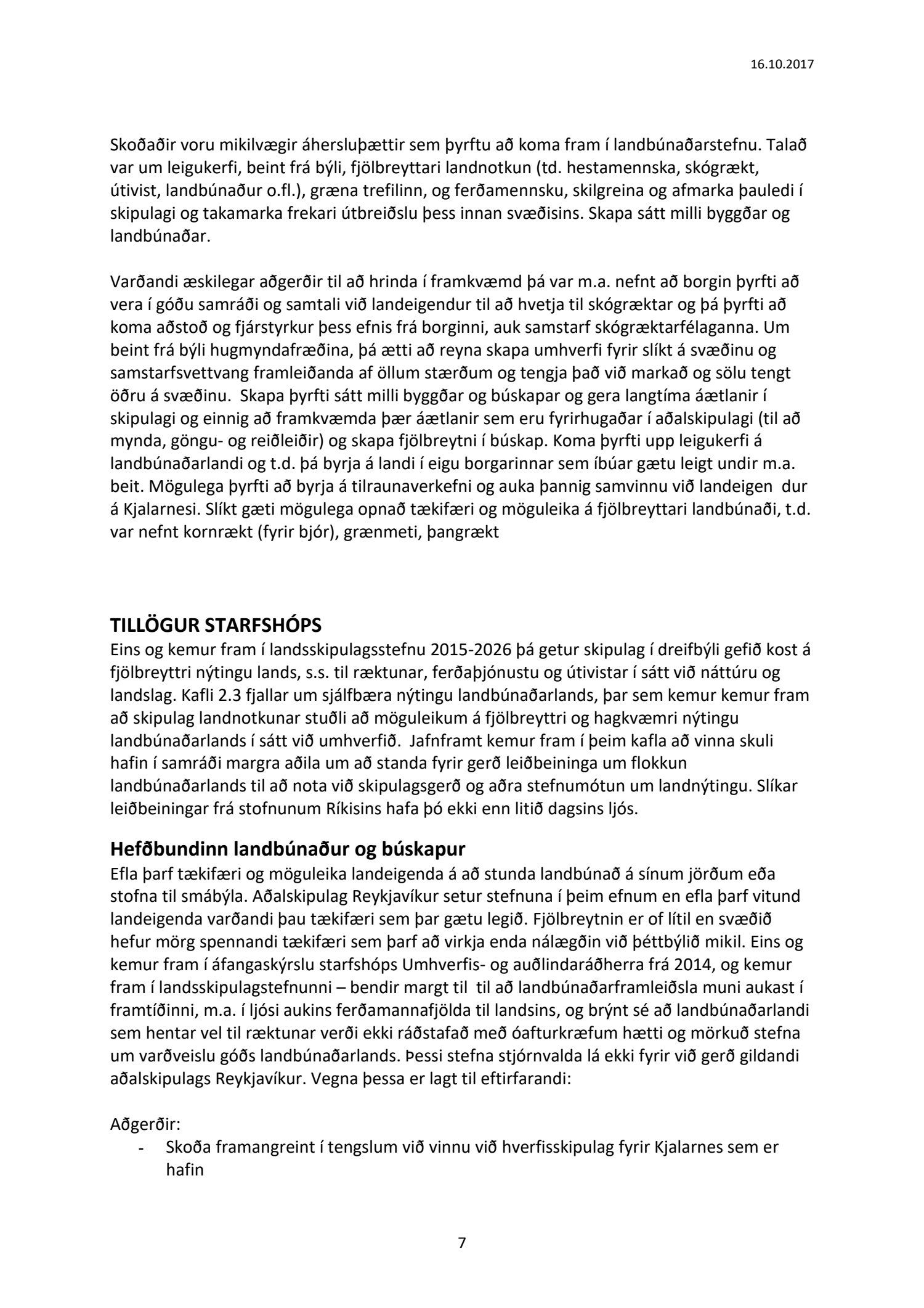 Lögð fram til kynningar drög að samantekt starfshóps um landbúnaðarstefnu fyrir Kjalarnes, dags. 16. október 2017. Markmið og tilgangur starfshópsins var að móta frekari stefnu, og mögulega leggja fram nýjar tillögur, um landbúnað og landnýtingu á Kjalarnesi á grundvelli stefnu gildandi aðalskipulags um landbúnaðarsvæði og almennrar stefnu um þróun á Kjalarnesi.