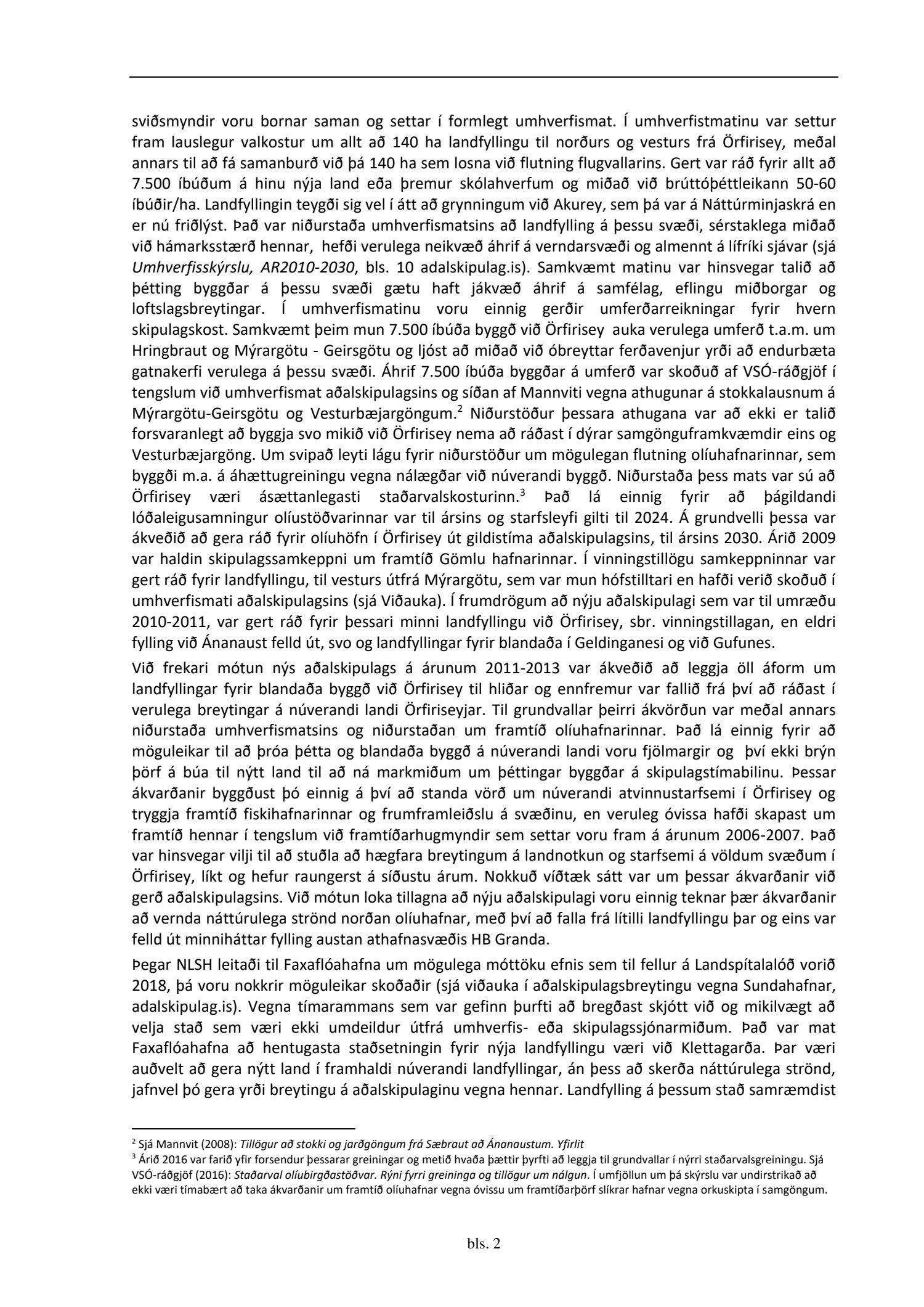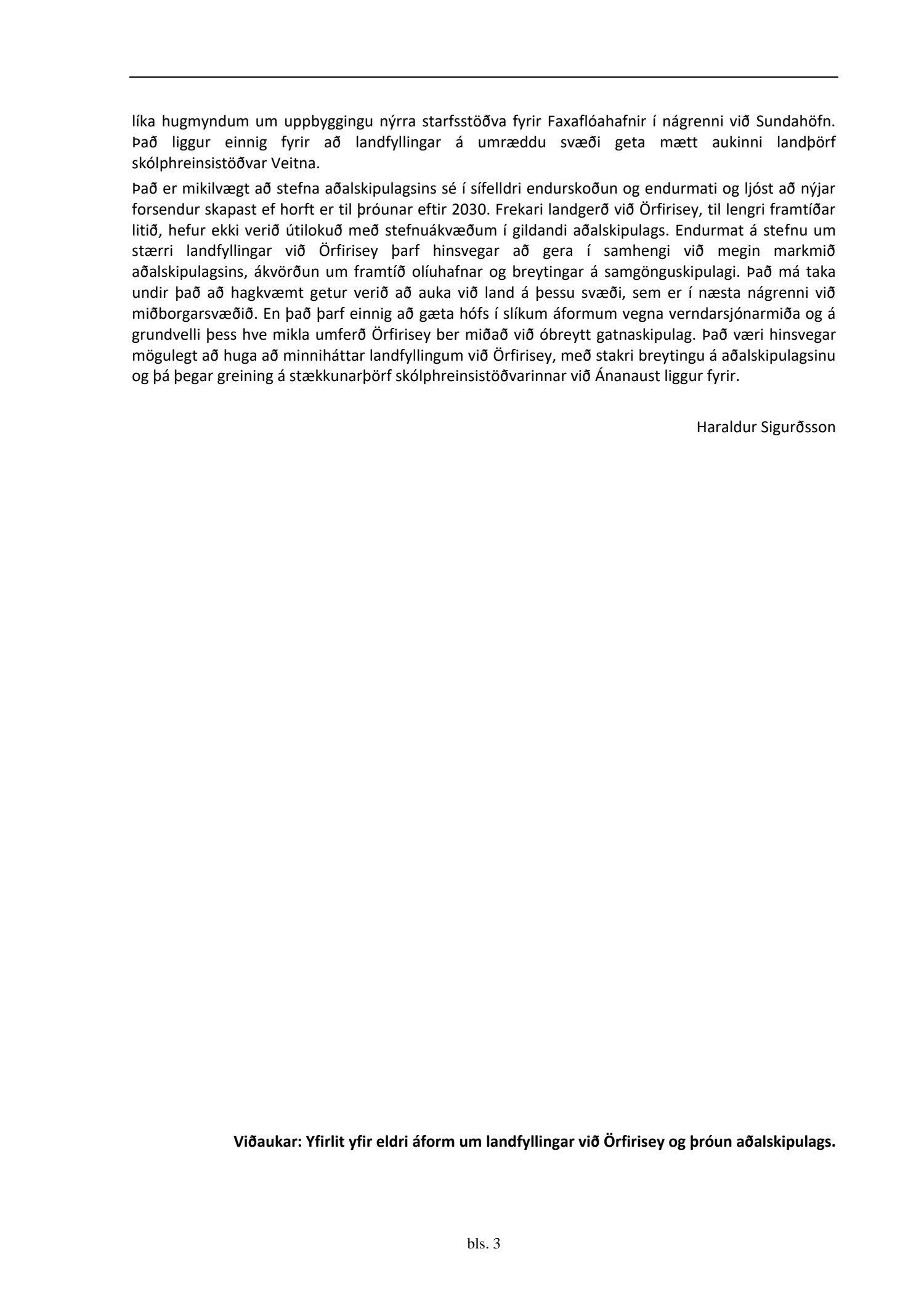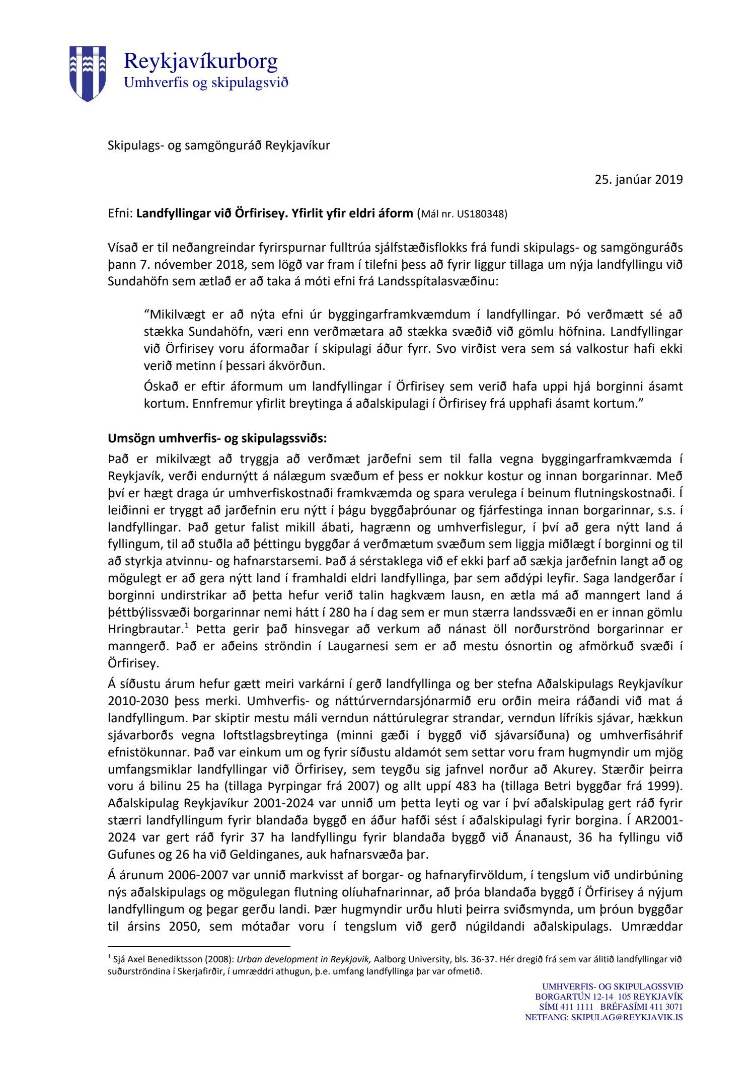 Fulltrúar Sjálfstæðisflokksins Eyþór Laxdal Arnalds, Valgerður Sigurðardóttir og Ólafur Kr. Guðmundsson sitja hjá við afgreiðslu málsins og bóka: “Sú stefnubreyting að hverfa frá landfyllingum við Örfirisey og fara í landfyllingar við Sundahöfn og í ósum Elliðaáa gengur gegn umhverfissjónarmiðum aðalaskipulags. Áform um eina milljón rúmmetra landfyllingu við ósa Elliðaá mun hafa neikvæð áhrif á lífríki og búsvæði fiska. Þá væri skynsamlegra að búa til byggingarland á verðmætu svæði í vesturbæ og nýta Örfirisey til búsetu. Sú stefna að vera með olíubirgðastöð í vesturbæ Reykjavíkur til langs tíma er tímaskekkja. Huga ber að flutningi og minnkun þessarar starfssemi enda er stefnt að orkuskiptum í samgöngum. Þá væri uppbygging í Örfirisey þáttur í bæta þann skipulagshalla sem er í borginni og minnka þannig samgönguvanda borgarinnar í heild. Ljóst er að bæta þyrfti samgöngur samhliða uppbyggingu, en með því að leyfa ekki neina byggð við Örfirisey er verið að glata tækifæri einstöku til uppbyggingar.”