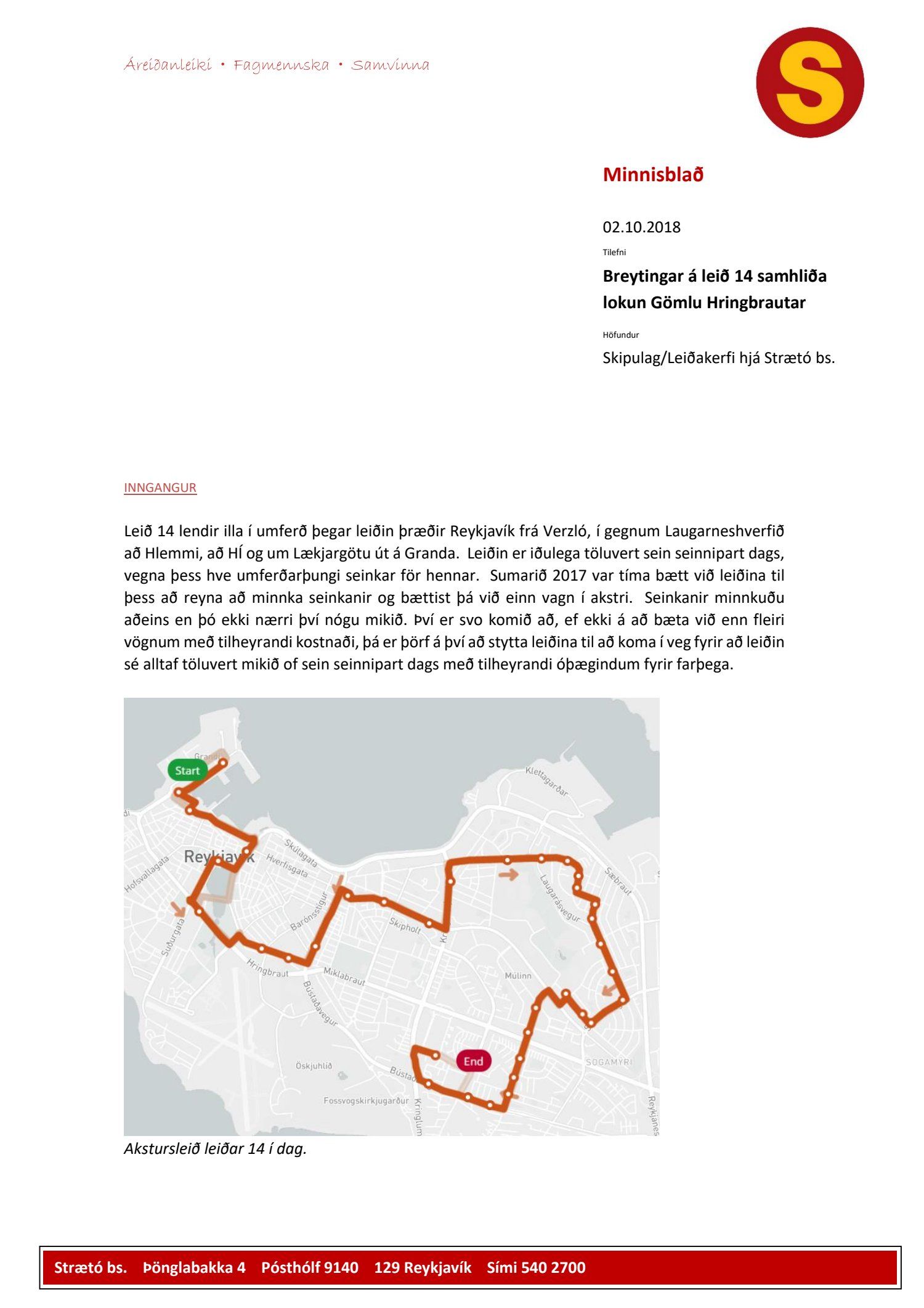 Lagt fram minnisblað Strætó dags. 2. október 2018 varðandi breytingar á leið 14 samhliða lokun Gömlu Hringbrautar. Einnig er lögð fram umsögn umhverfis- og skipulagssviðs, samgöngur dags. 9. nóvember 2018.