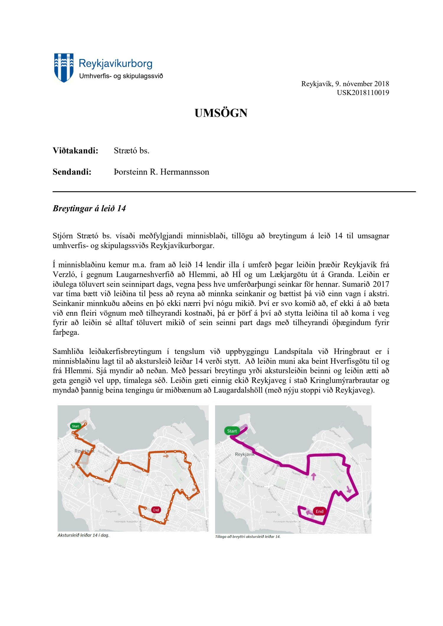 Lagt fram minnisblað Strætó dags. 2. október 2018 varðandi breytingar á leið 14 samhliða lokun Gömlu Hringbrautar. Einnig er lögð fram umsögn umhverfis- og skipulagssviðs, samgöngur dags. 9. nóvember 2018.