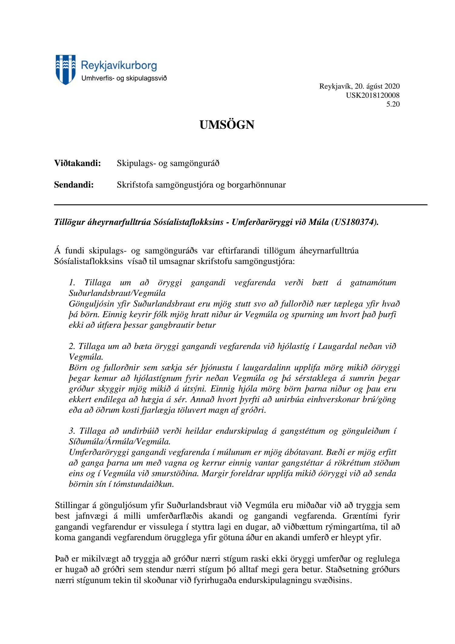 Lagðar eru fram tillögur áheyrnarfulltrúa Sósíalistaflokksins sem bárust skipulags- og samgönguráði og var vísað til umsagnar skrifstofu samgöngustjóra 14. nóvember 2018. Einnig er lögð fram umsögn dags. 20. ágúst 2020.