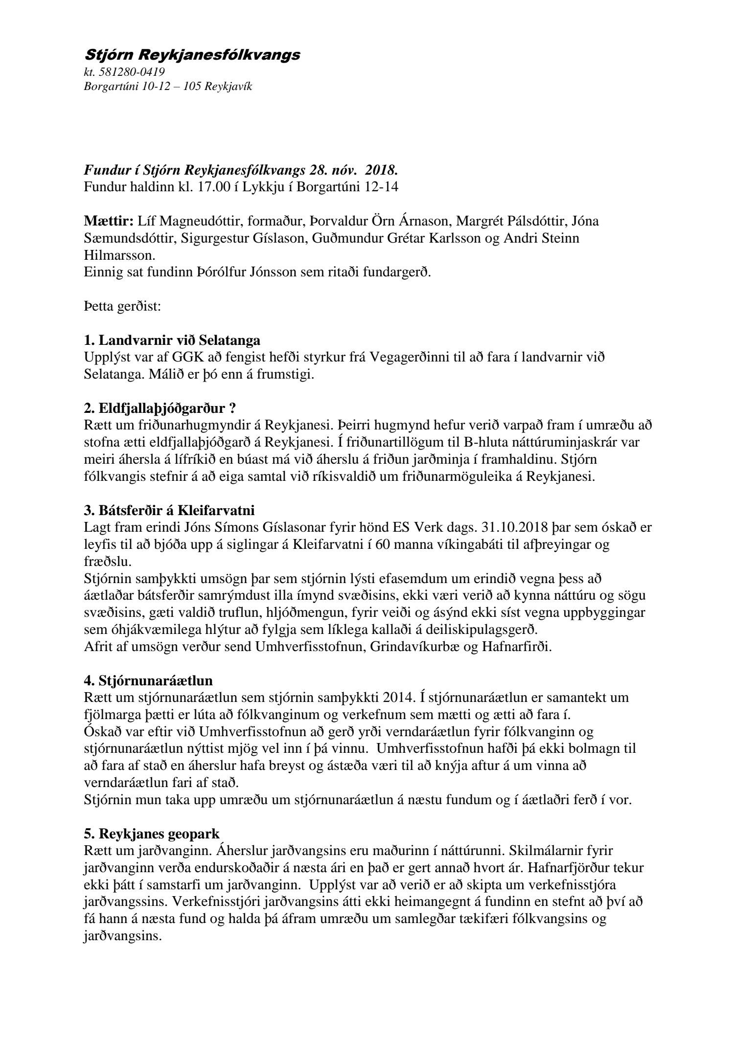 Fundagerð Stjórnar Reykjanesfólkvangs 28. nóvember 2018