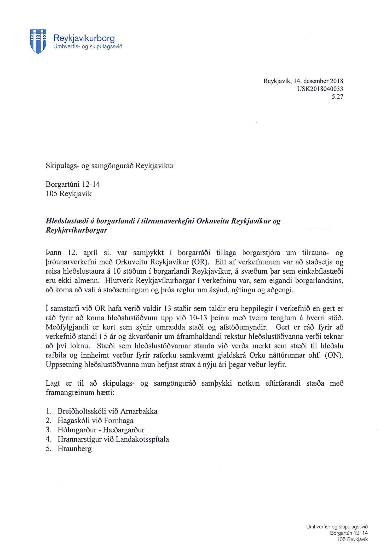 Lagðar eru fram tillögur að staðsetningum hleðslustæða á borgarlandi til samþykktar í skipulags- og samgönguráði en til kynningar í umhverfis- og heilbrigðisráði.