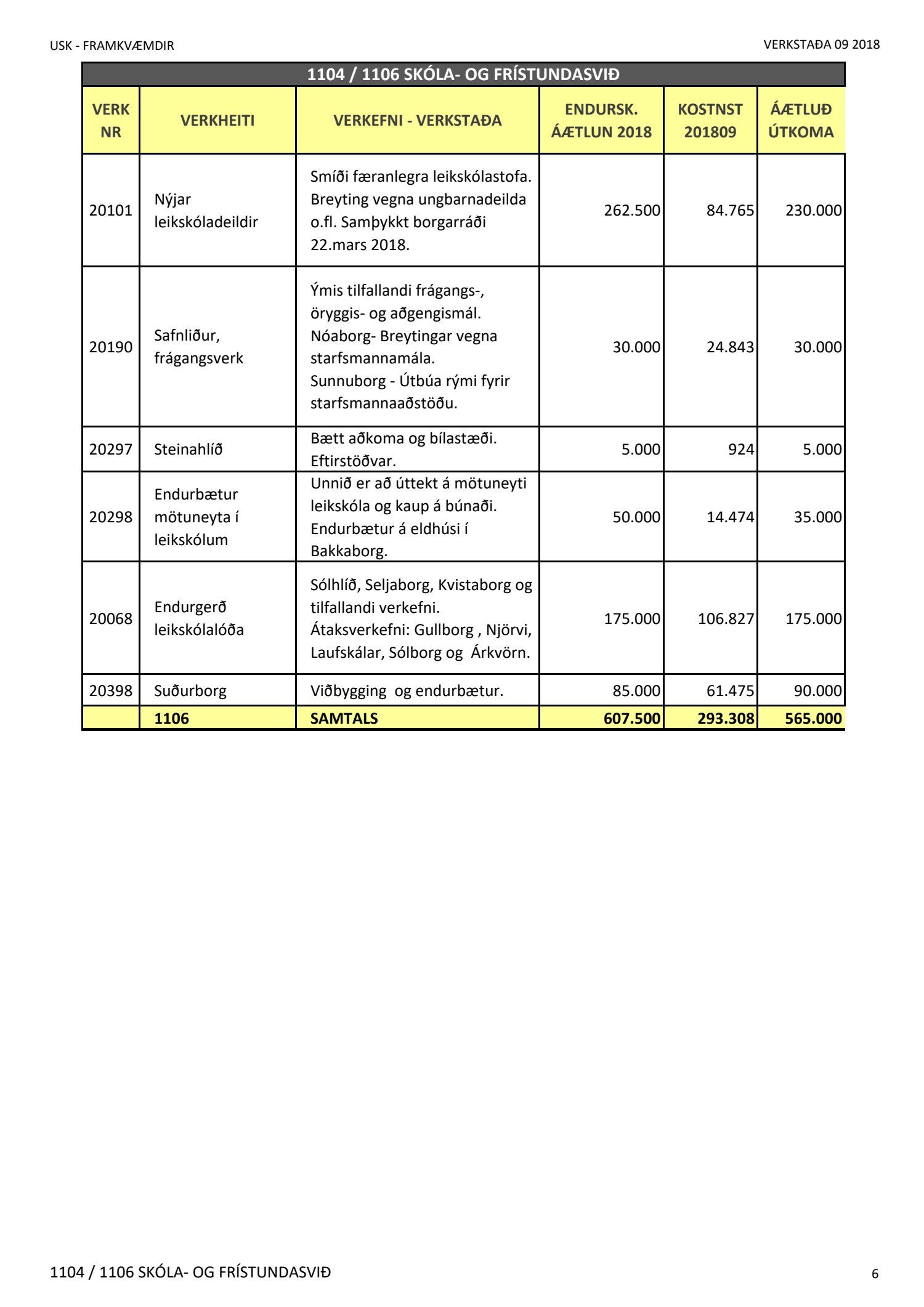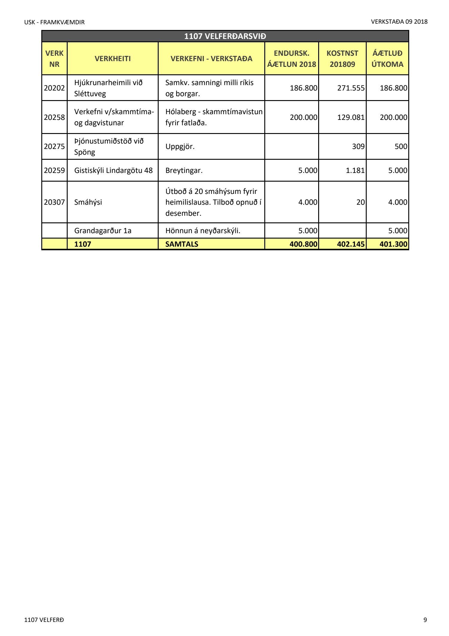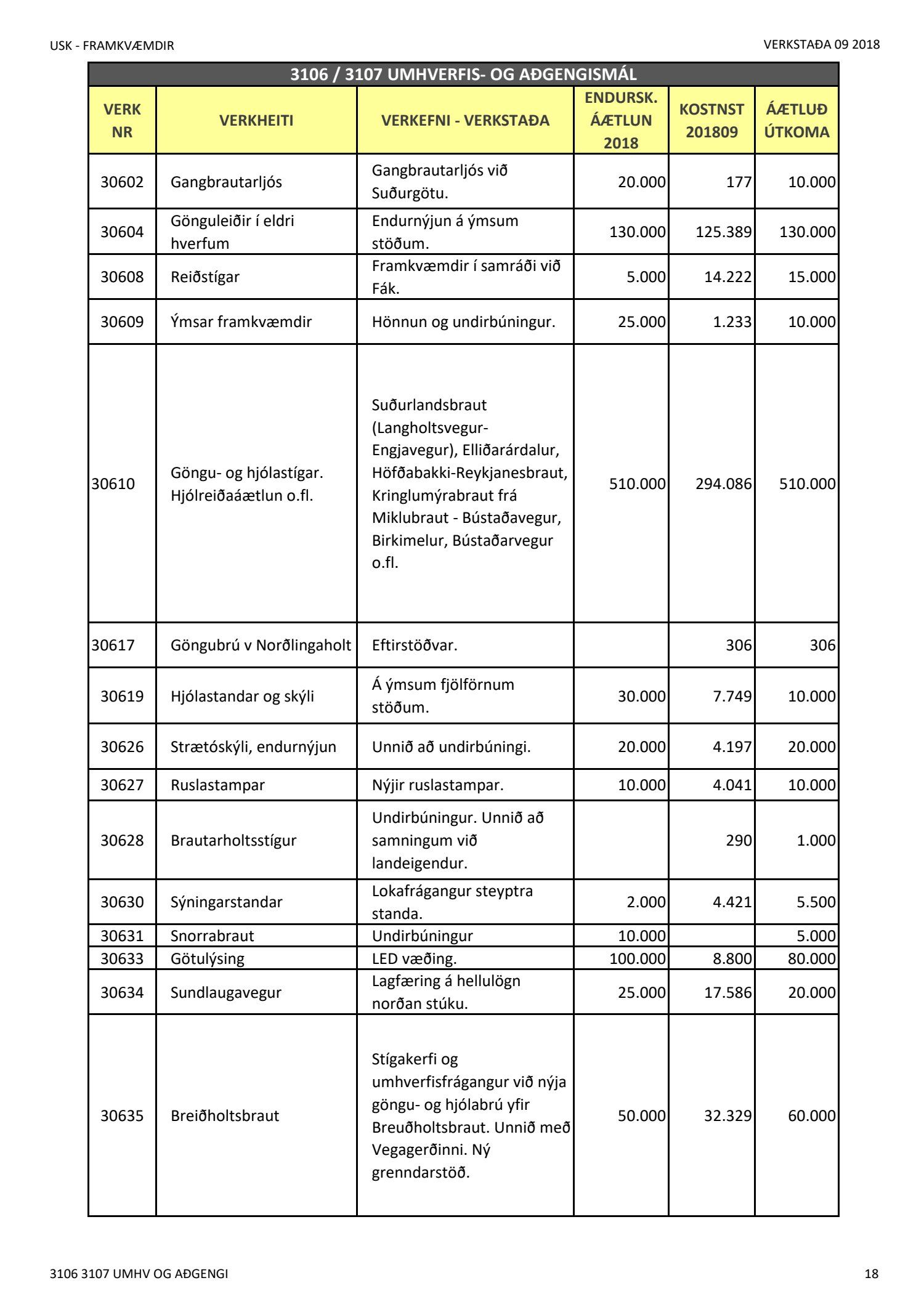 Umhverfis- og skipulagssvið, verkstöðuskýrsla nýframkvæmda (USK2018120014)Lögð er fram níu mánaða verkstöðuskýrsla nýframkvæmda janúar til september 2018.