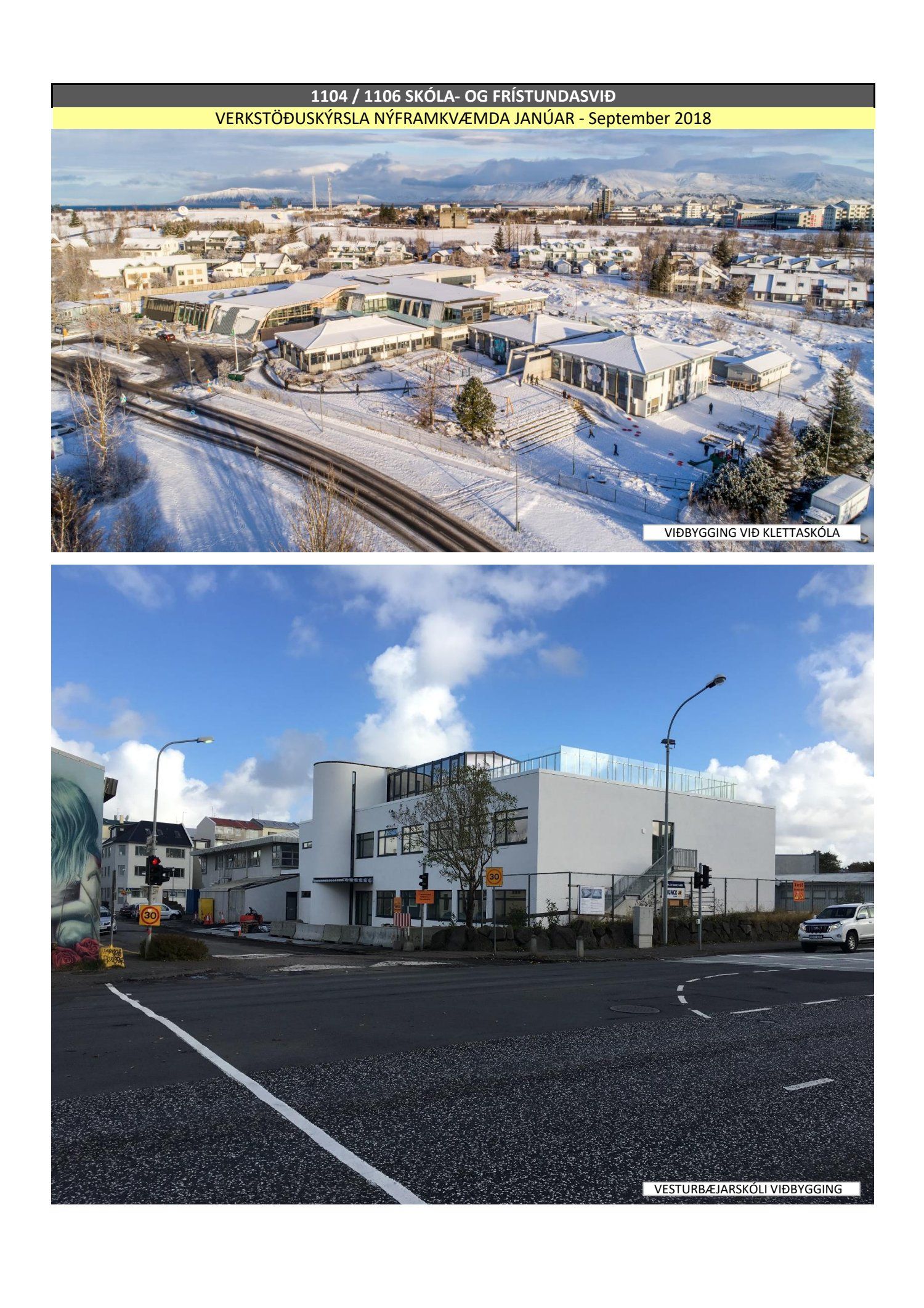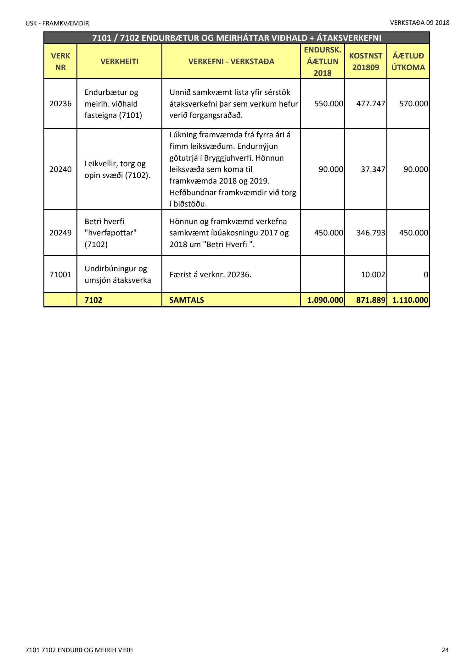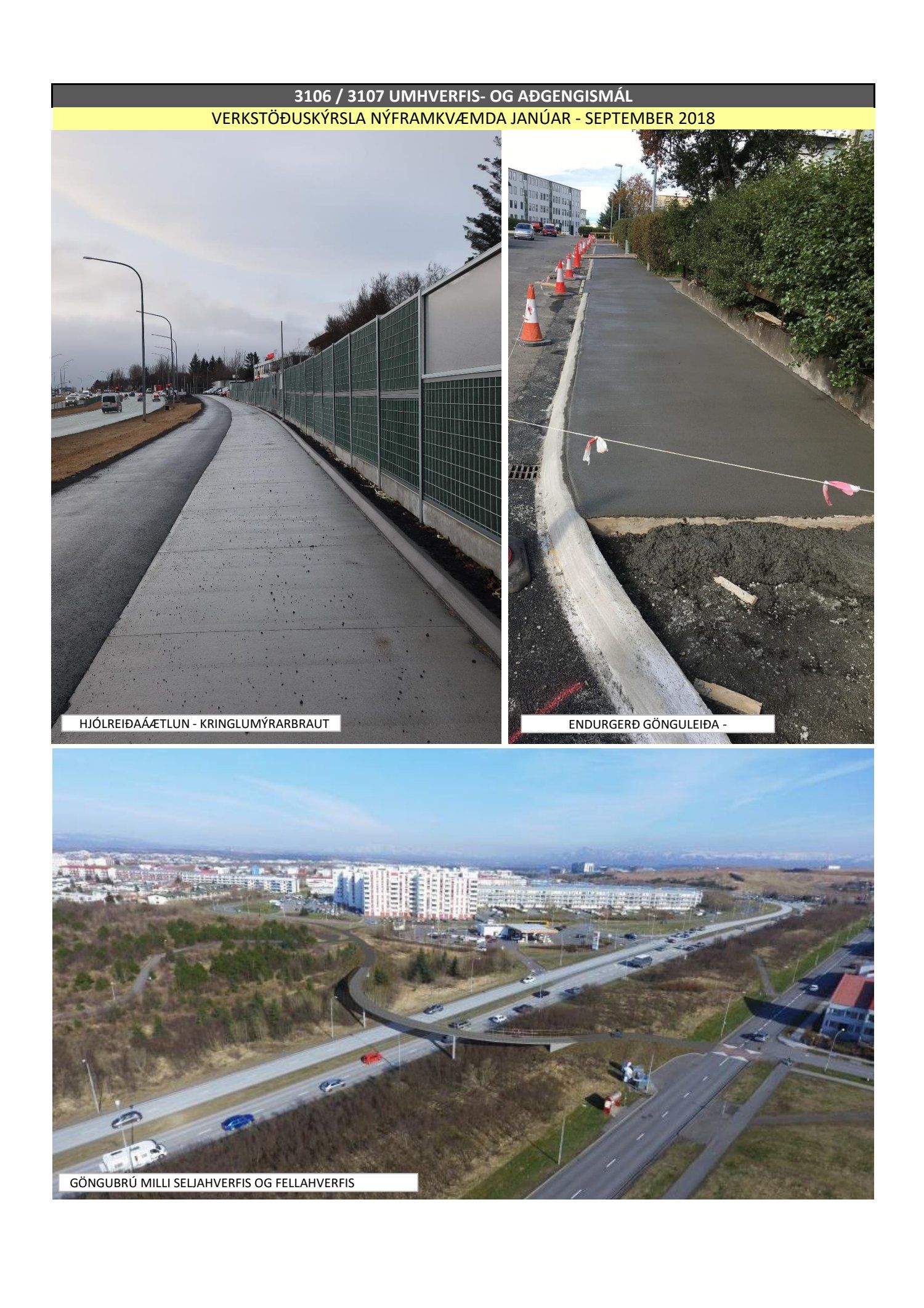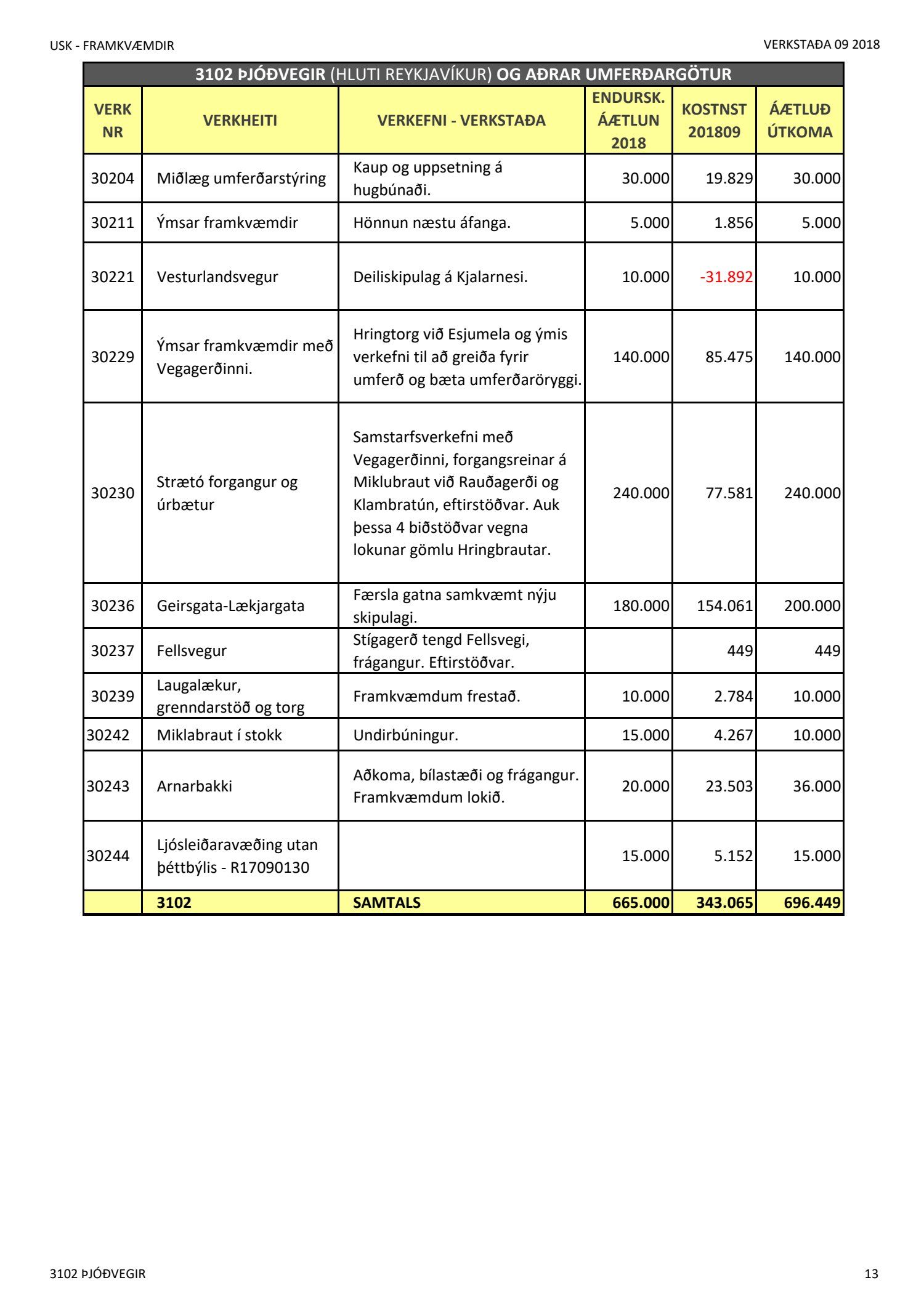 Umhverfis- og skipulagssvið, verkstöðuskýrsla nýframkvæmda (USK2018120014)Lögð er fram níu mánaða verkstöðuskýrsla nýframkvæmda janúar til september 2018.