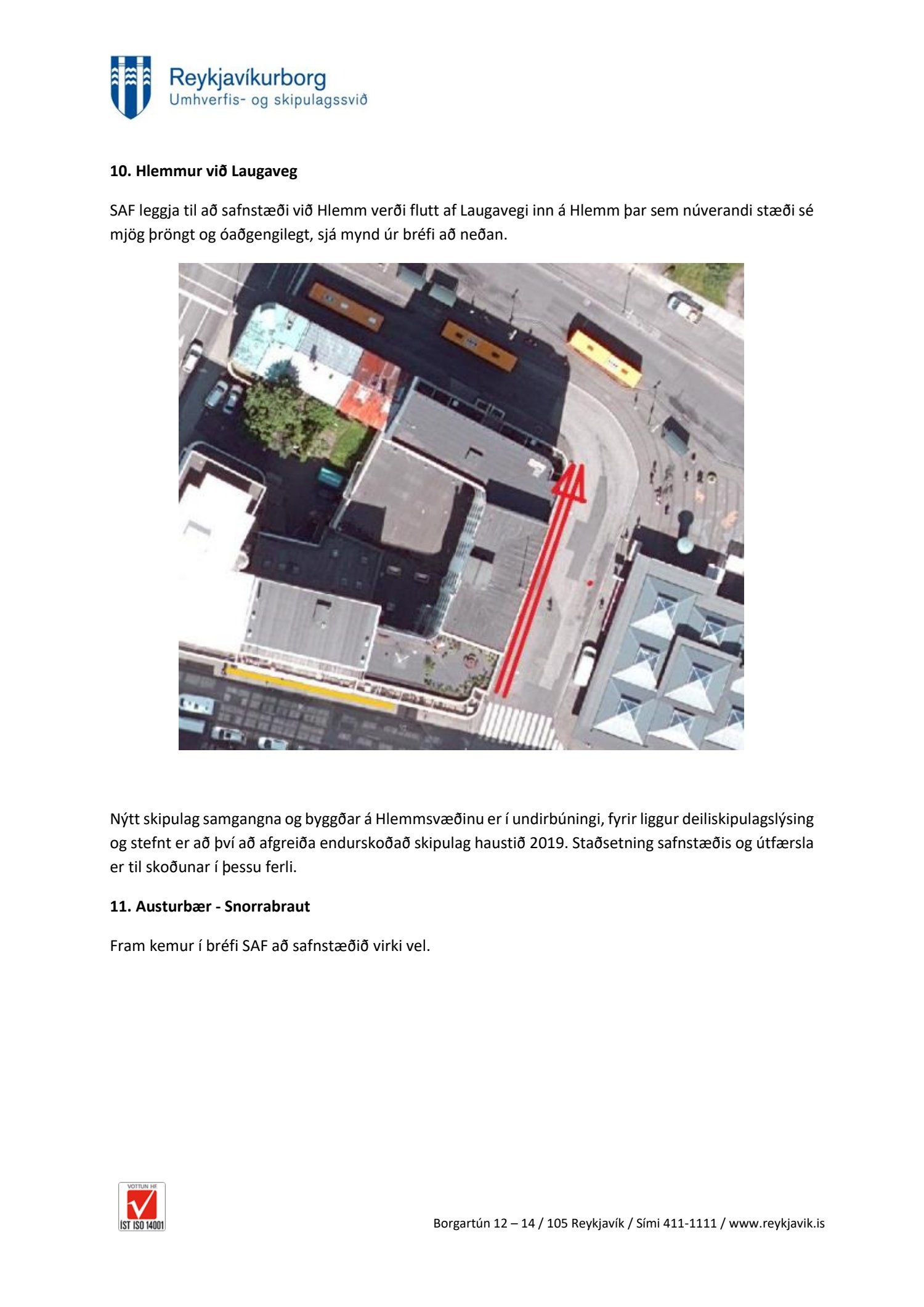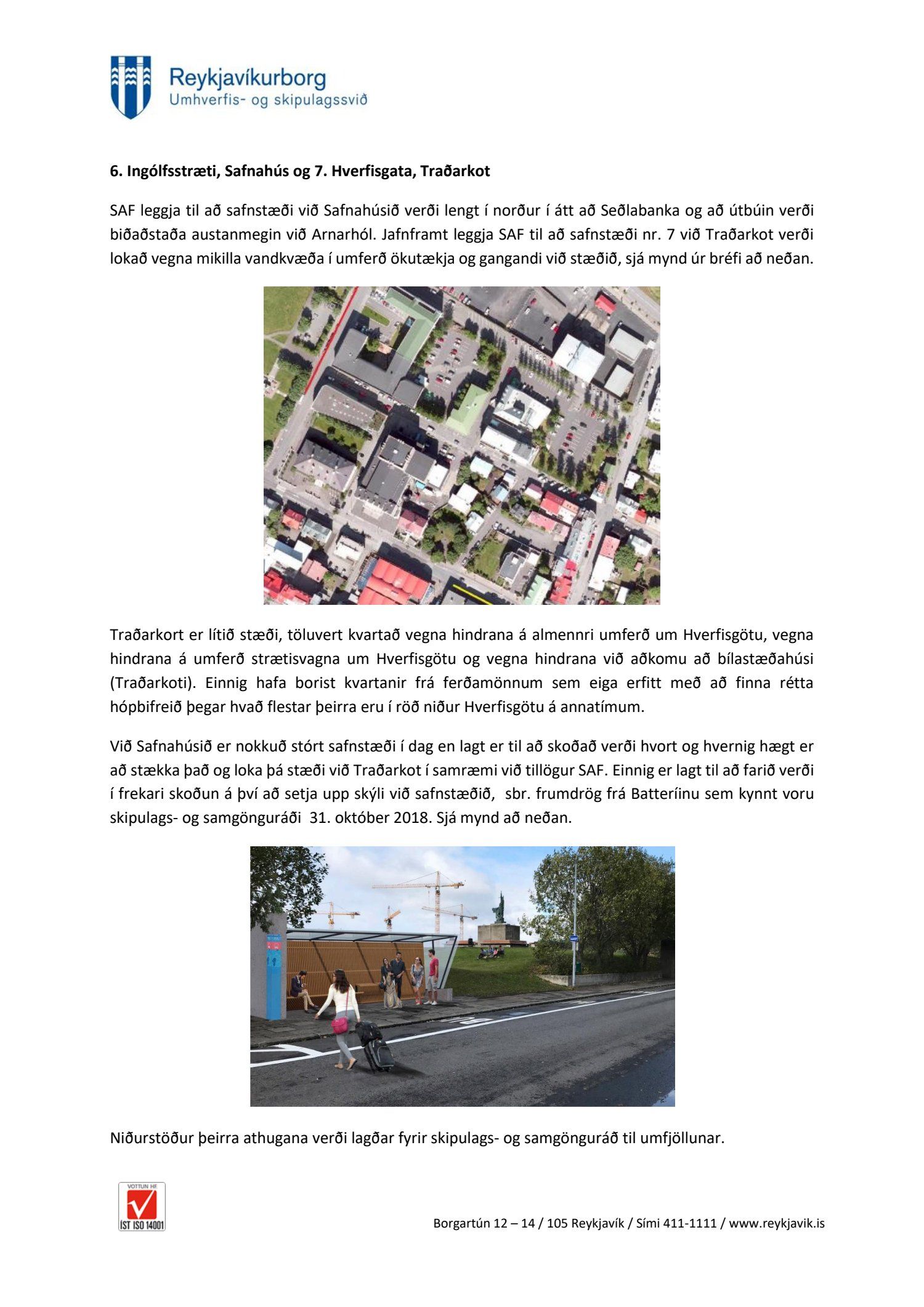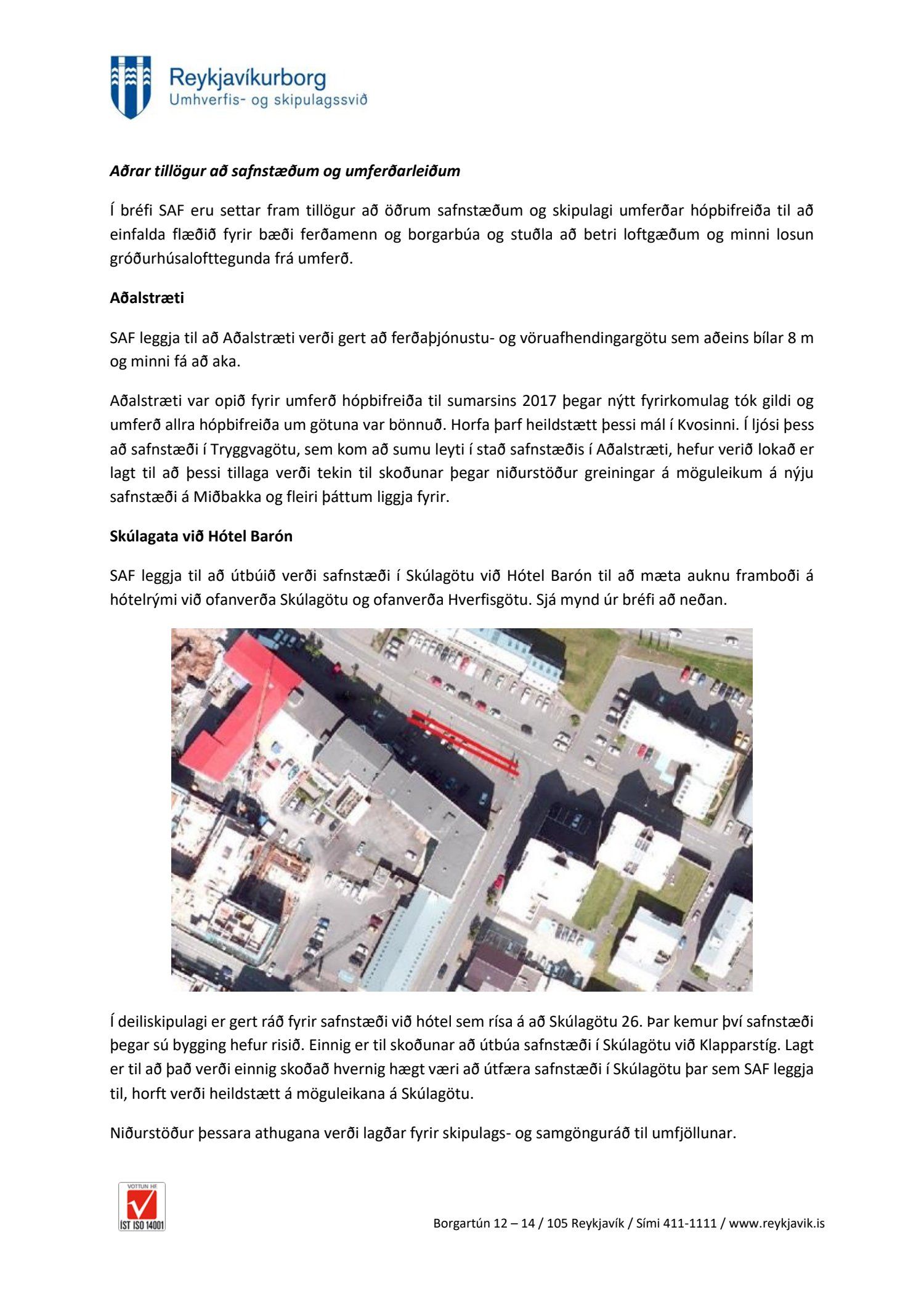 Lagt er fram bréf frá Samtökum ferðaþjónustunnar dags. ódagssett. þar sem ábendingar og tillögur eru settar fram varðandi safnstæði í Reykjavík. einnig er lögð fram umsögn umhverfis- og skipulagssviðs, samgöngustjóra dags. 14. mars 2019