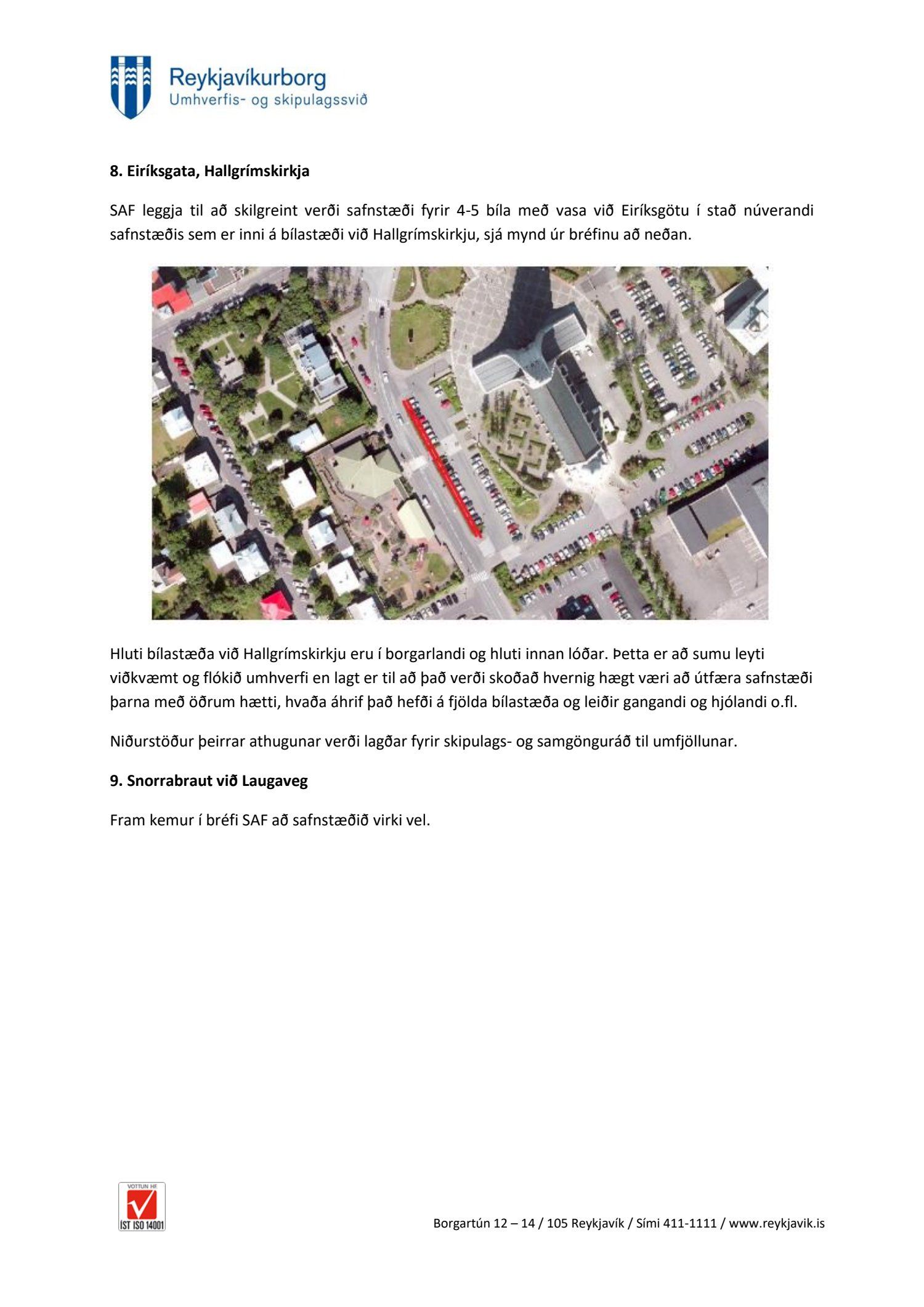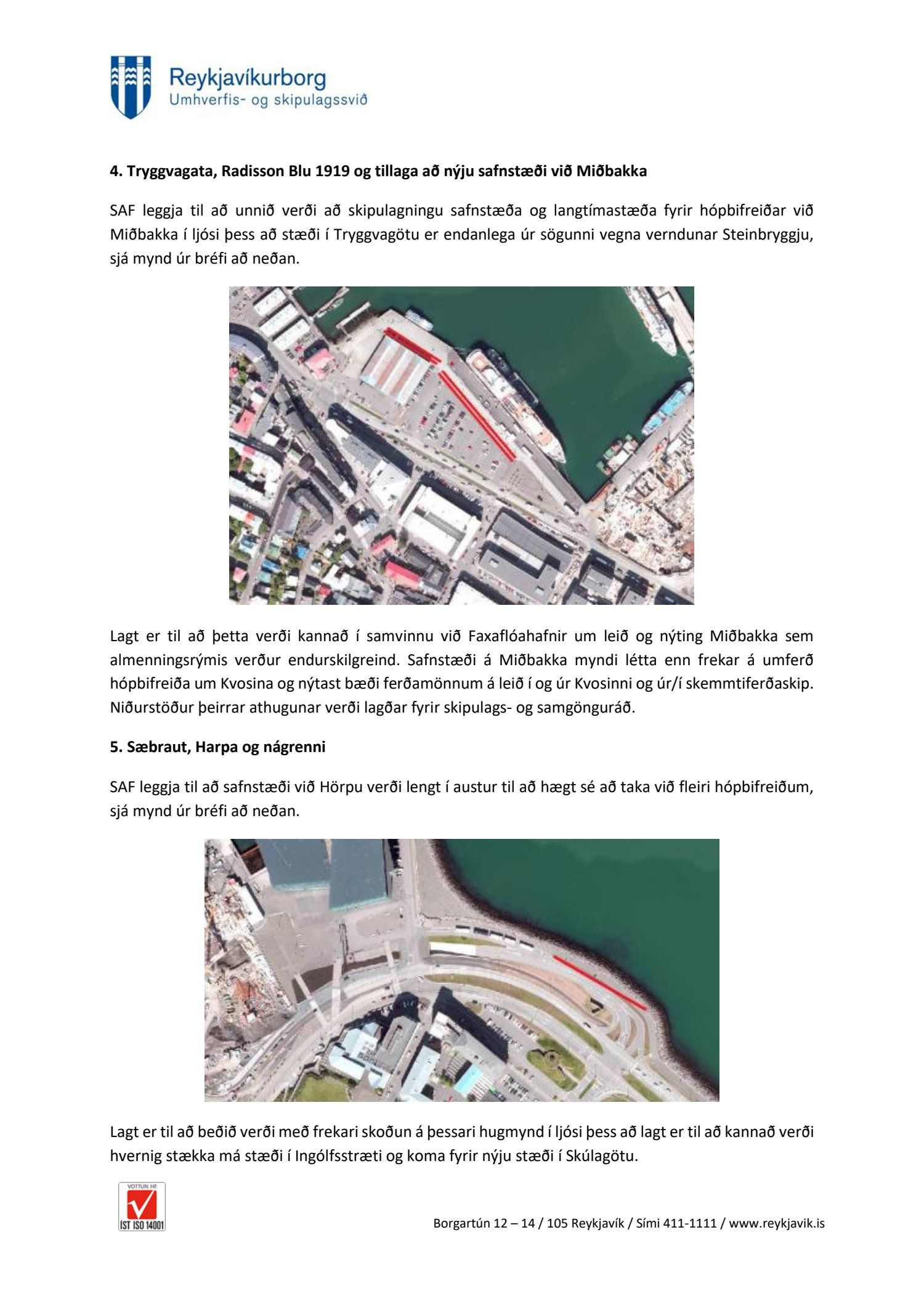 Skipulags og samgönguráð þakkar tillögur samtaka ferðaþjónustunnar. Það er mikilvægt verkefni að finna hentuga staði fyrir safnstæði hópbifreiða. Ráðið telur æskilegt að þessi stæði verði ekki til frambúðar innan miðborgarinnar heldur í jaðri hennar í samráði við ferðaþjónustuna.