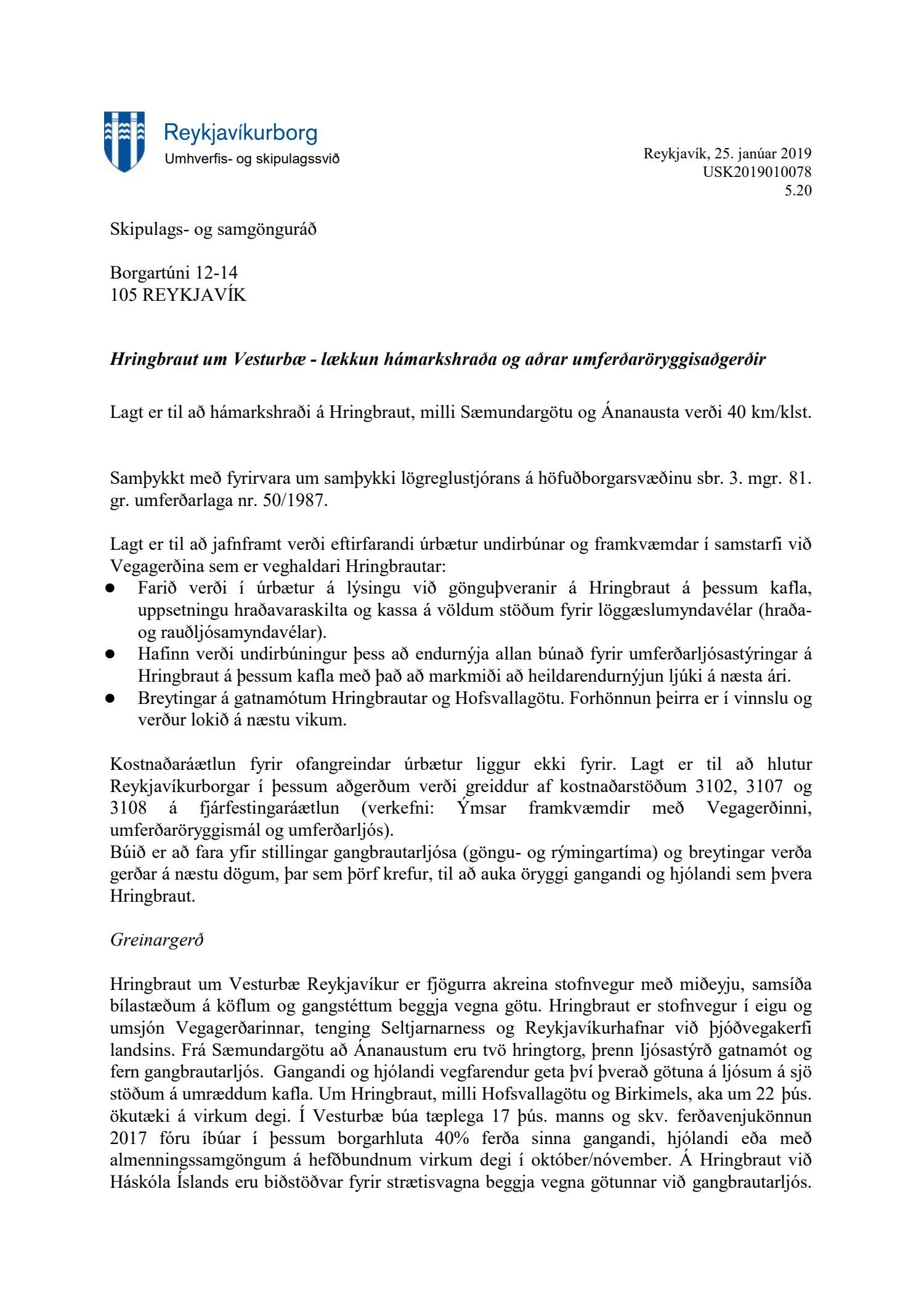 Árið 2015 var samþykkt 25. nóvember í USK að skipa starfshóp til að meta umferðarhraða vestan Kringlumýrarbrautar sem skildi skila áliti 1. mars 2016 varðandi umferðarflæðis, umferðaröryggis og umhverfisþátta. Í janúar 2017 var skilað áliti hópsins, ásamt séráliti minnihlutans. Áður en til lækkunar á hámarkshraða kæmi, skyldi tillögur kynntar fyrir Samgöngustofu, Vegagerðinni,