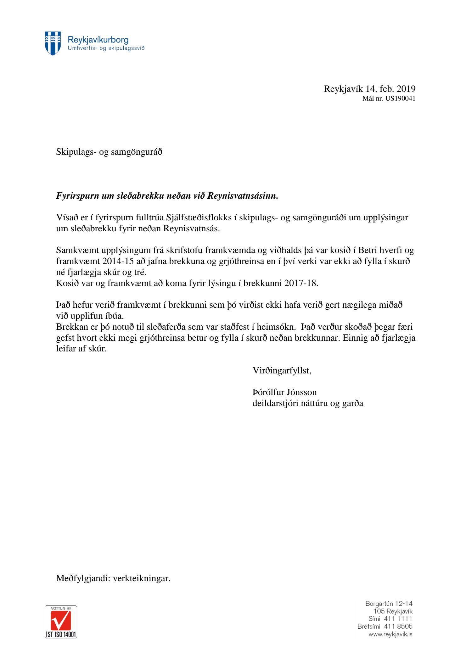 Kynnt svarbréf umhverfis- og skipulagssviðs, skrifstofu umhverfisgæða dags. .14. febrúar 2019.