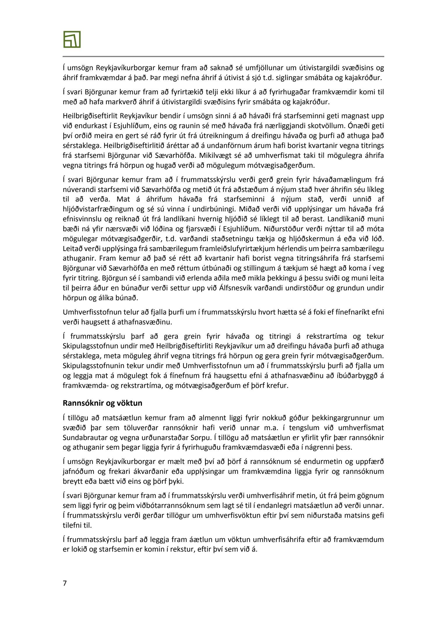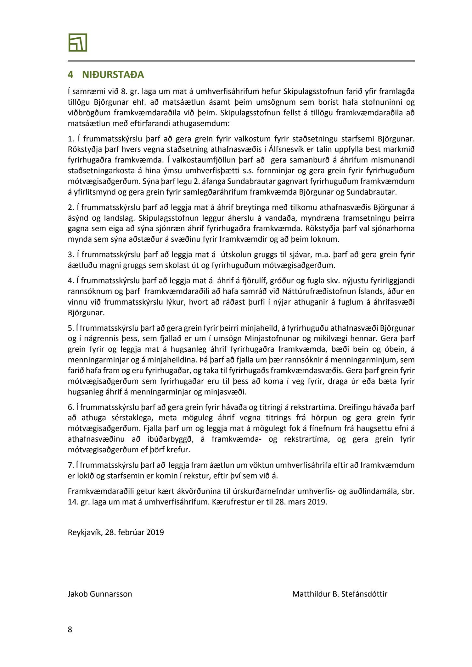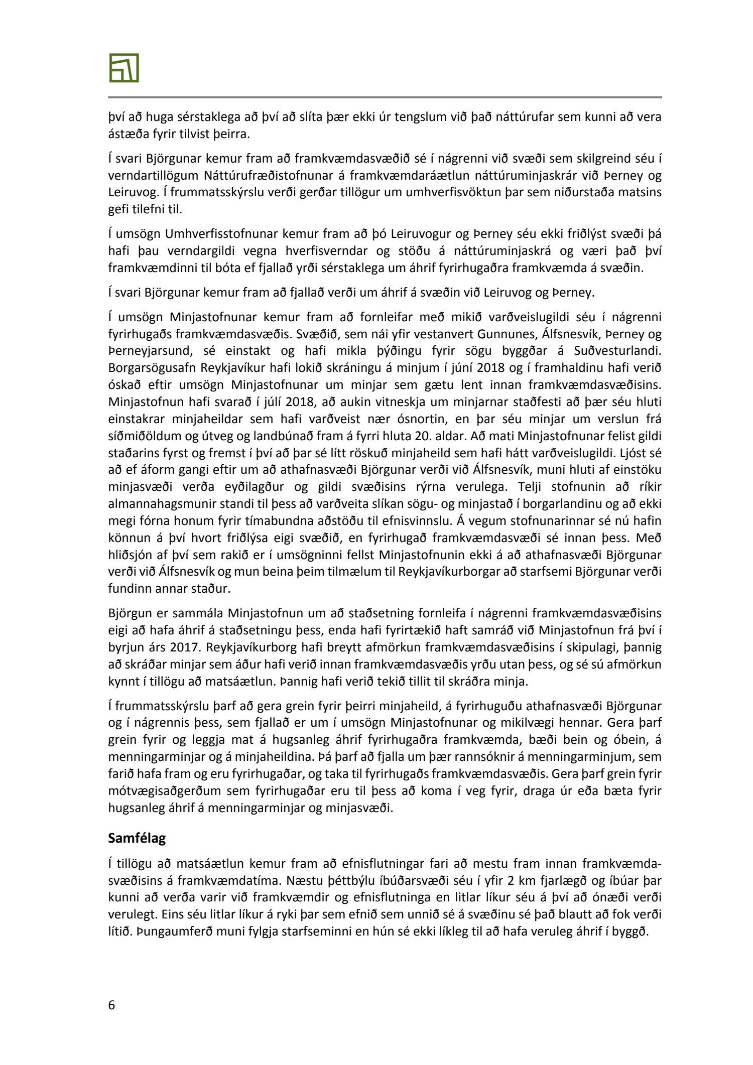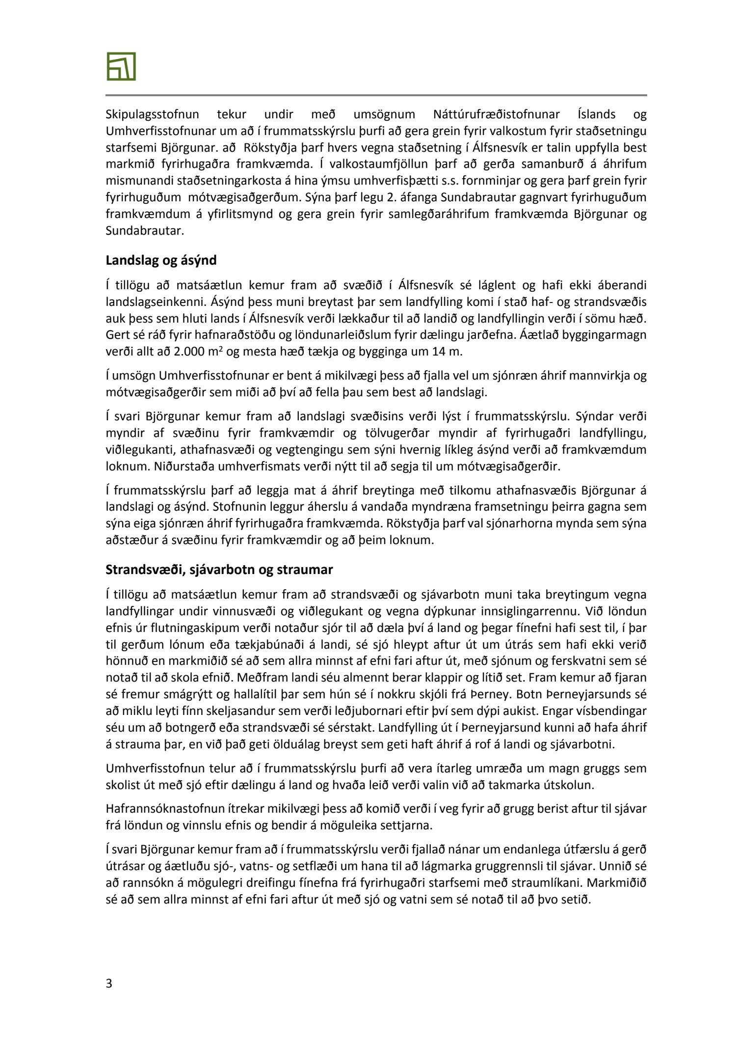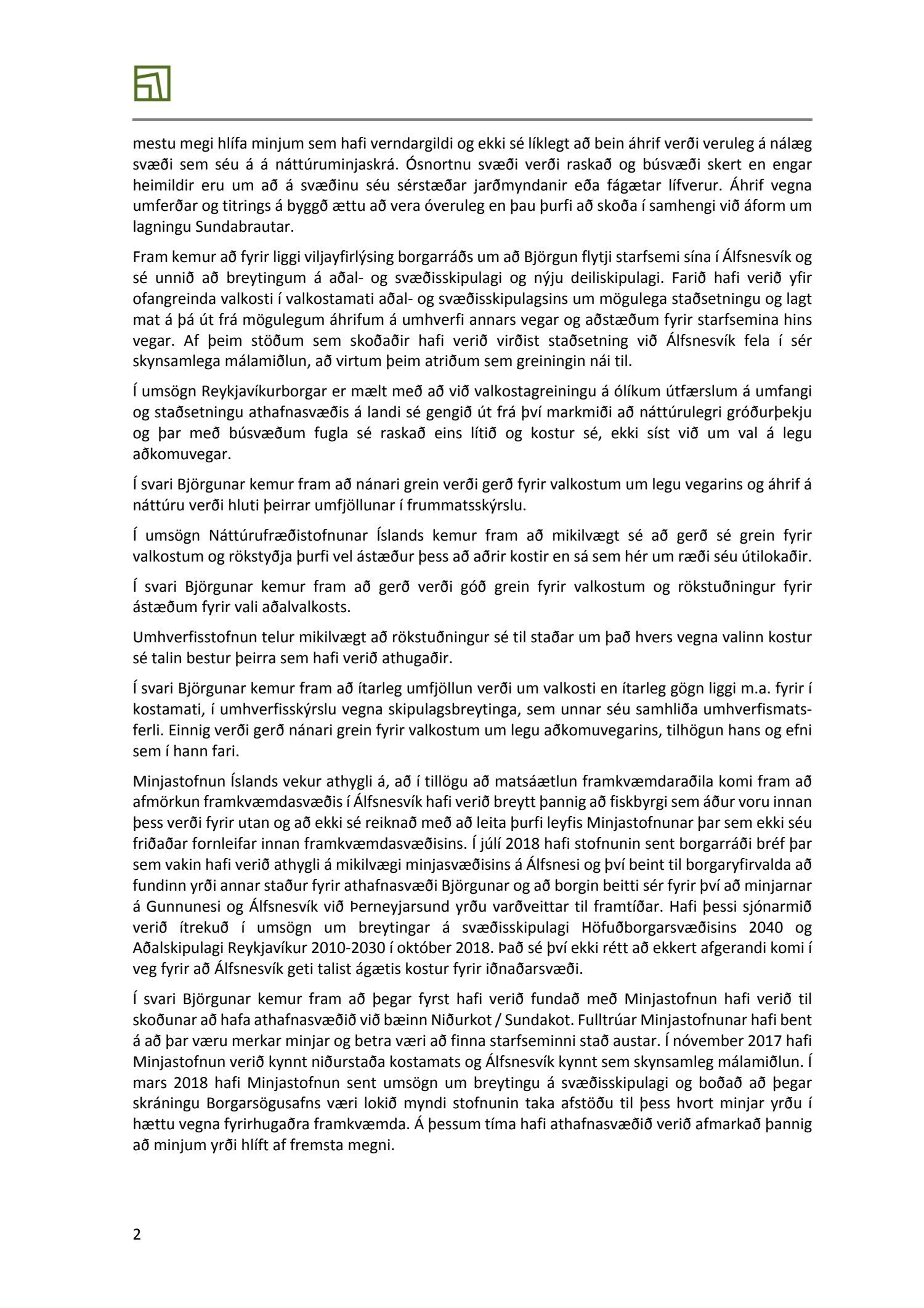 Lögð er fram skýrsla frá Skipulagsstofnun varðandi ákvörðun um tillögu að matsáætlun vegna landfyllingar og höfn Björgunar á Álfsnesi dags. 28. febrúar 2019.Einnig er lögð fram umsögn Reykjavíkurborgar um tillögu að matsáætlun um landfyllingu og höfn fyrir efnisvinnslusvæði