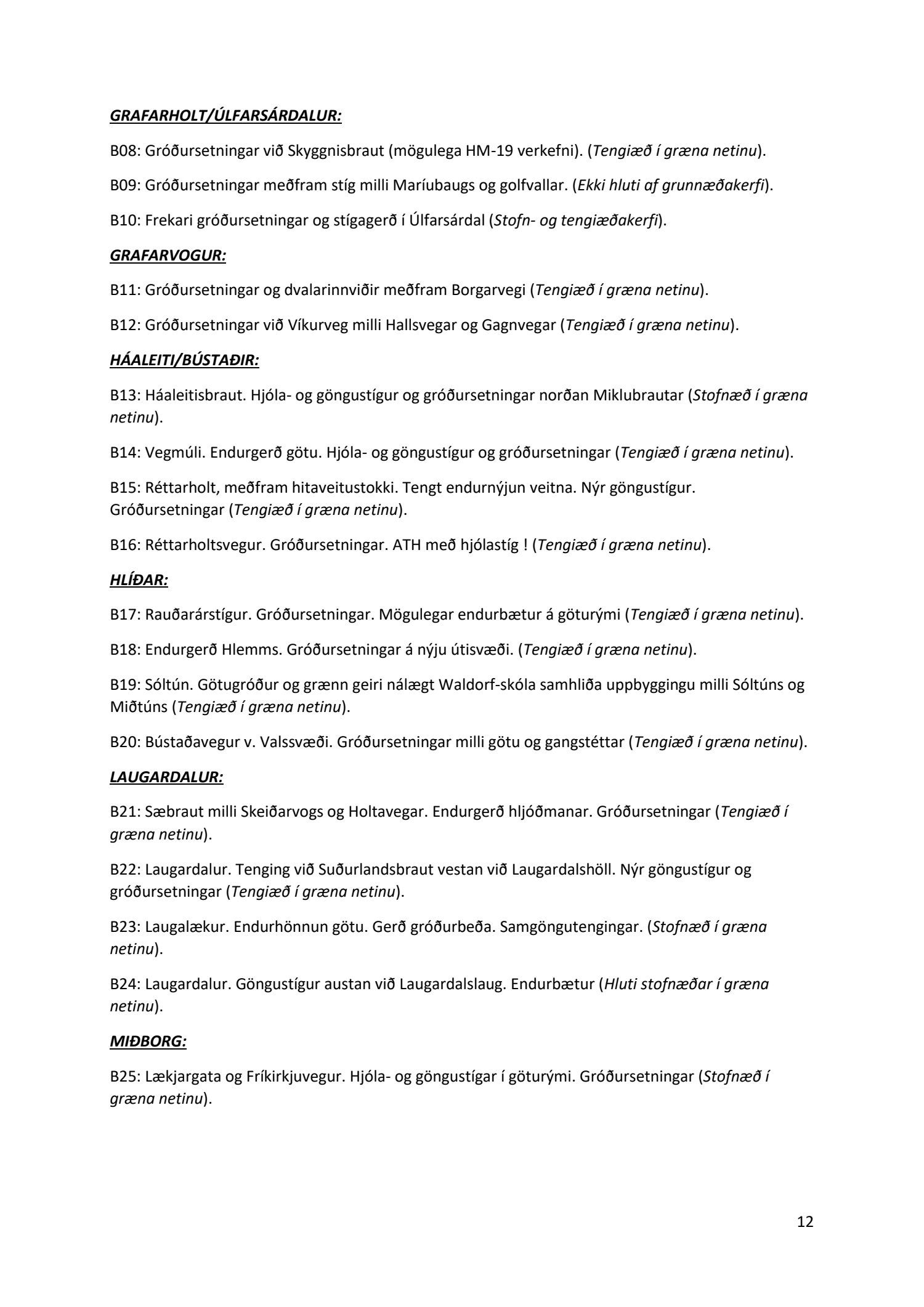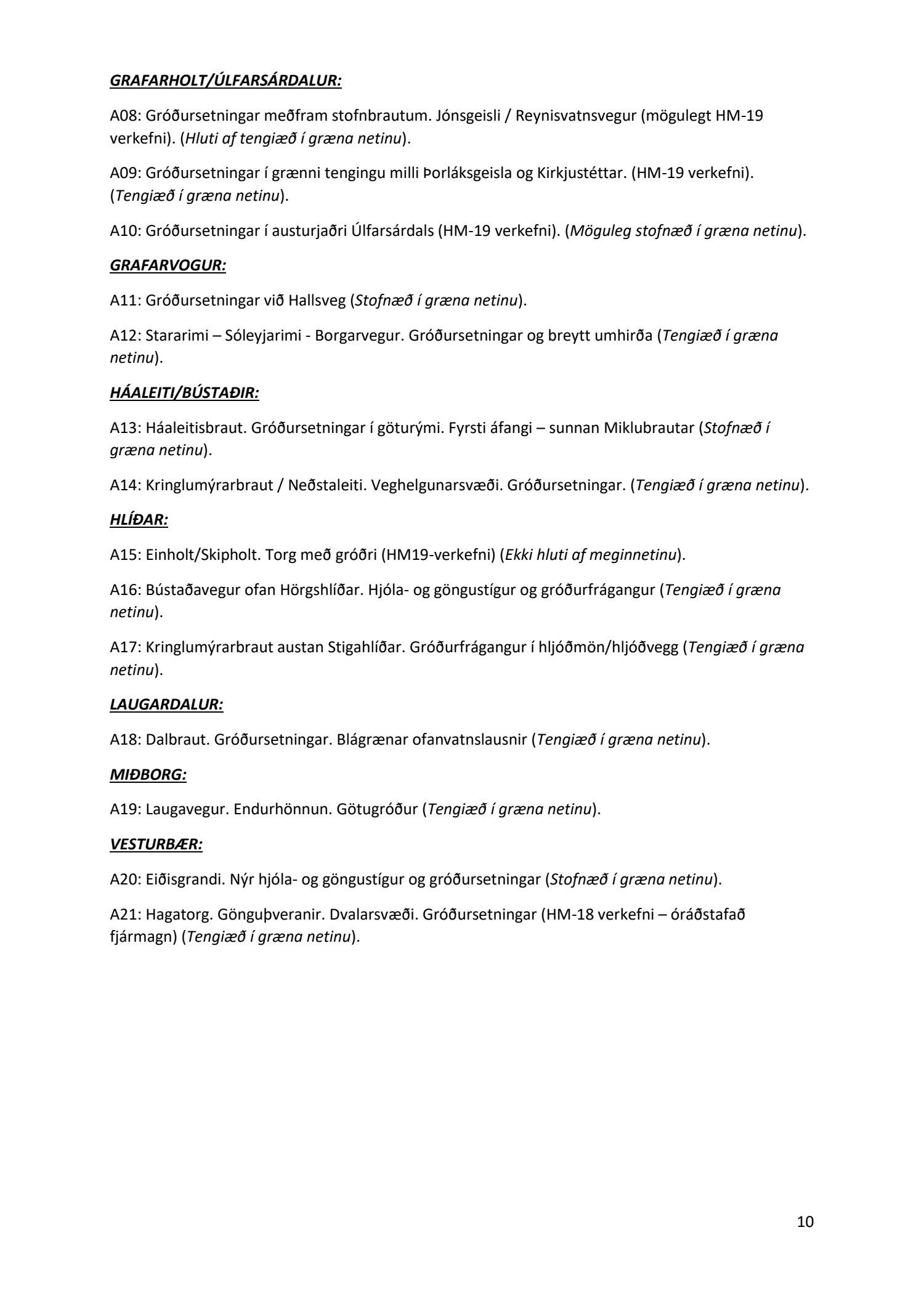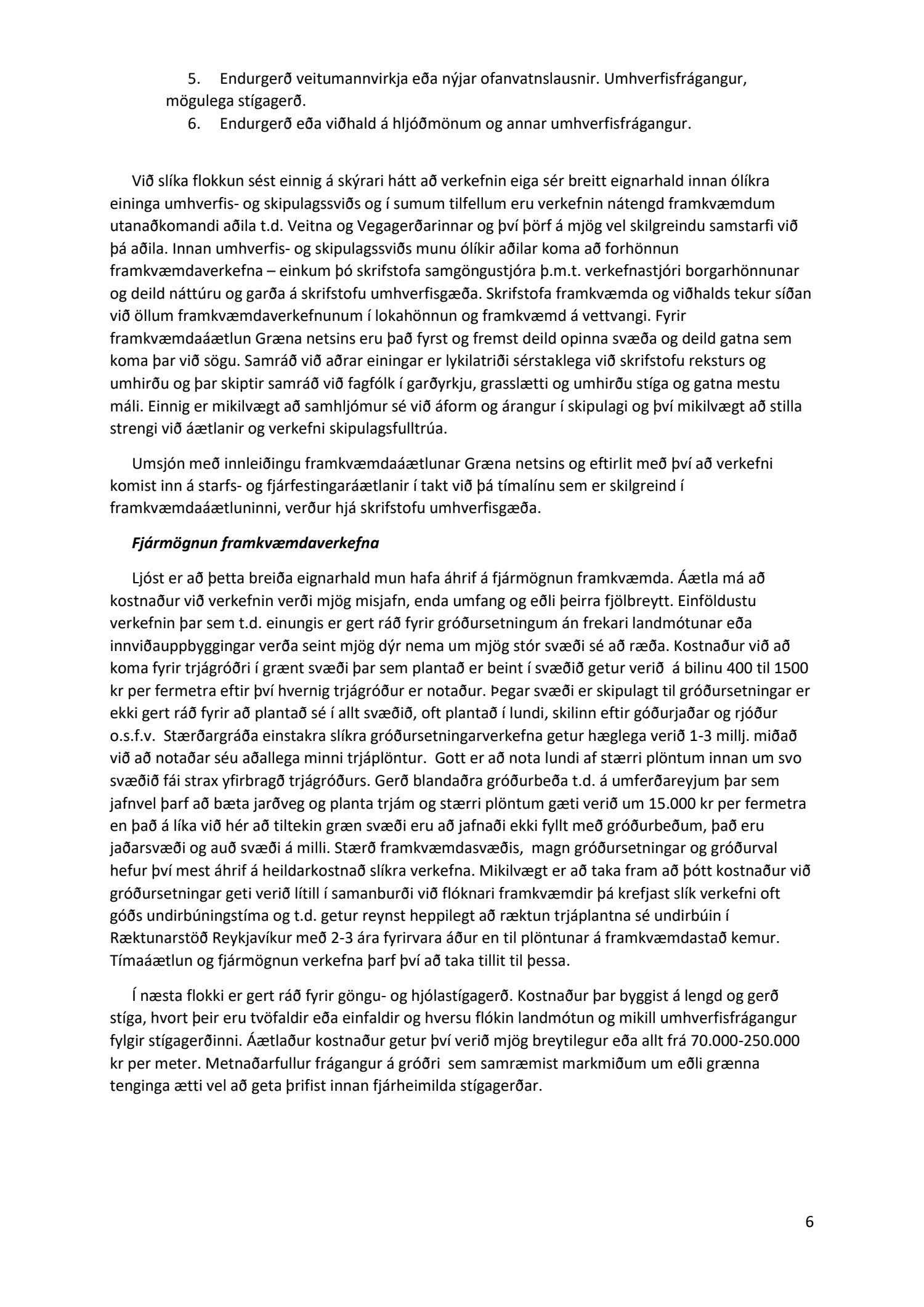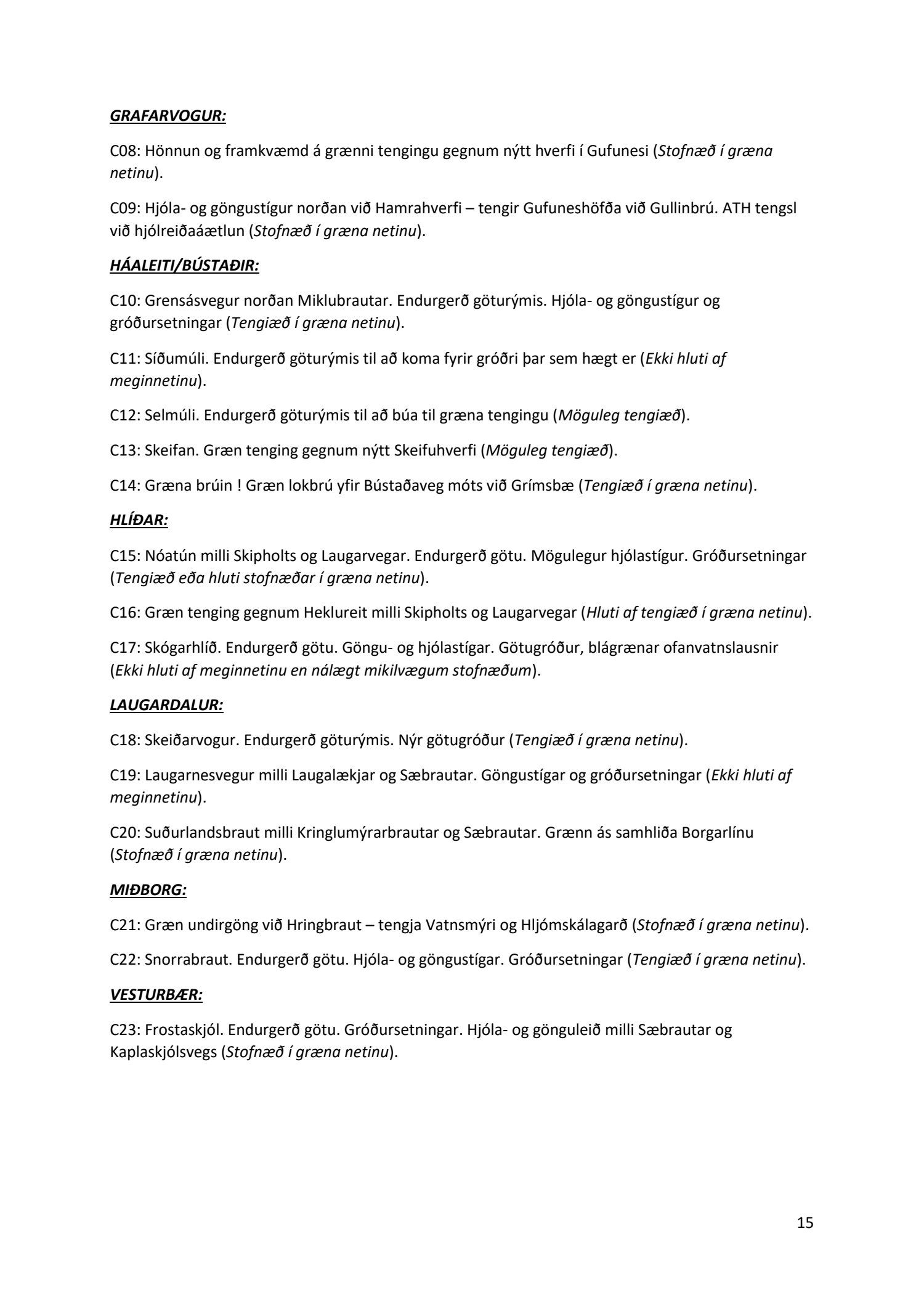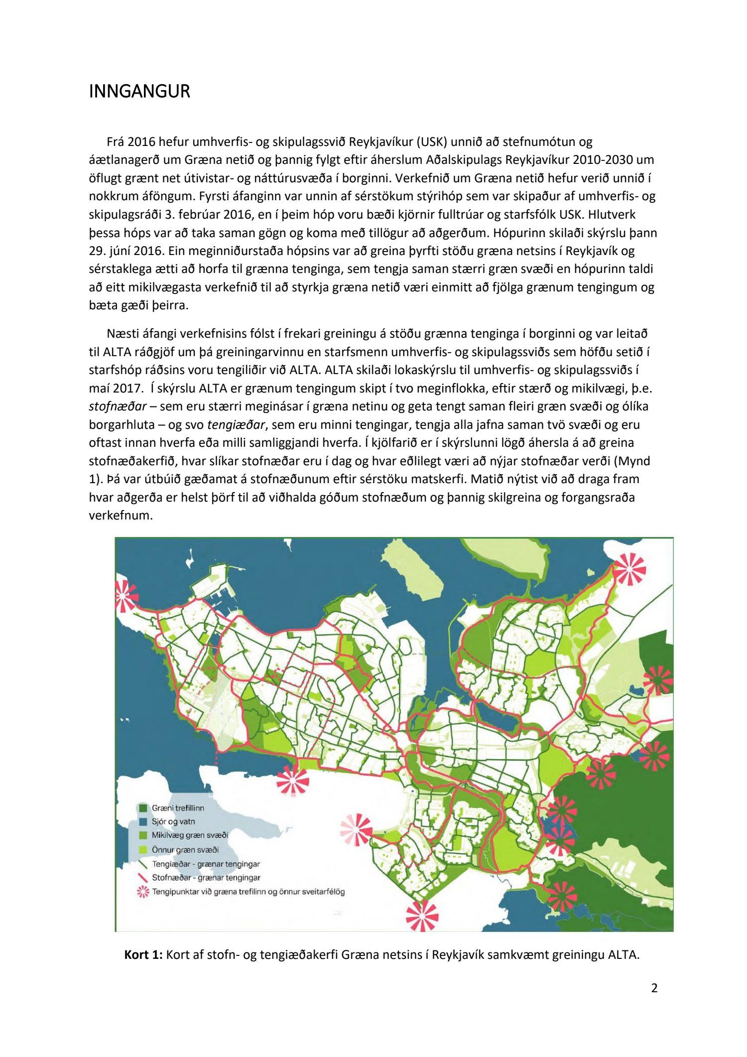 Lykilatriði í innleiðingu stefnu Aðalskipulags Reykjavíkur um hágæða Grænt net, er að farið sé í nauðsynlegar framkvæmdir til að styrkja netið með áherslu á að fjölga og bæta grænar tengingar. Það eru í sjálfu sér ágætis markmið ef ekki er á sama tíma byggt á hverjum einasta græna bletti sem fyrirfinnst í borginni og gengið freklega á náttúruperlur í borgarlandinu með byggingum eins og til stendur að reisa í Elliðaárdalnum. Þær framkvæmdir sem fyrirhugaðar eru þar, sýna svo ekki verður um villst, nauðsyn þess að friðlýsa Elliðaárdalinn. Þá hefur sú þéttingarstefna sem unnið hefur verið eftir á undanförnum árum, þar sem mesta þéttingin á sér stað miðsvæðis, komið niður á opnum grænum svæðum og einna verst vestan Snorrabrautar þar sem fá græn svæði eru eftir til útivistar, eins og Hljómskálagarðurinn og strandlengjan frá Skerjafirði að Ægisíðu. Það verður þó að teljast jákvætt að framkvæmdaáætlun Græna netsins mun fela í sér fjölgun á skilgreindum framkvæmdum á þeim opnu svæðum sem þó eru enn til staðar í borginni. Græna verkefnið felur í sér umhverfisfrágang á 17 nýjum göngu- og hjólastígum. Mikilvægt er að litið verði til umhverfisvænni lausna til að ryðja stígana á veturna, svo sem með upphitun svo ekki þurfi að ryðja, sanda og salta þá.