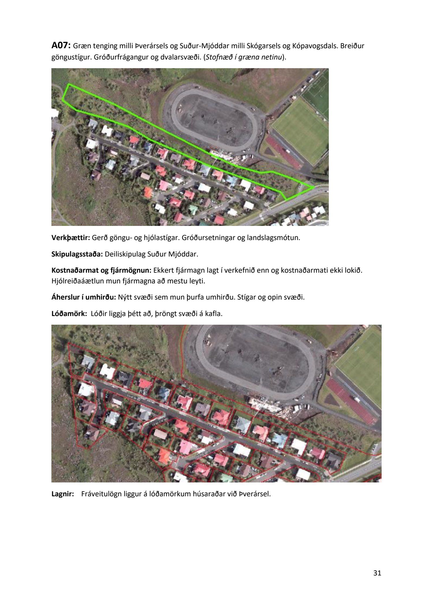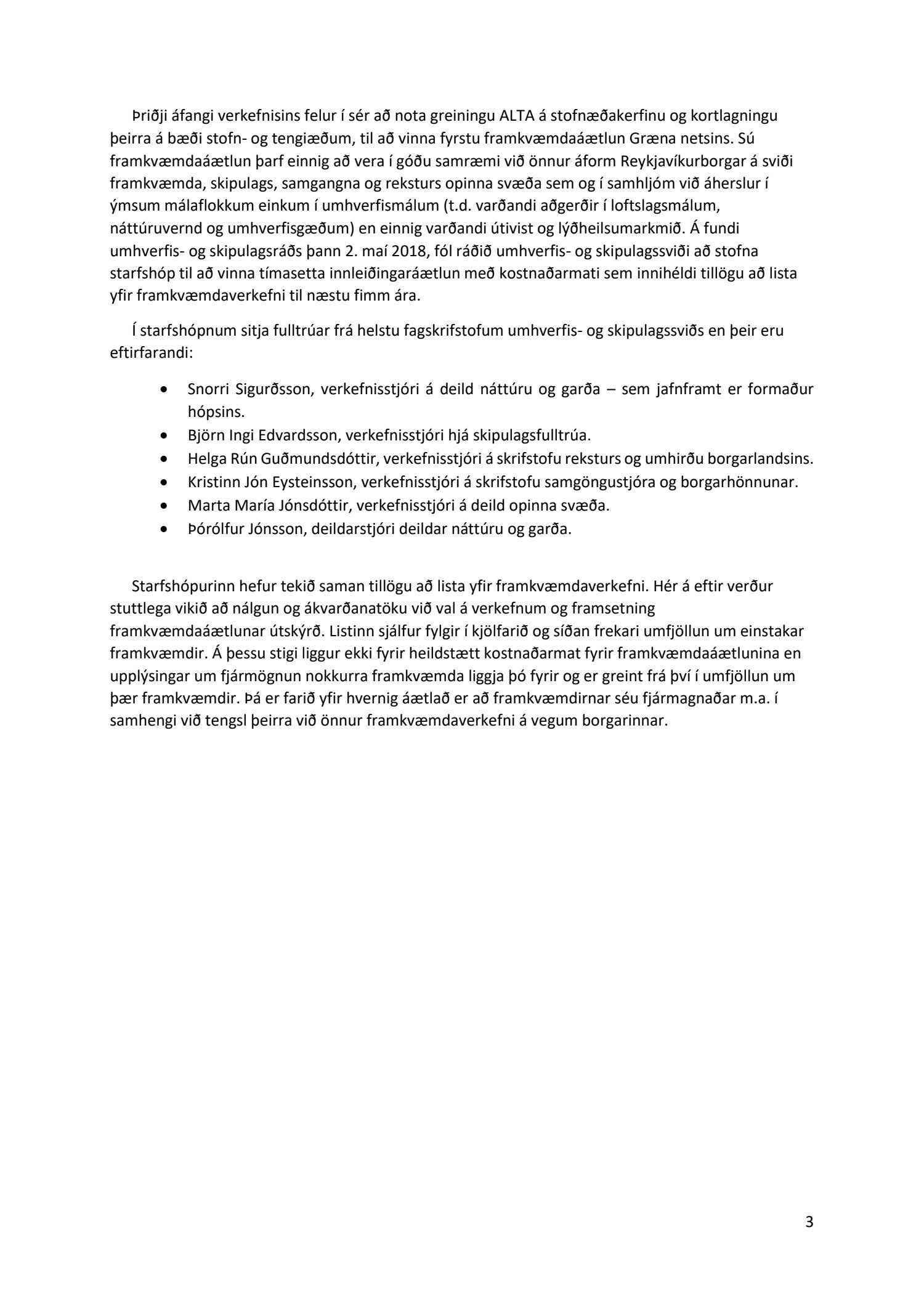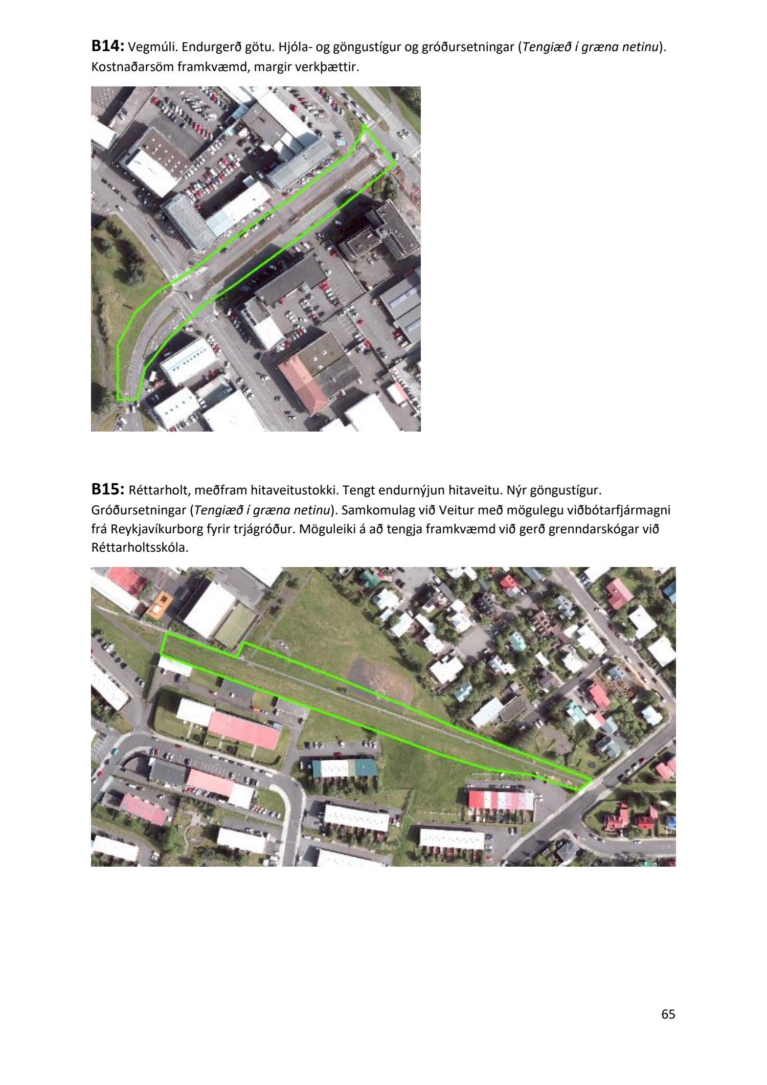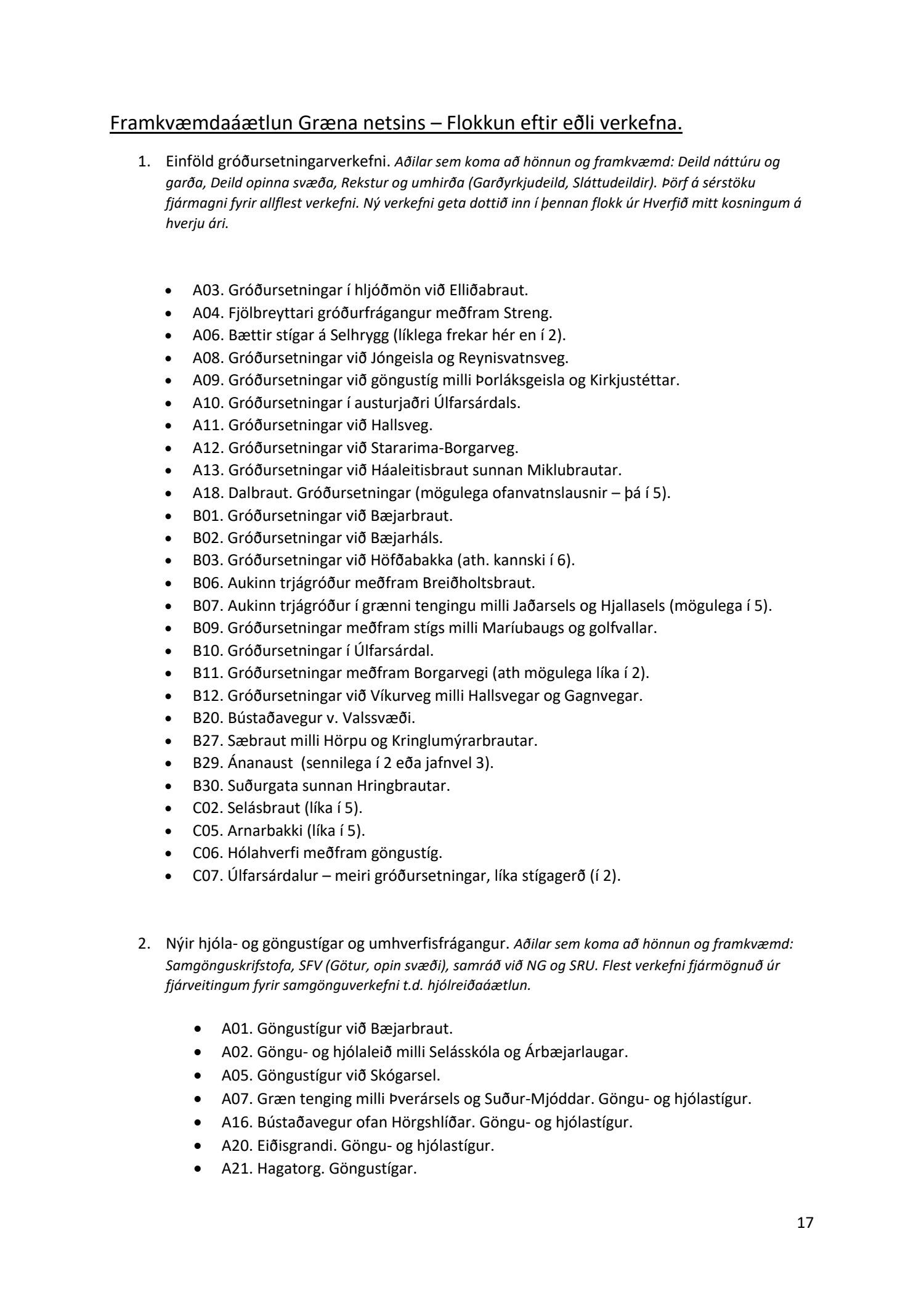 Lykilatriði í innleiðingu stefnu Aðalskipulags Reykjavíkur um hágæða Grænt net, er að farið sé í nauðsynlegar framkvæmdir til að styrkja netið með áherslu á að fjölga og bæta grænar tengingar. Það eru í sjálfu sér ágætis markmið ef ekki er á sama tíma byggt á hverjum einasta græna bletti sem fyrirfinnst í borginni og gengið freklega á náttúruperlur í borgarlandinu með byggingum eins og til stendur að reisa í Elliðaárdalnum. Þær framkvæmdir sem fyrirhugaðar eru þar, sýna svo ekki verður um villst, nauðsyn þess að friðlýsa Elliðaárdalinn. Þá hefur sú þéttingarstefna sem unnið hefur verið eftir á undanförnum árum, þar sem mesta þéttingin á sér stað miðsvæðis, komið niður á opnum grænum svæðum og einna verst vestan Snorrabrautar þar sem fá græn svæði eru eftir til útivistar, eins og Hljómskálagarðurinn og strandlengjan frá Skerjafirði að Ægisíðu. Það verður þó að teljast jákvætt að framkvæmdaáætlun Græna netsins mun fela í sér fjölgun á skilgreindum framkvæmdum á þeim opnu svæðum sem þó eru enn til staðar í borginni. Græna verkefnið felur í sér umhverfisfrágang á 17 nýjum göngu- og hjólastígum. Mikilvægt er að litið verði til umhverfisvænni lausna til að ryðja stígana á veturna, svo sem með upphitun svo ekki þurfi að ryðja, sanda og salta þá.