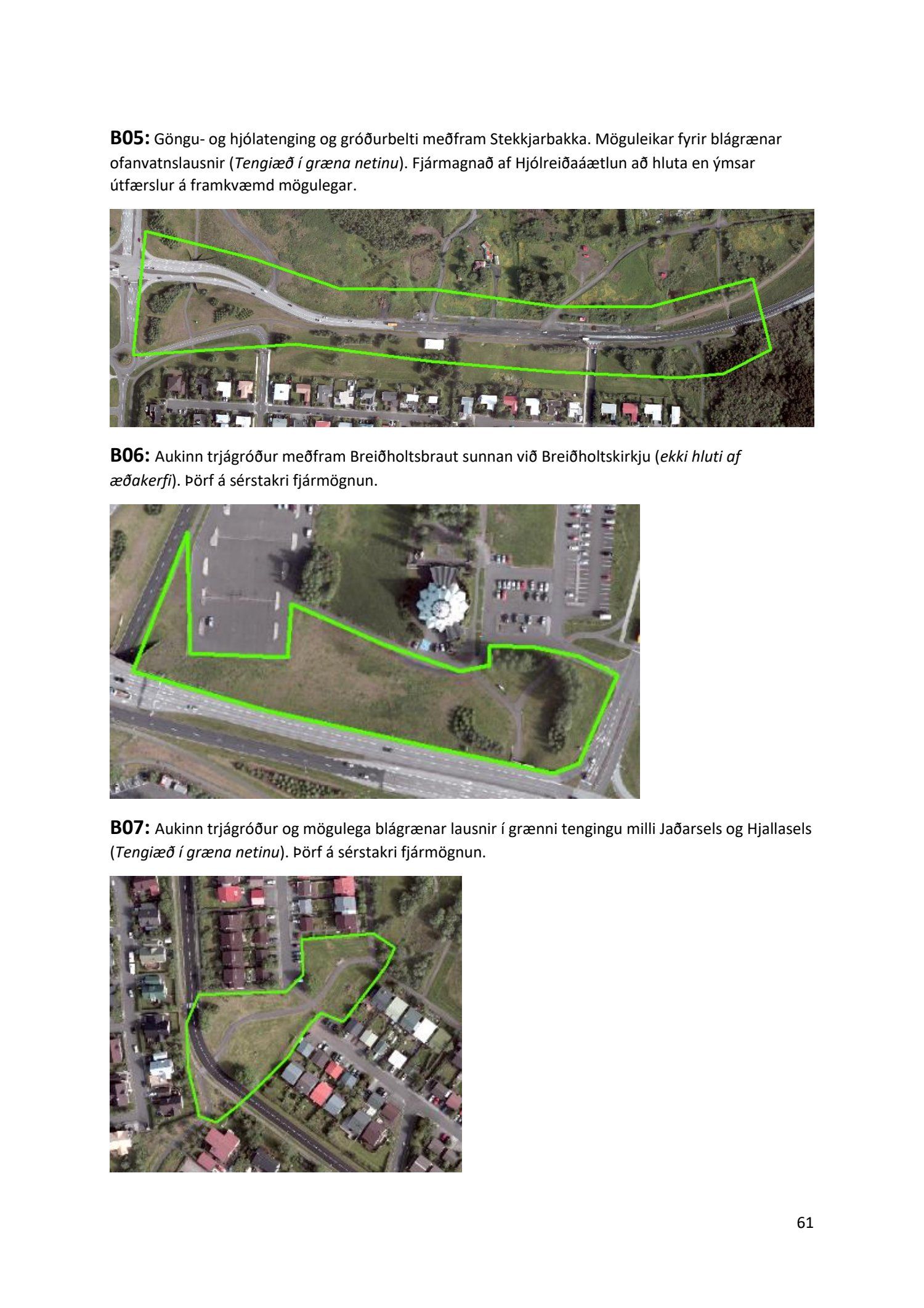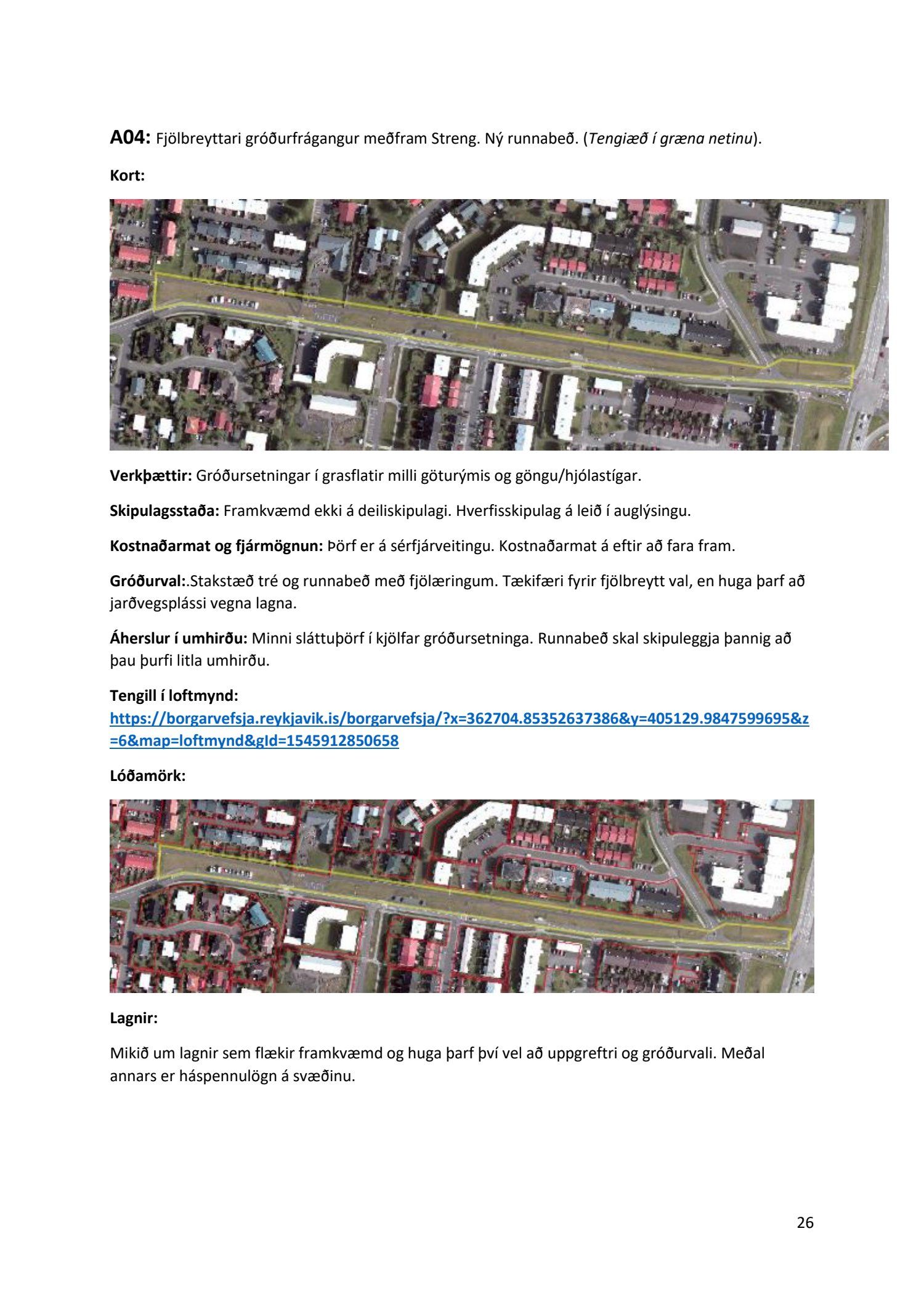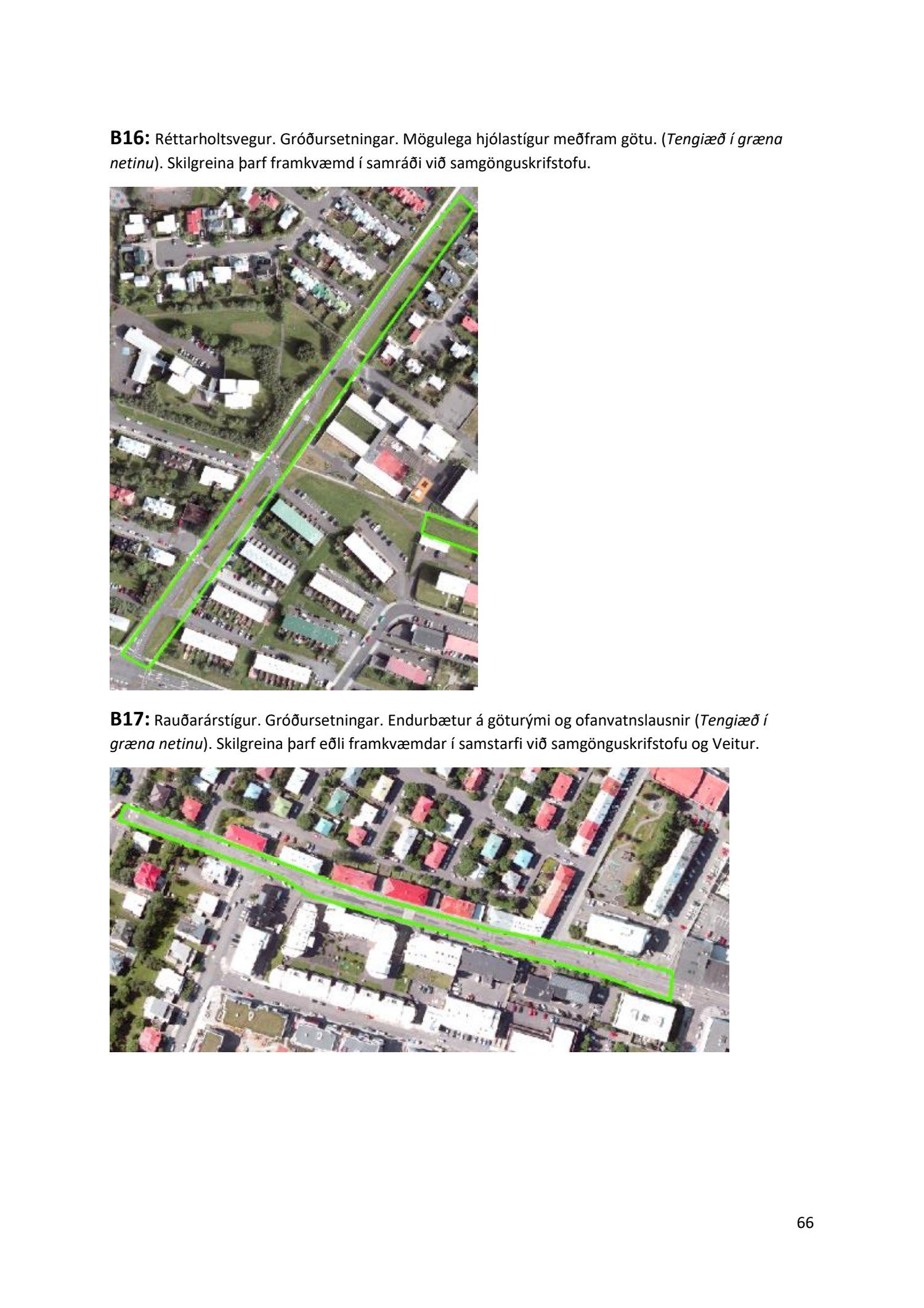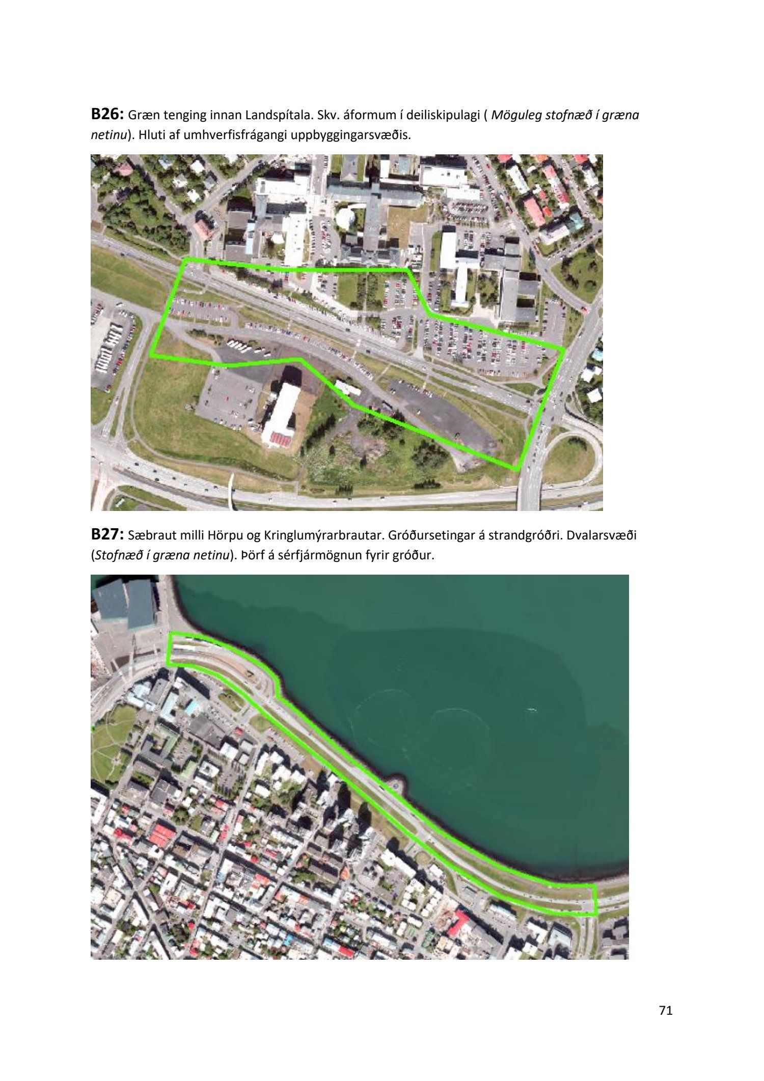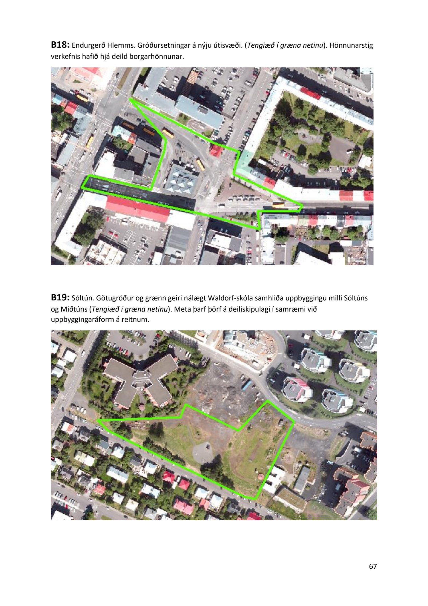 Lykilatriði í innleiðingu stefnu Aðalskipulags Reykjavíkur um hágæða Grænt net, er að farið sé í nauðsynlegar framkvæmdir til að styrkja netið með áherslu á að fjölga og bæta grænar tengingar. Það eru í sjálfu sér ágætis markmið ef ekki er á sama tíma byggt á hverjum einasta græna bletti sem fyrirfinnst í borginni og gengið freklega á náttúruperlur í borgarlandinu með byggingum eins og til stendur að reisa í Elliðaárdalnum. Þær framkvæmdir sem fyrirhugaðar eru þar, sýna svo ekki verður um villst, nauðsyn þess að friðlýsa Elliðaárdalinn. Þá hefur sú þéttingarstefna sem unnið hefur verið eftir á undanförnum árum, þar sem mesta þéttingin á sér stað miðsvæðis, komið niður á opnum grænum svæðum og einna verst vestan Snorrabrautar þar sem fá græn svæði eru eftir til útivistar, eins og Hljómskálagarðurinn og strandlengjan frá Skerjafirði að Ægisíðu. Það verður þó að teljast jákvætt að framkvæmdaáætlun Græna netsins mun fela í sér fjölgun á skilgreindum framkvæmdum á þeim opnu svæðum sem þó eru enn til staðar í borginni. Græna verkefnið felur í sér umhverfisfrágang á 17 nýjum göngu- og hjólastígum. Mikilvægt er að litið verði til umhverfisvænni lausna til að ryðja stígana á veturna, svo sem með upphitun svo ekki þurfi að ryðja, sanda og salta þá.