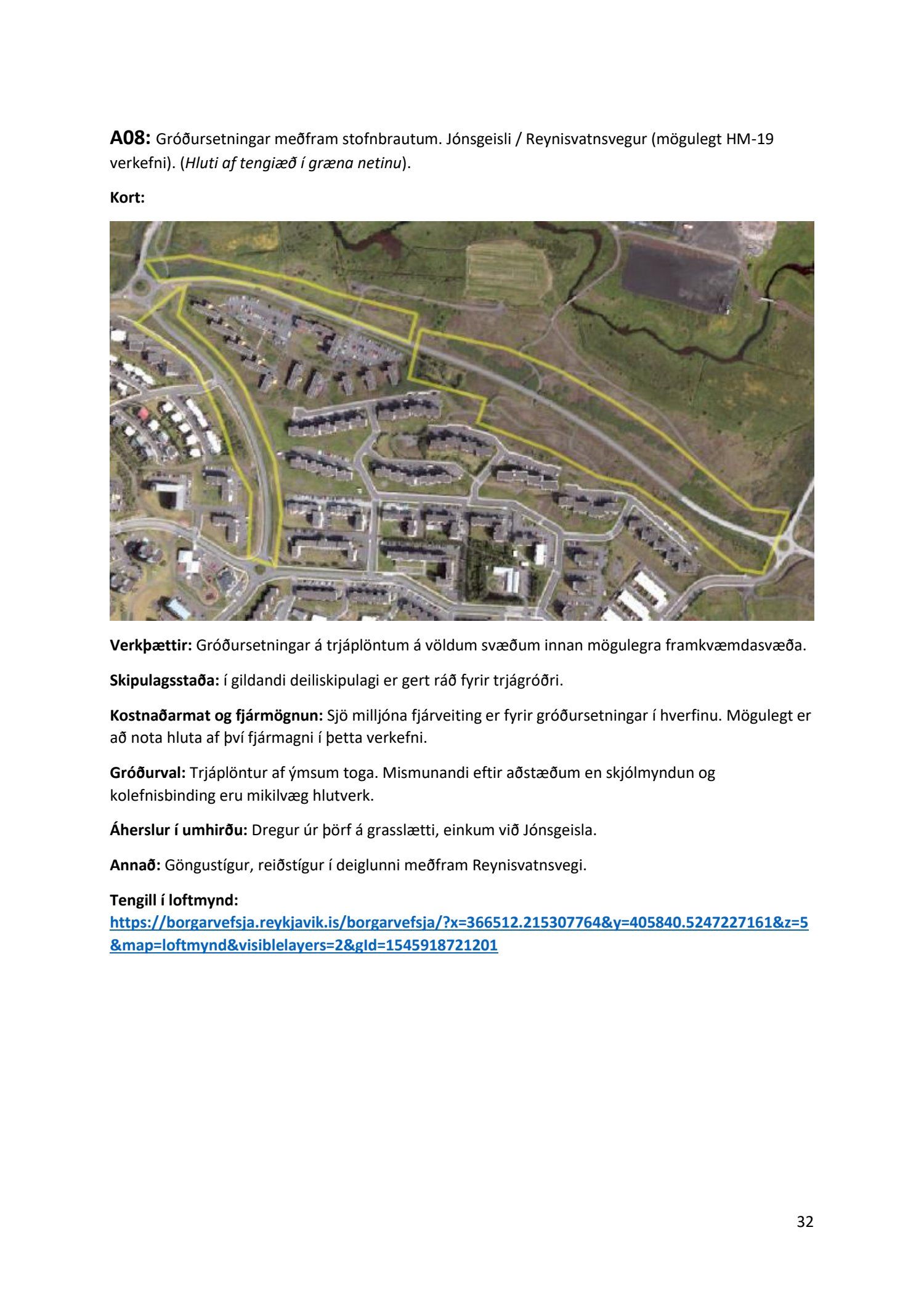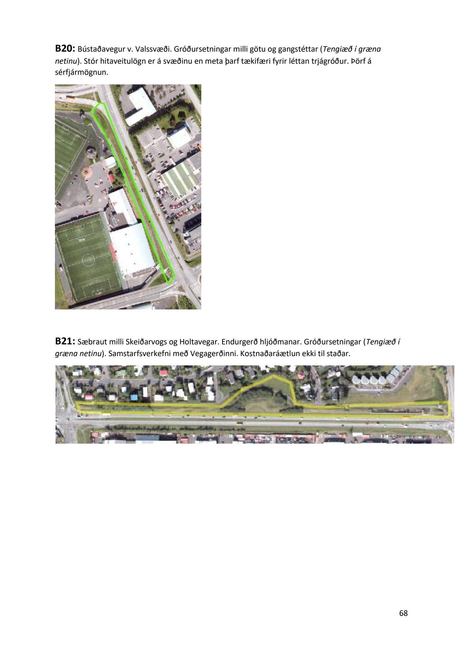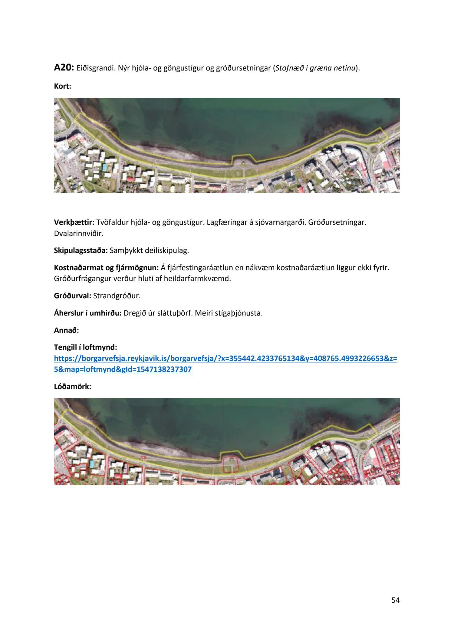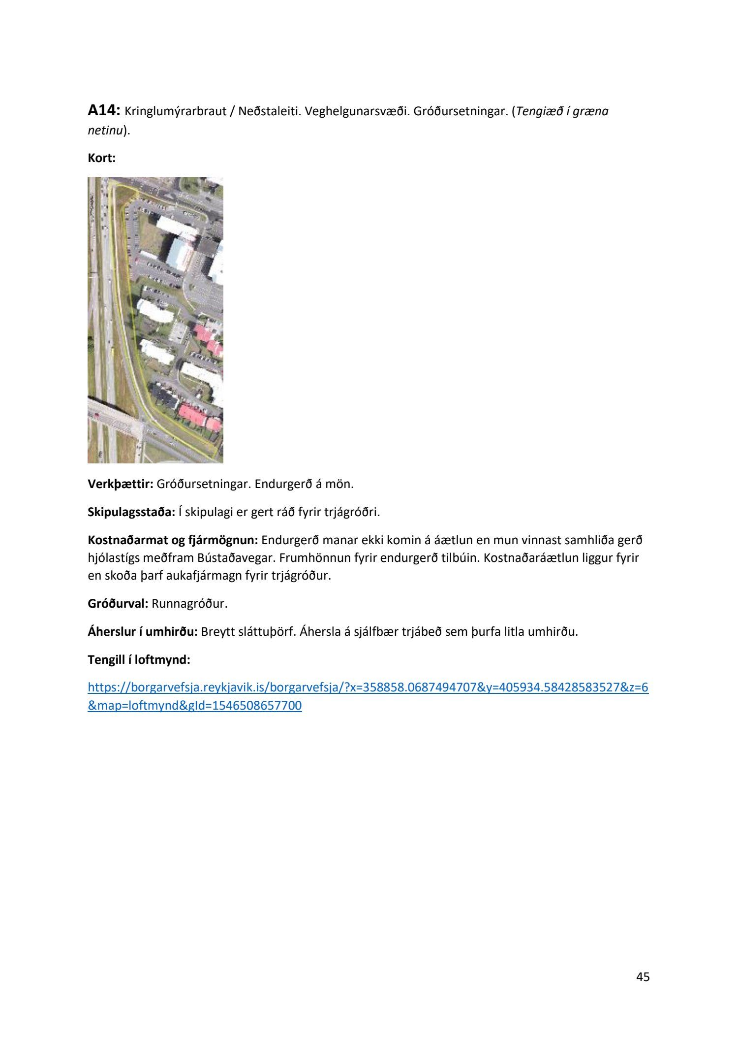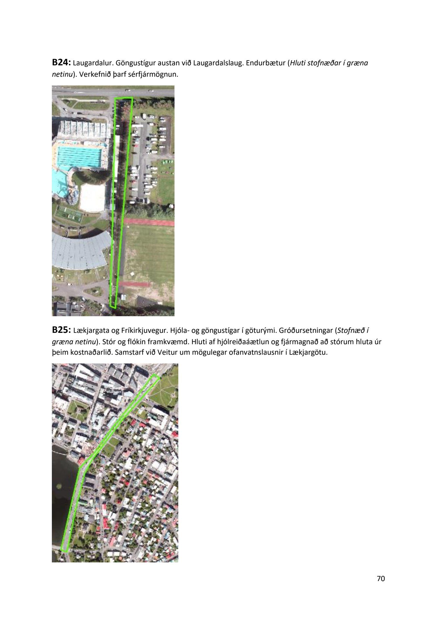 Lykilatriði í innleiðingu stefnu Aðalskipulags Reykjavíkur um hágæða Grænt net, er að farið sé í nauðsynlegar framkvæmdir til að styrkja netið með áherslu á að fjölga og bæta grænar tengingar. Það eru í sjálfu sér ágætis markmið ef ekki er á sama tíma byggt á hverjum einasta græna bletti sem fyrirfinnst í borginni og gengið freklega á náttúruperlur í borgarlandinu með byggingum eins og til stendur að reisa í Elliðaárdalnum. Þær framkvæmdir sem fyrirhugaðar eru þar, sýna svo ekki verður um villst, nauðsyn þess að friðlýsa Elliðaárdalinn. Þá hefur sú þéttingarstefna sem unnið hefur verið eftir á undanförnum árum, þar sem mesta þéttingin á sér stað miðsvæðis, komið niður á opnum grænum svæðum og einna verst vestan Snorrabrautar þar sem fá græn svæði eru eftir til útivistar, eins og Hljómskálagarðurinn og strandlengjan frá Skerjafirði að Ægisíðu. Það verður þó að teljast jákvætt að framkvæmdaáætlun Græna netsins mun fela í sér fjölgun á skilgreindum framkvæmdum á þeim opnu svæðum sem þó eru enn til staðar í borginni. Græna verkefnið felur í sér umhverfisfrágang á 17 nýjum göngu- og hjólastígum. Mikilvægt er að litið verði til umhverfisvænni lausna til að ryðja stígana á veturna, svo sem með upphitun svo ekki þurfi að ryðja, sanda og salta þá.