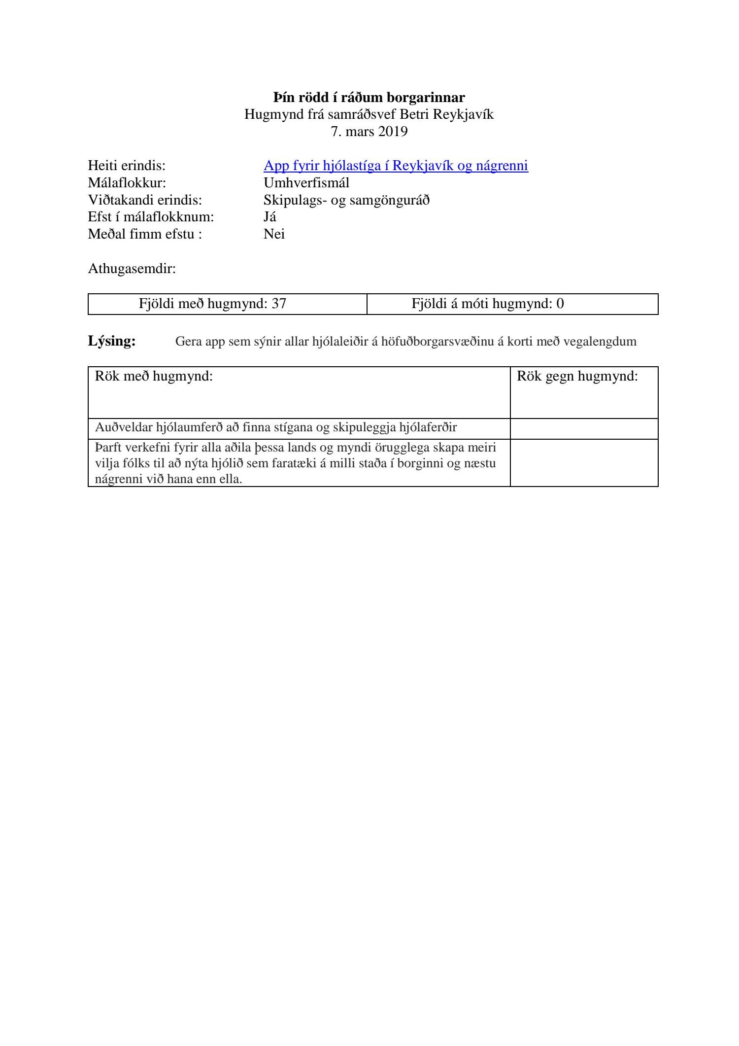 Lagt er fram erindið "App fyrir hjólastíga í Reykjavík og nágrenni" sem tekið var af samráðsvefnum Betri Reykjavík þann 5. mars 2019. Erindið var efst í málaflokknum umhverfismál.